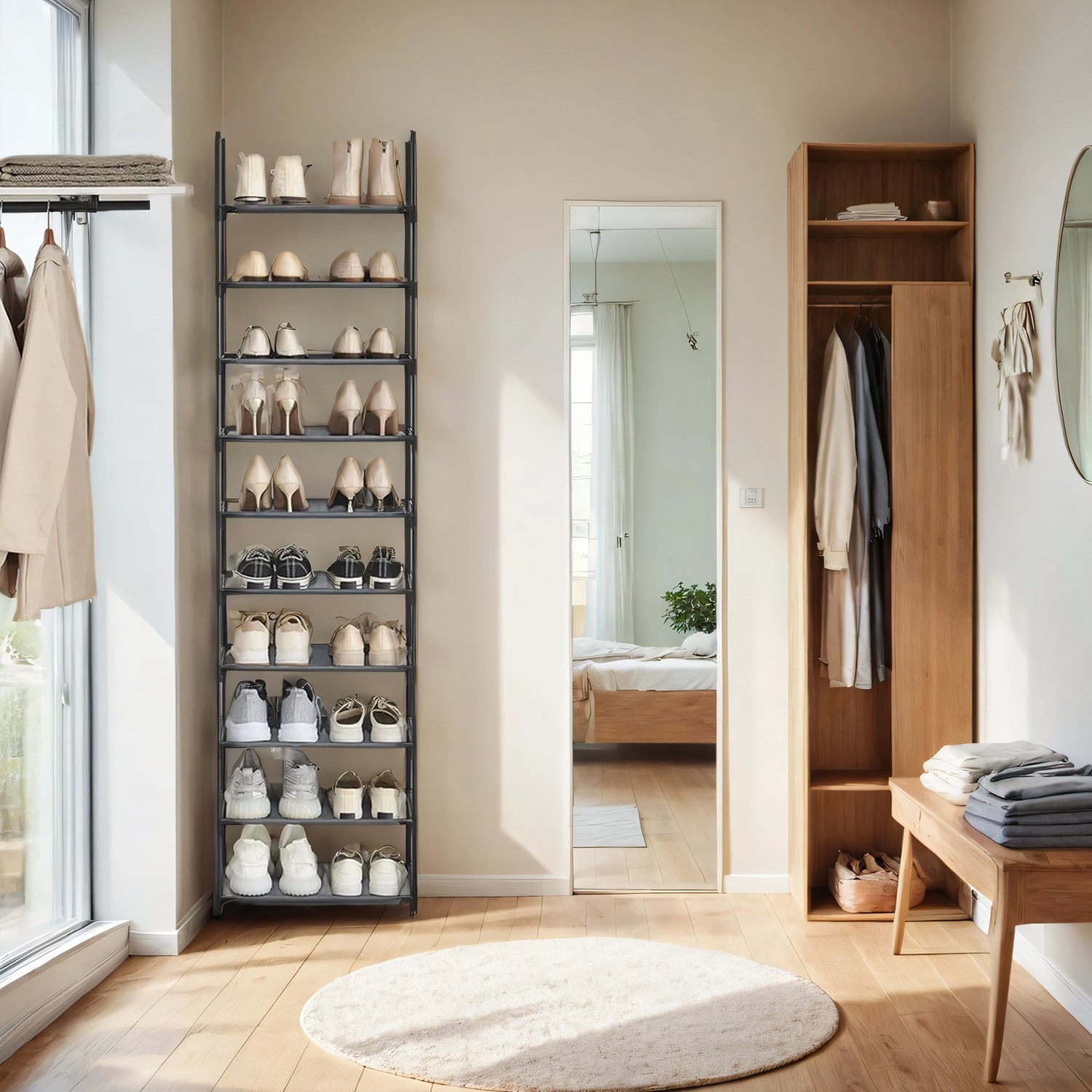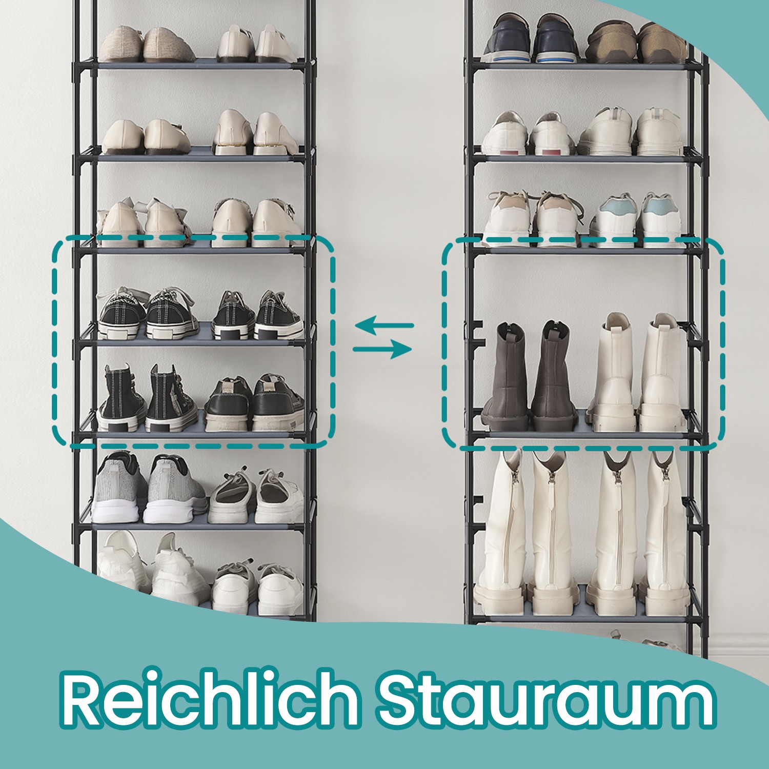 SONGMICS shoe rack, shoe storage, 10 levels, open shoe cabinet, shoe storage, narrow, 45 x 28 x 173 cm, metal frame, non-woven fabric shelves, for hallway, bedroom, black LSH010B02