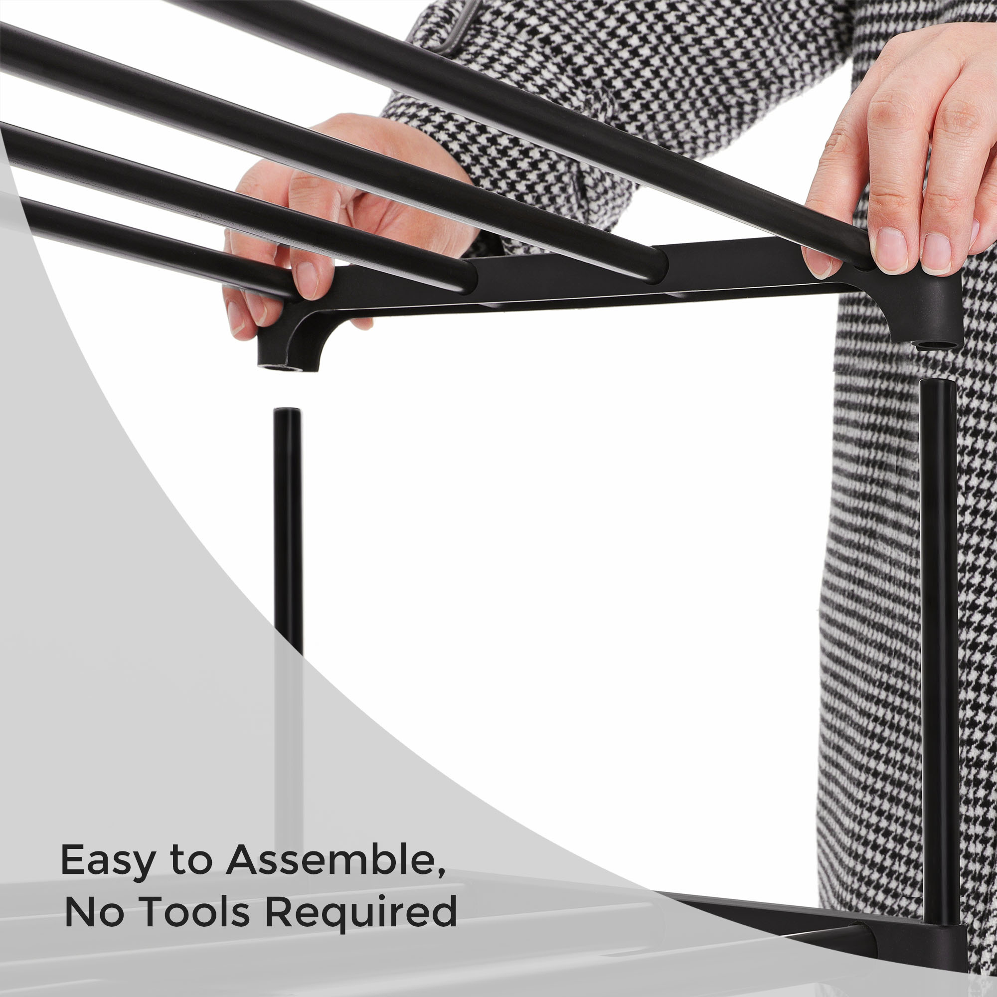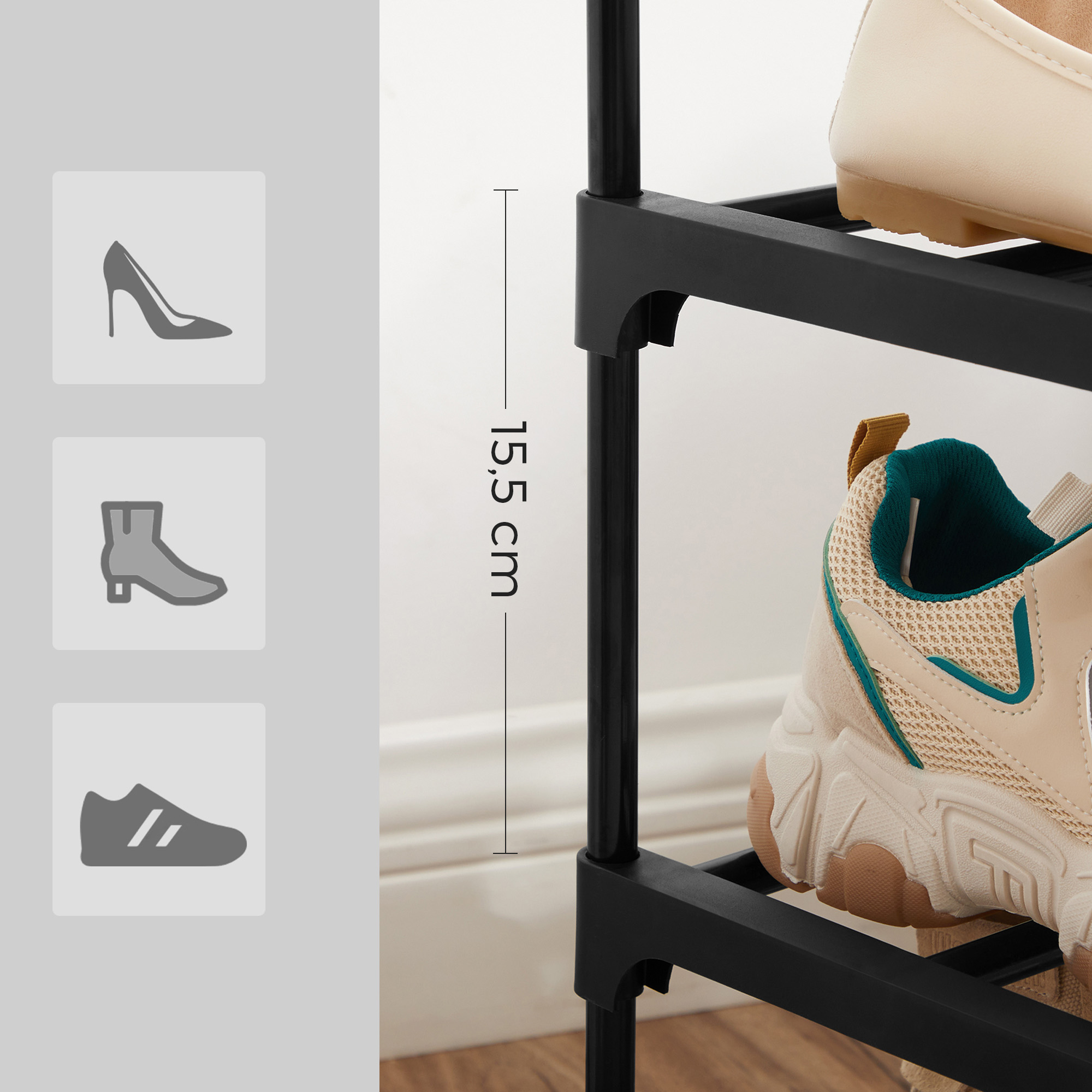 Do you waste time searching for the right shoes in a large, messy pile of shoes? Do you hop around on one leg looking for your second shoe before leaving the house? This 3-tier shoe rack is the help you’re looking for! Save your shoes from the mess and give them a practical storage space. Here are the advantages of this metal shoe rack: High quality: The metal frame and high-quality plastic connectors give this shoe storage unit a sturdy, stable structure (each shelf can hold up to 5 kg). Large storage space: You can maximize your space by storing your sneakers and boots on this shoe rack. It holds about 12–15 pairs of shoes and takes up very little floor space. Simplicity: With its straightforward design, this shoe rack fits perfectly into your space. Plus, the stackable design and easy assembly save you time and effort. Product details: – Color: Black – Material: Metal tubes, plastic connectors – Size: 92 x 30.5 x 55 cm (L x W x H) – Weight: 1.6 kg – Max. static load capacity per level: 5 kg Scope of delivery: – 1 x shoe rack – 1 x instructions SONGMICS notes: – For safety reasons, children are not allowed to climb on or play with the product.- Do not adjust the rack when it is fully loaded. – Please do not expose the product to direct sunlight for long periods of time. – Do not soak the product for daily cleaning. If there are stains, wipe the product with a damp cloth. – Ensure that all tubes are fully inserted into the plastic connectors after assembly and before use.