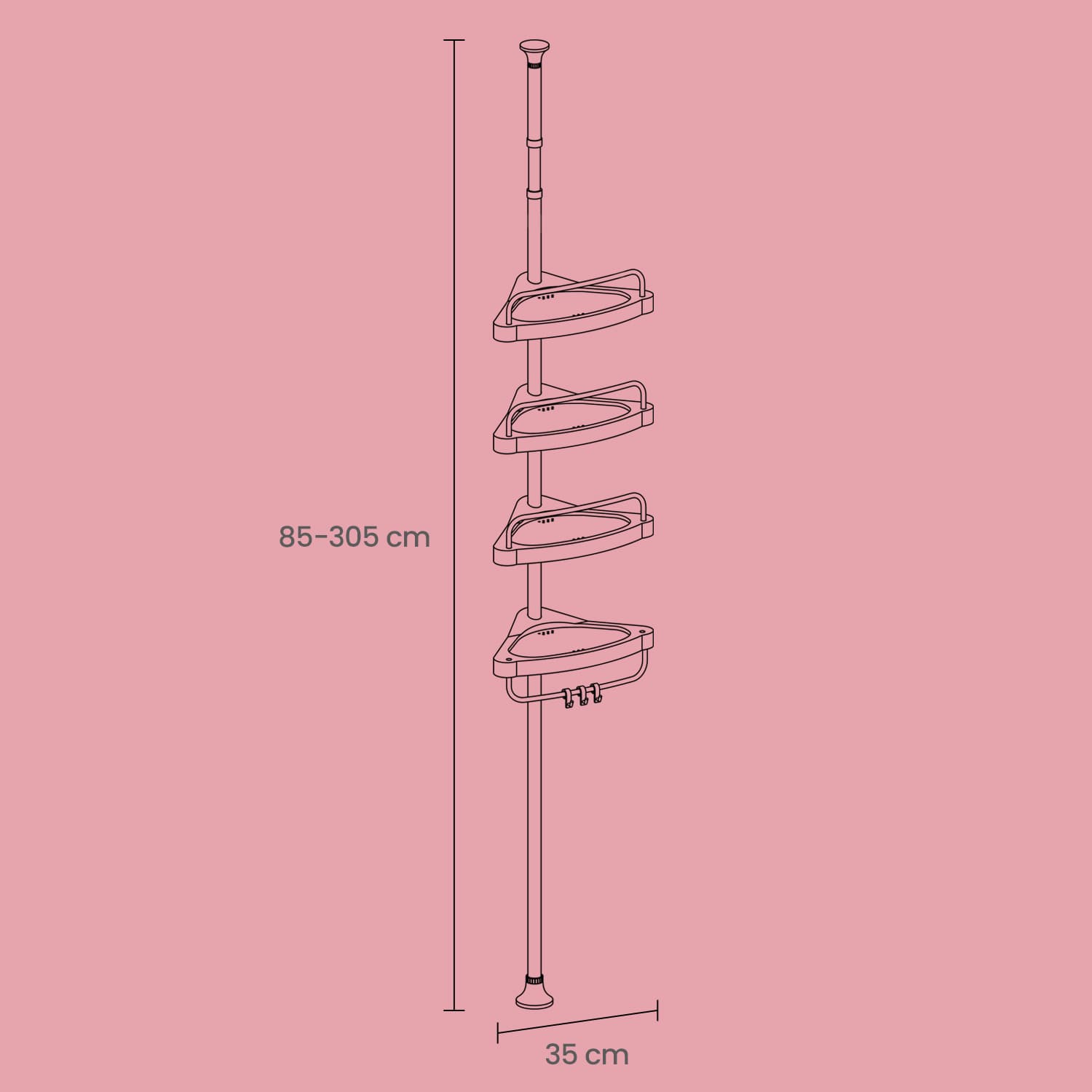 Description: Are you looking for a way to finally clear the edge of your bathtub of shower accessories? And do you want to avoid drilling? Then the Songmics telescopic bathroom shelf is ideal for you! Thanks to its telescopic mounting, it can be easily and securely clamped between the floor and ceiling. And the height is adjustable up to 3.05 m. Unlike the old version, the end pieces have a wider cross-section. No need to worry about the shelf and its contents falling over. The shelves are also larger than the old version, and one of them has hooks so you can hang towels. Installation is quick and easy with the illustrated instructions. The rods are powder-coated, providing lasting protection for the metal underneath. The steel tubes are therefore rust and corrosion resistant. You can use the shelf in your bathroom without worrying about moisture. Product details: – Material: Powder-coated steel tube + PP – Height adjustable: between 85-305 cm – Shelf dimensions: 25, 25, 35 cm (side length of the triangle) – Weight: 1.6 kg – Load capacity: max. 3 kg/shelf Scope of delivery: – 1 x telescopic bathroom shelf – 1 x instructions (DE, EN, FR, IT, ES)
