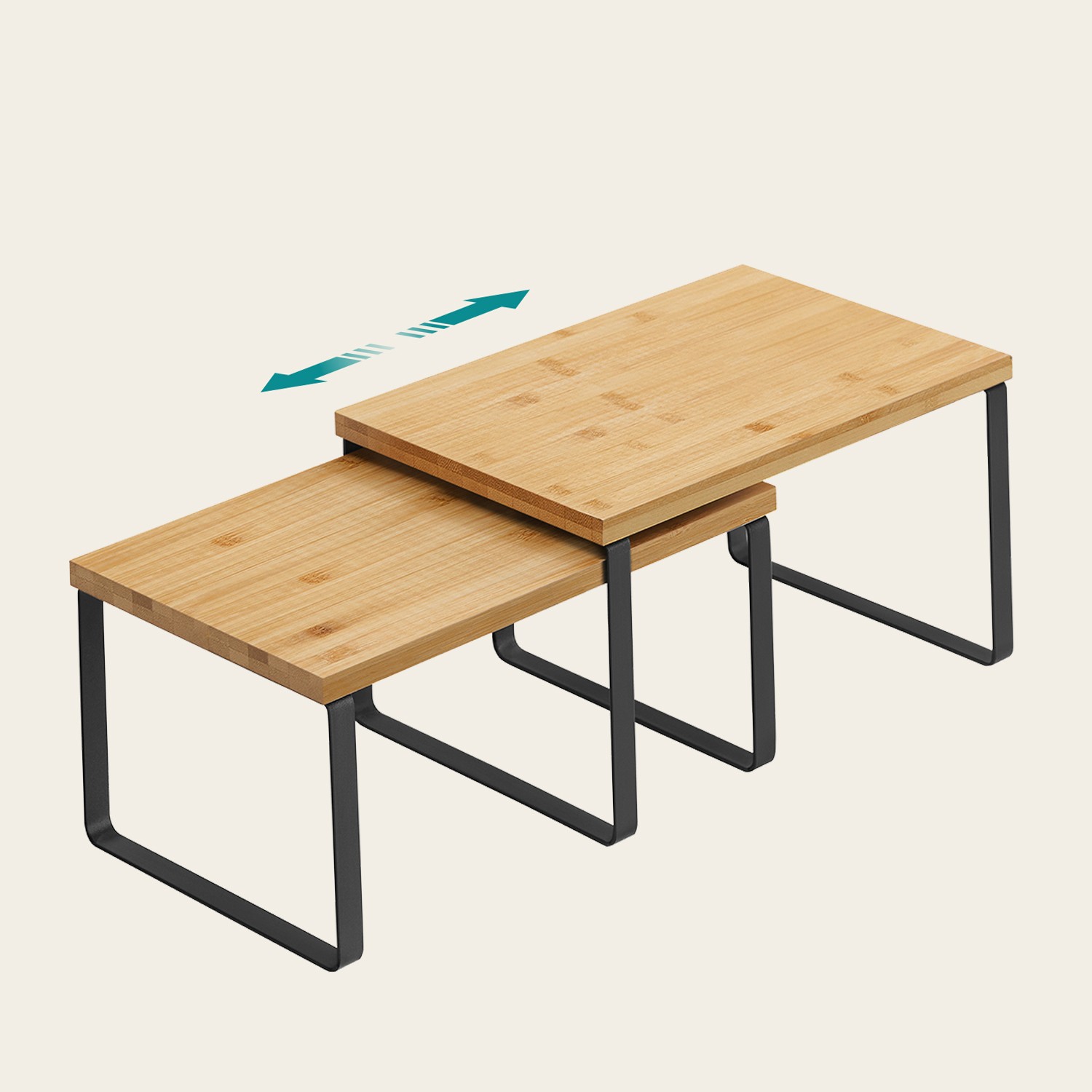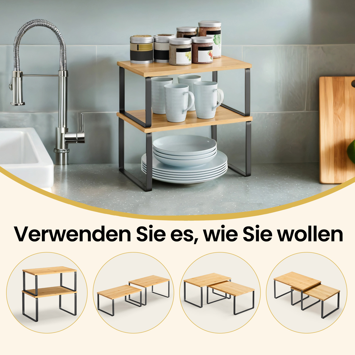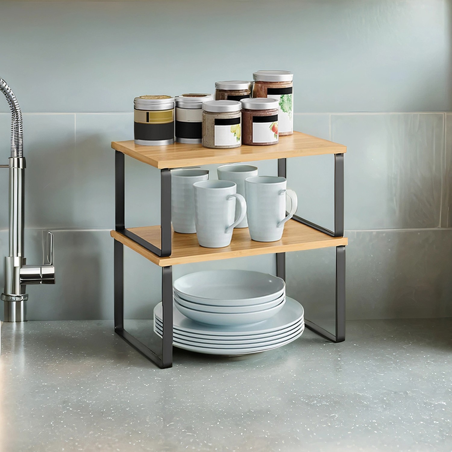 In the kitchen: Place the shelves in the cupboard or on the kitchen countertop to create more storage space and more storage options for spice jars, glasses, bowls, and more. You can never have too many storage shelves in the kitchen, right? But 2 are enough. In the living room: Create a tidy tea station with these shelves – tea cups at the bottom and teapot at the top. There’s room for all your tea utensils here. In the office: Stack the shelves on top of each other on your desk to expand your storage space upwards. Organize your mug, stapler, paper clips, and other everyday office supplies on different levels to work at a tidy desk. What do you plan to do with this kitchen shelf set? Product details: Color: Black-natural colors Material: Bamboo, metal Size of large shelf: 29.7 x 19.5 x 15.5 cm (L x W x H) Size of small shelf: 29.7 x 18.5 x 13.6 cm (L x W x H) Weight: 1.3 kg Max. static load capacity per shelf: 15 kg Scope of delivery: 2 x spice rack 1 x accessory pack 1 x instructions SONGMICS Notes: Please follow the instructions for stacking.Avoid long-term use in damp environments.