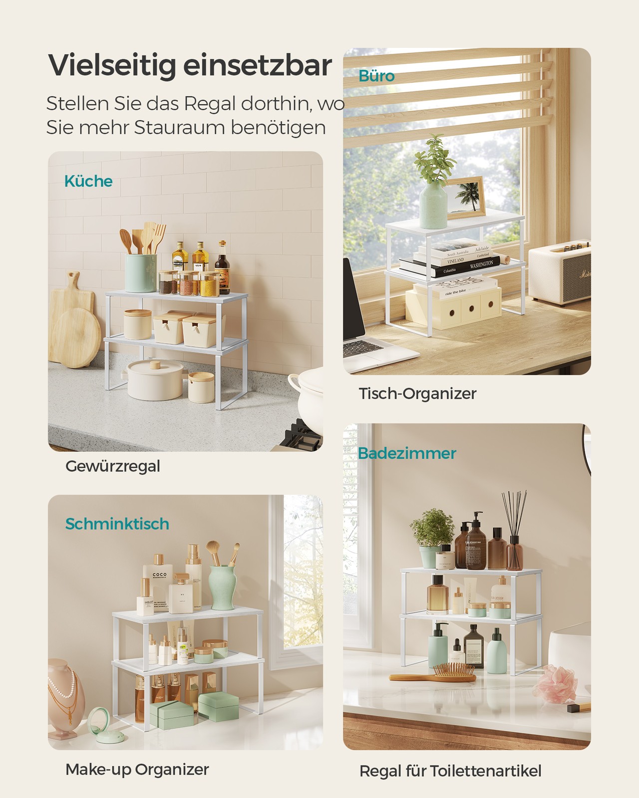SONGMICS spice rack, set of 4 kitchen organizers, kitchen shelf, cabinet organizer for kitchen, expandable, small shelf, stackable, metal and wood-based material