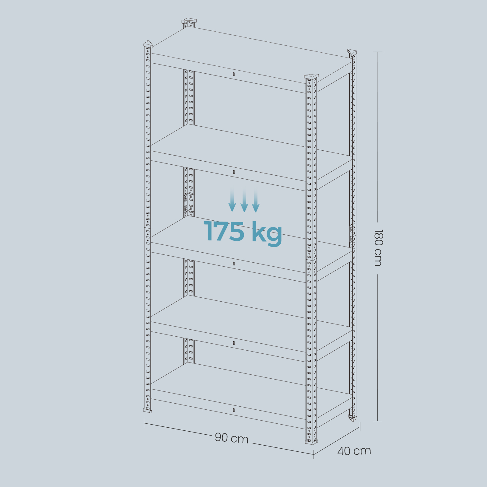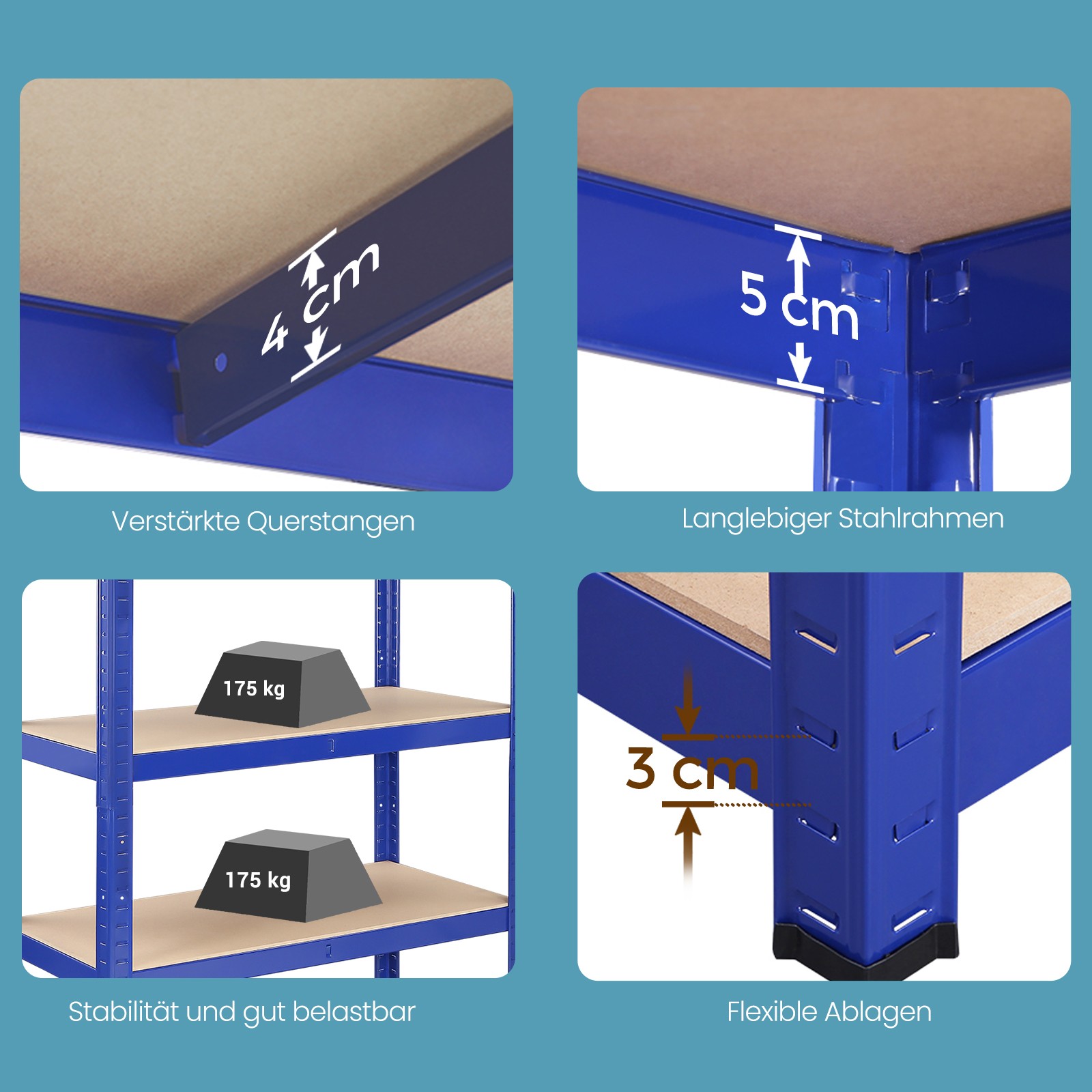 Are garden tools and various utensils scattered around your garage? Do you find it difficult to find the items you need? Then it’s high time to equip your garage with this storage rack and get the chaos under control. Top reasons why this shelving system from SONGMICS is just right for you: The steel frame and wood-based shelves provide a strong hold.The reinforcements on the legs and the crossbars under each shelf level increase stability. The powder coating is rust-resistant and wear-resistant. Each shelf can hold weights of up to 130 kg.The distance between the individual shelves is flexibly adjustable. You can also divide the shelf into two parts. The included anti-tip device ensures safe use. The shelf is suitable for basements, laundry rooms, workshops, and business premises. Product details: Color: Blue Material: Powder-coated steel, E1-class MDF (medium-density fiberboard) Size: 160 x 80 x 40 cm (H x L x W) Weight: 10.2 kg Max. static load capacity per shelf: 130 kg Scope of delivery: 1 x storage shelf 1 x anti-tip device 1 x instructions (DE, EN, FR, ES, IT) SONGMICS Notes:Always wear gloves when assembling. Please do not place the product in a damp environment. The max. load capacity in the text refers to the maximum static weight.