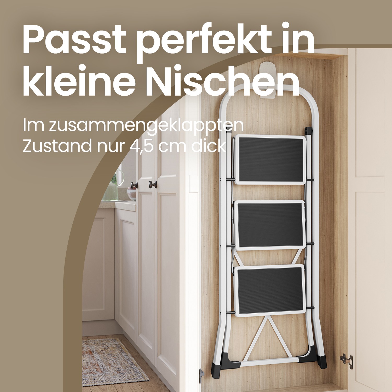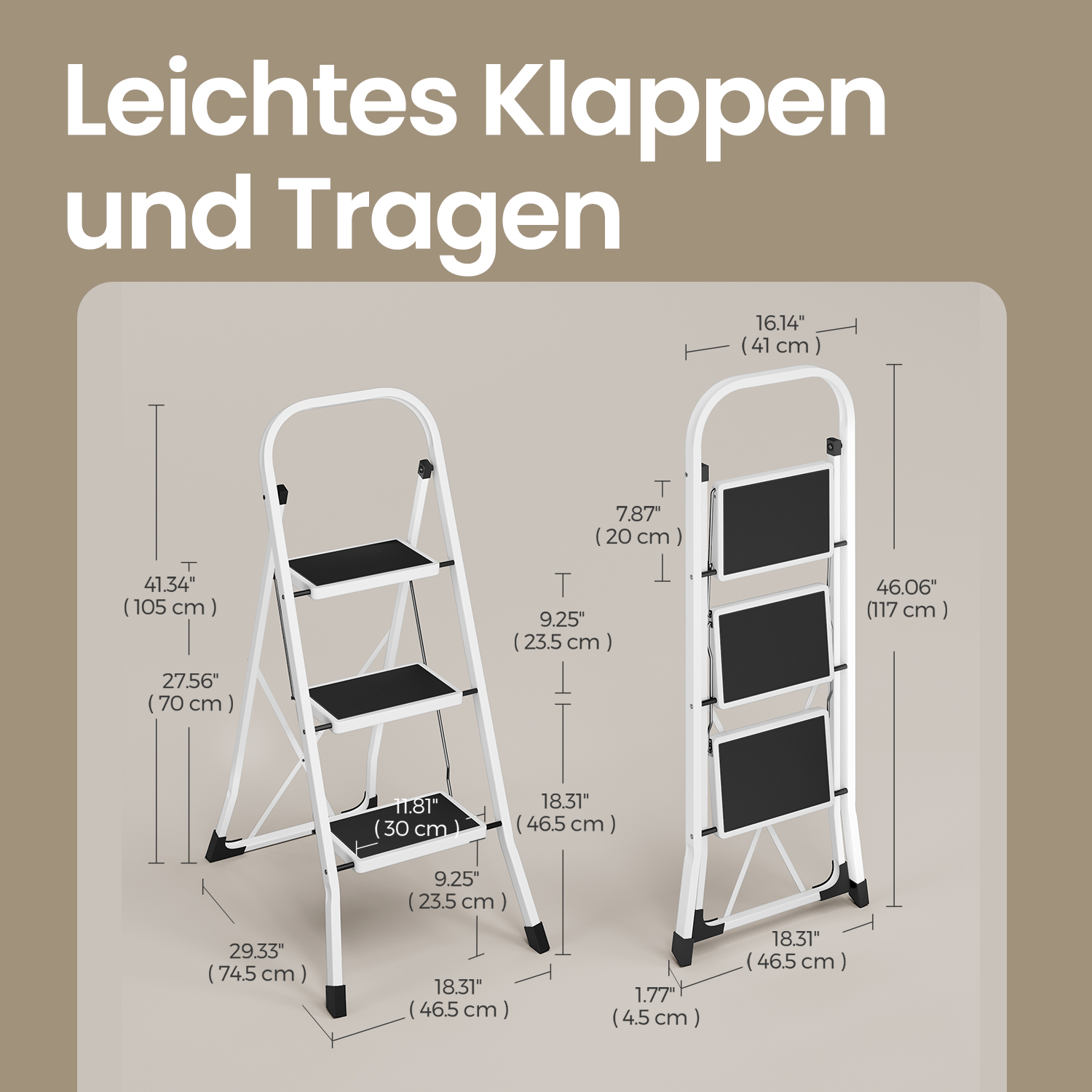This practical folding step ladder made of sturdy metal from Songmics is a useful everyday helper for your household when you need to reach higher places or cabinet doors at home. With its foldable design, the ladder can be easily stored anywhere to save space and quickly retrieved when needed. Product details:- Color: white – Material: steel – Load capacity: 150 kg – Product dimensions when folded: 46.5 x 117 x 4.5 cm (W x H x D) – Weight: 5.5 kg Scope of delivery: – 1 x step ladder – 1 x instructions
