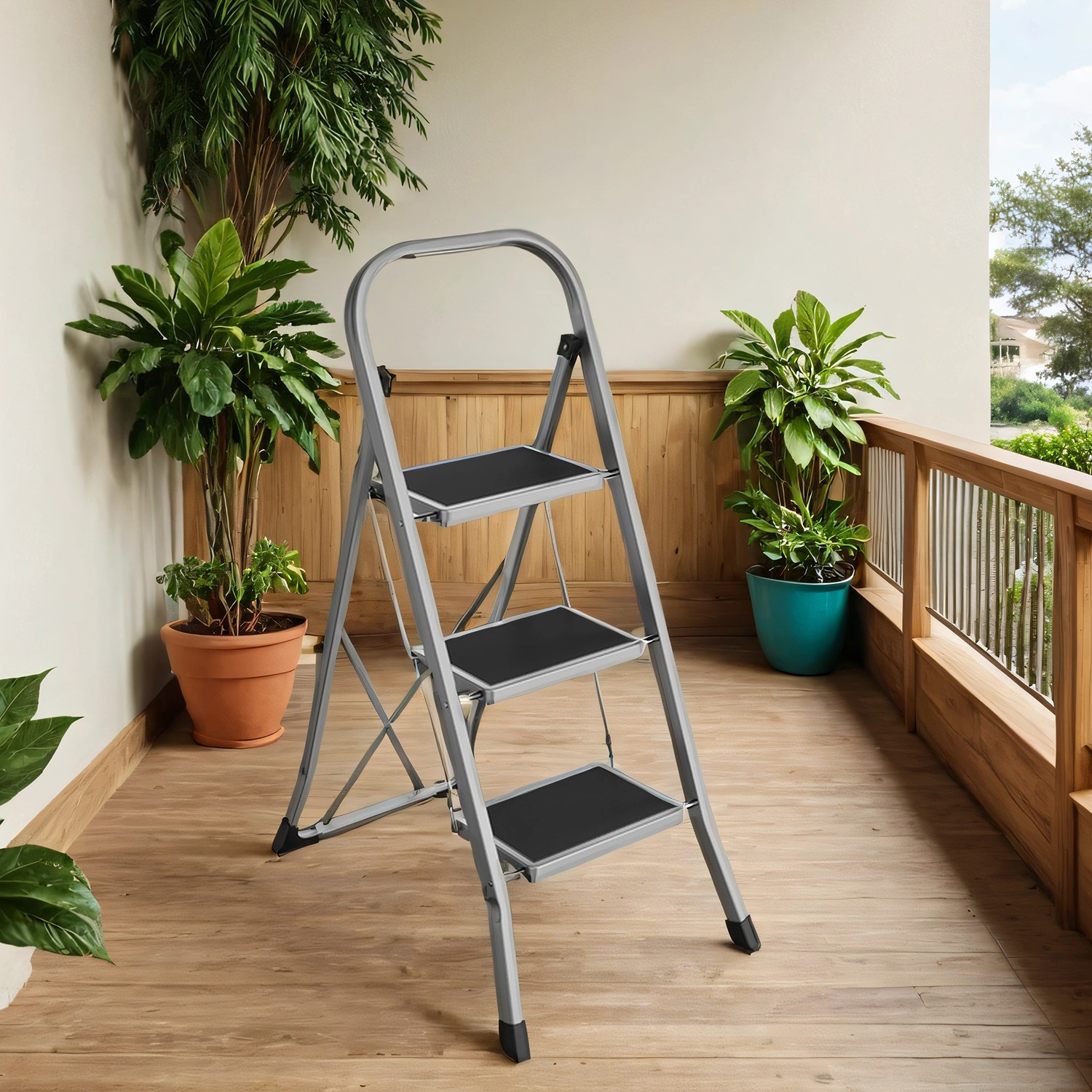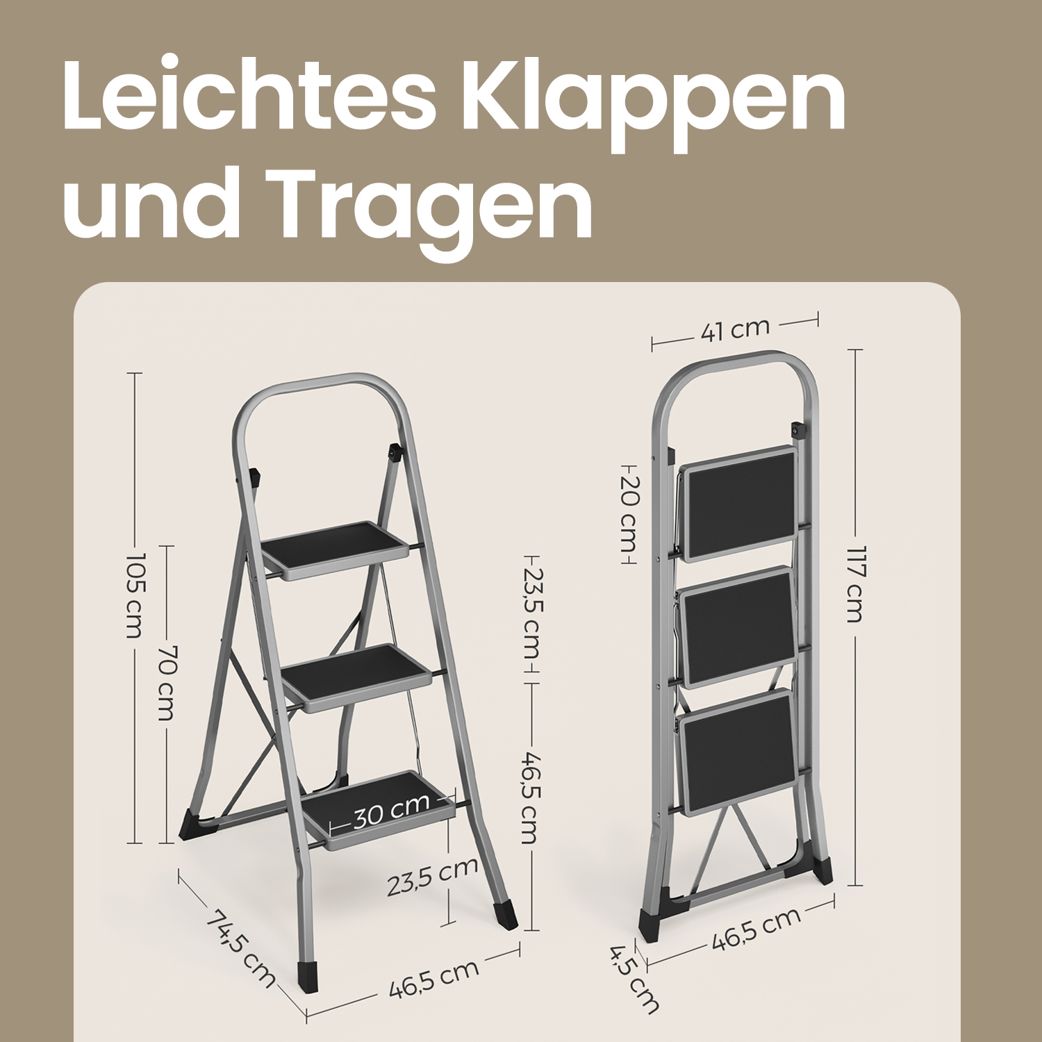 High stability and safety A ladder should give you a feeling of safety. That’s why we offer this sturdy stepladder. It is made of high-quality steel and can bear loads of up to 150 kg. In addition, the 20 cm wide steps with non-slip rubber mats and the anti-slip feet with rubber coating ensure greater stability. Want even more safety? Hold on to the practical handrail! A safe working environment ensures that you can always concentrate. Thought out down to the smallest detail When folded, the folding ladder measures only 46.5 x 4.5 x 117 cm and therefore fits perfectly in a corner of your garage or in the trunk of your car. It also weighs only 5.5 kg and is equipped with a carrying handle, so you can easily transport the ladder from the basement to the garden to prune branches. In addition, the ladder has no sharp edges and features rounded corners and rubber caps, ensuring safe use. Product details: – Color: Gray-black – Material: Steel – Size when folded: 46.5 x 4.5 x 117 cm (L x W x H) – Size when unfolded: 46.5 x 74.5 x 105 cm (L x W x H) – Step size: 30 x 20 cm – Weight: 5.5 kg – Max. static load capacity: 150 kg Scope of delivery:- 1 x stepladder with 3 steps – 1 x instructions SONGIMC notes: – Please be careful when folding the ladder to avoid trapping your fingers. – Please use the product on a level surface. – Please do not use the ladder if there is oil or water on the floor. – Before using the ladder, make sure that the safety device has locked automatically.
