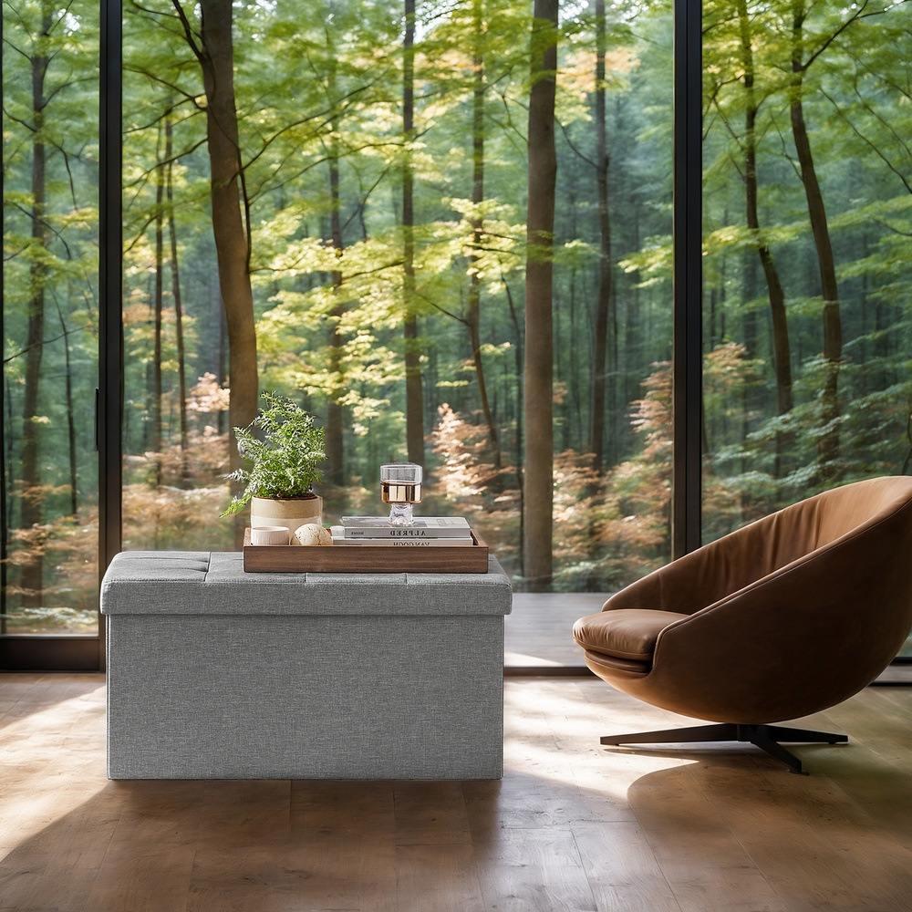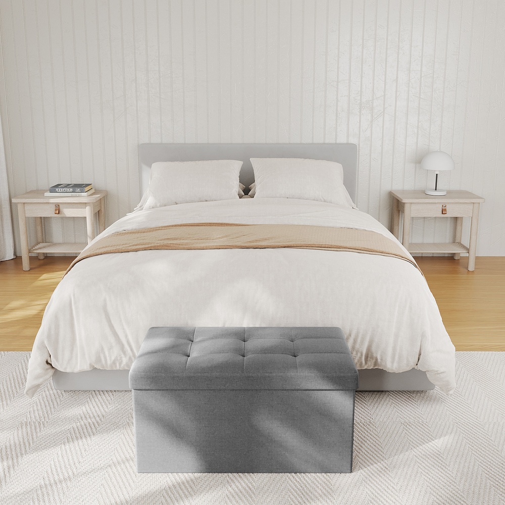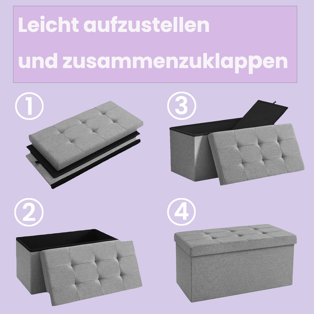 SONGMICS Bench with storage space, storage chest, stool, storage box, footrest, foldable, load capacity up to 300 kg, 80 L, 76 x 38 x 38 cm, imitation linen, light gray LSF47G