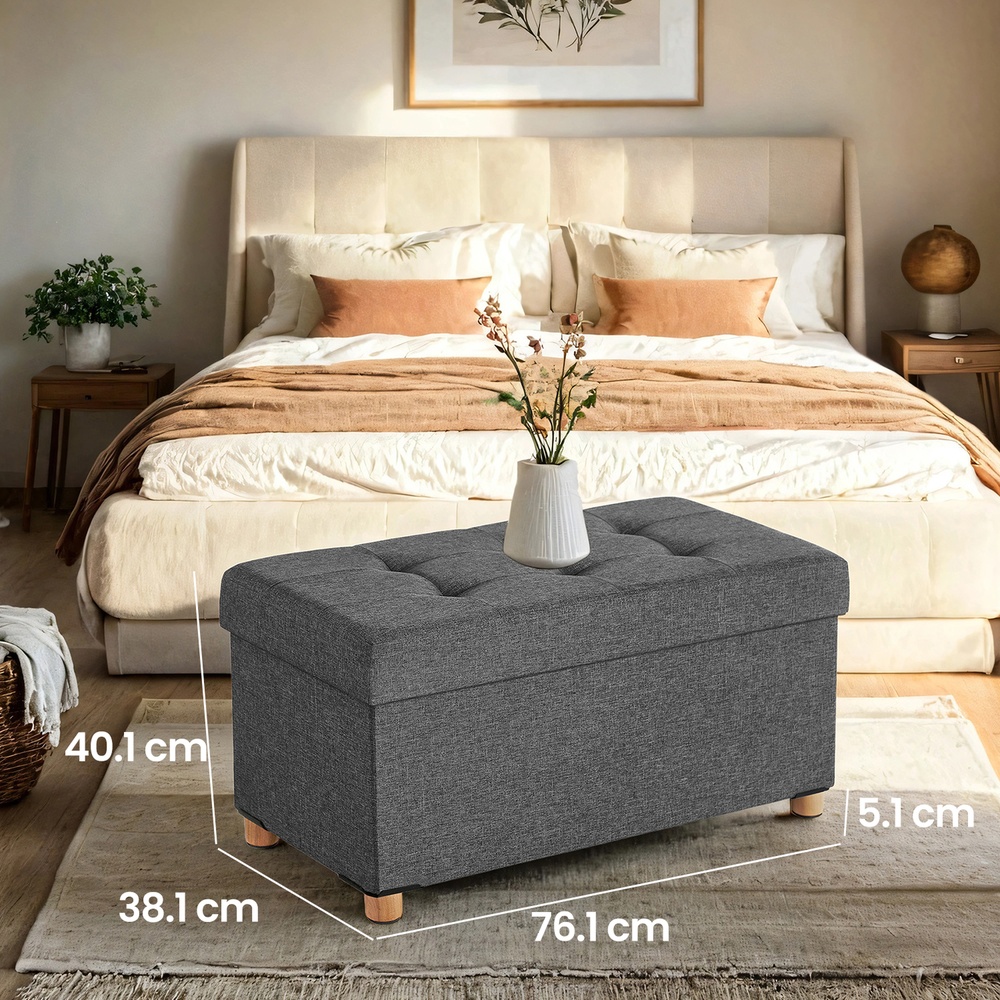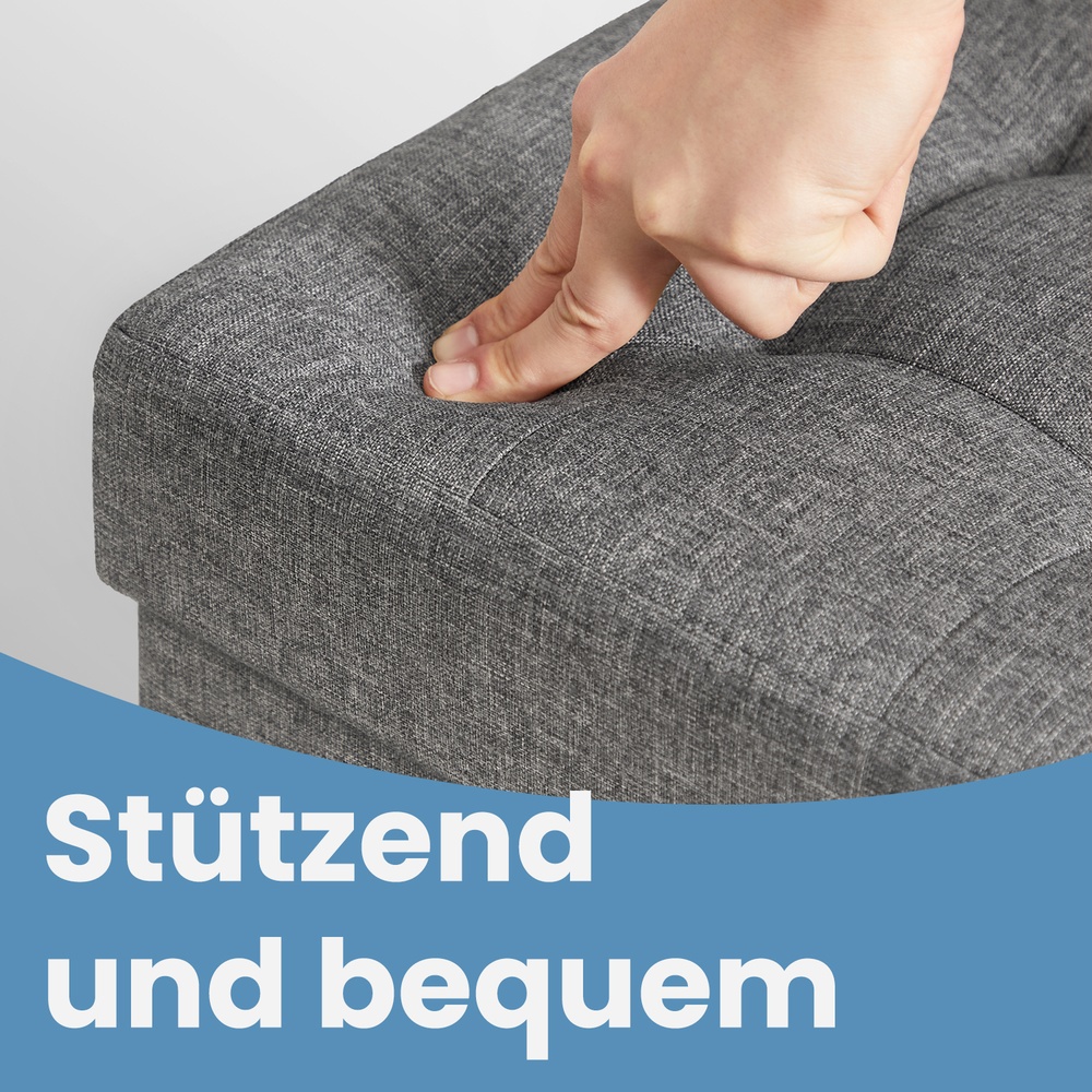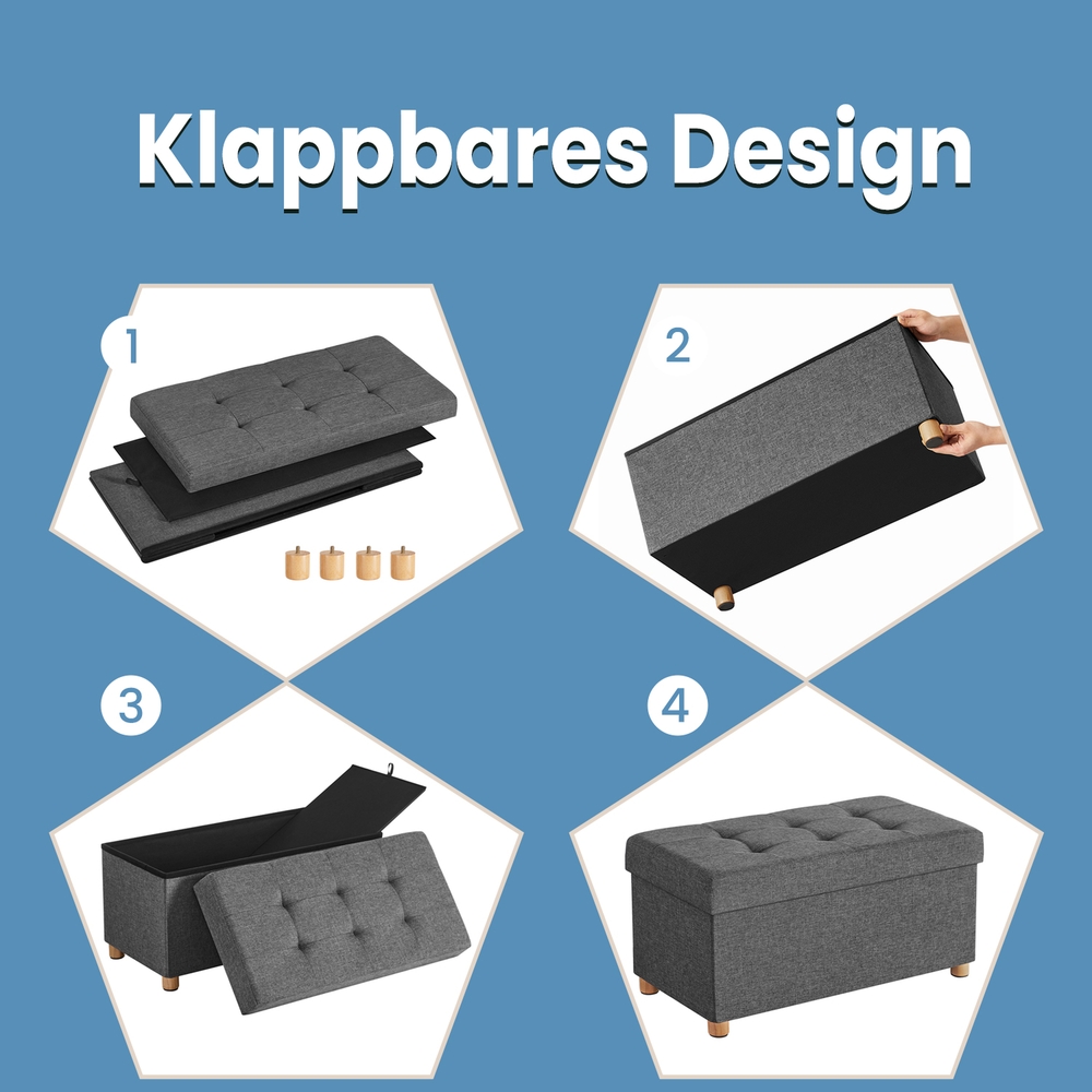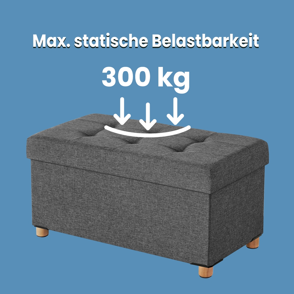More space-saving than a sofa or a coat rack Instead of buying another sofa for extra seating or a new coat rack for more storage space, you can kill two birds with one stone with this space-saving storage bench. Where to put this storage bench? Opposite the sofa in the living room? At the end of your bed in the bedroom? Or next to the coat rack in the hallway? The only limit is your imagination! If you don’t want to use the storage bench, you can fold it up and simply store it under your bed or on a shelf. If you’re interested in affordable yet clever furniture, check out more products from SONGMICS! Product details: – Color: Dark gray – Material: Linen imitation, MDF (medium-density fiberboard), foam, solid wood – Dimensions: 76 x 38 x 40 cm (L x W x H) – Weight: 6.5 kg – Max. static load capacity: 300 kg Scope of delivery: – 1 x stool