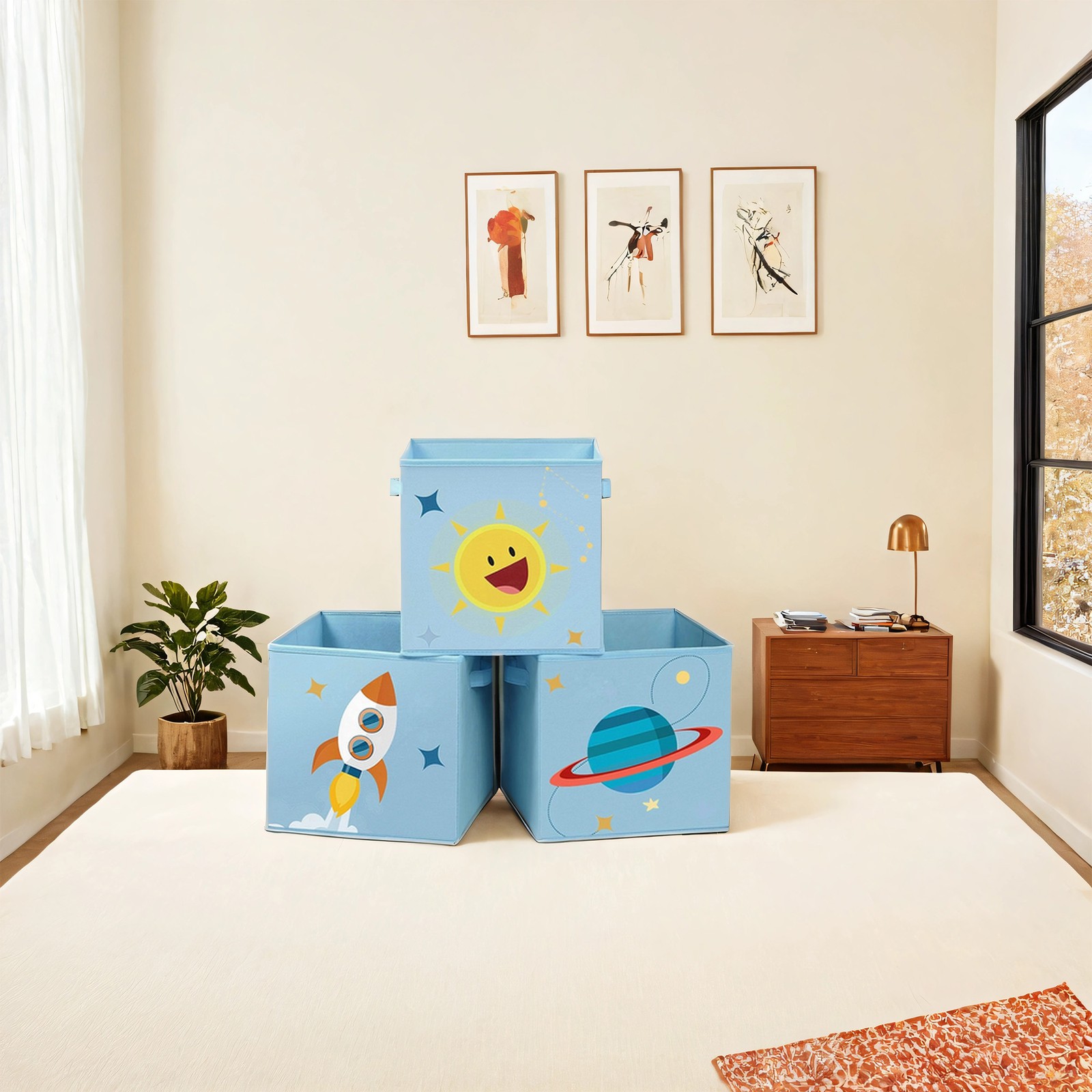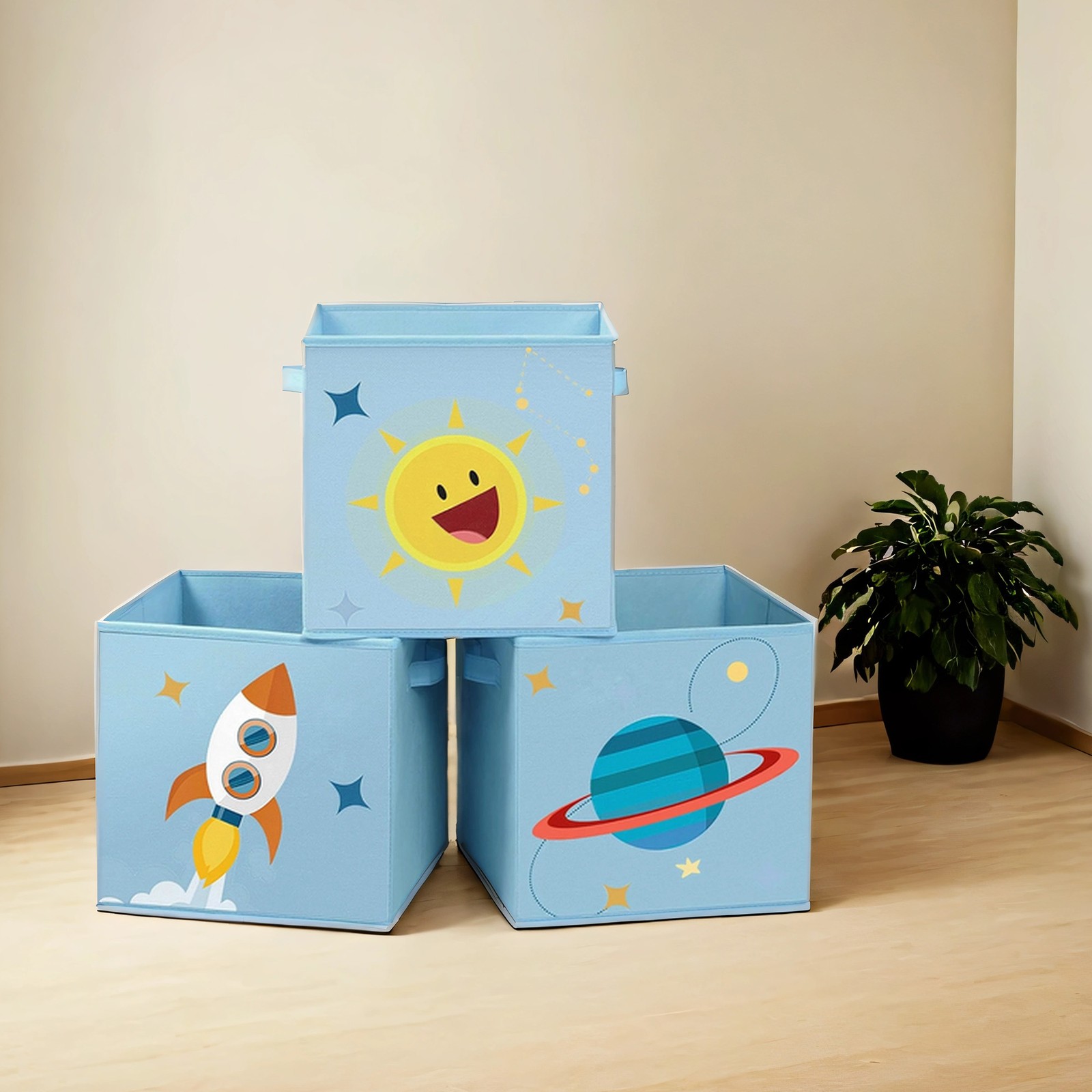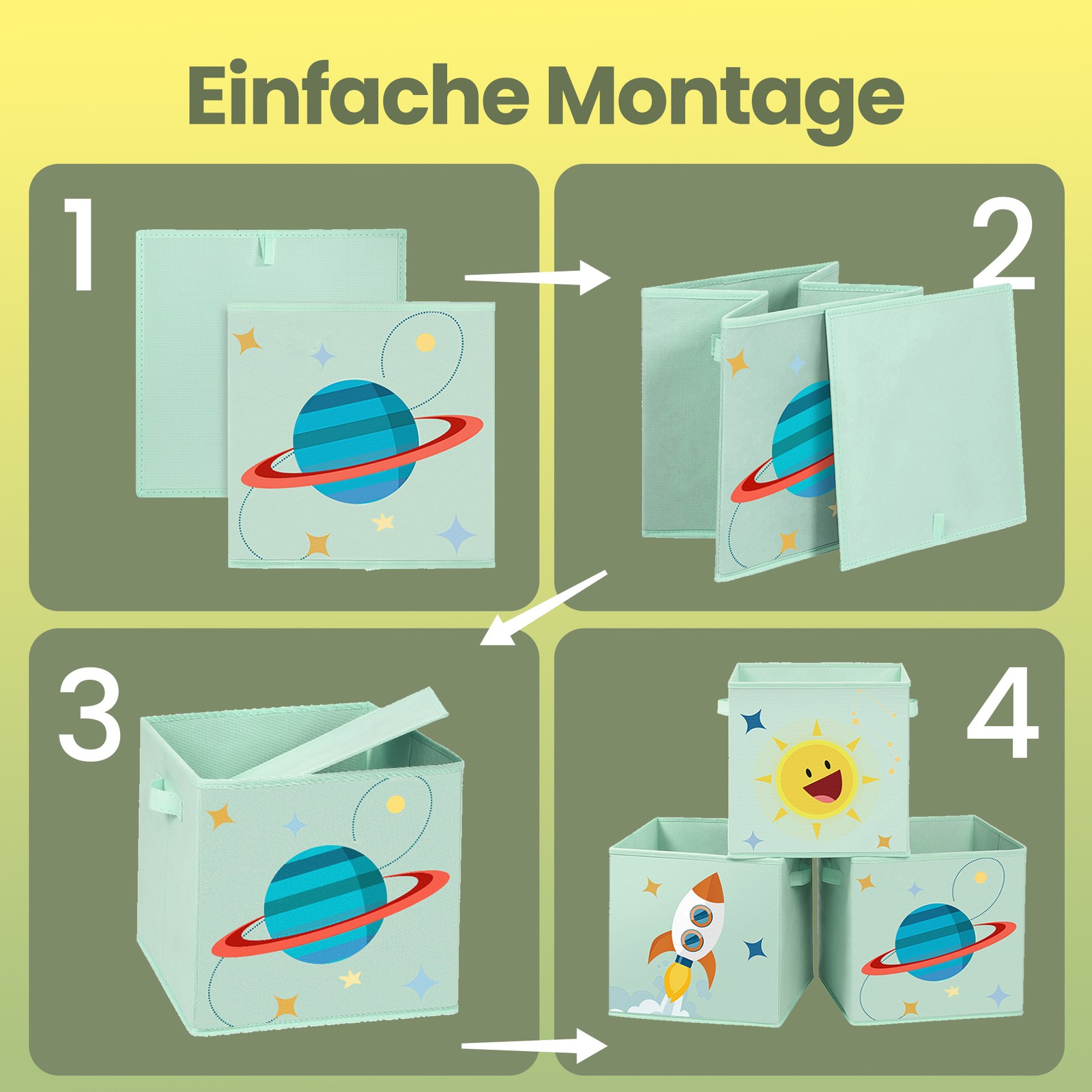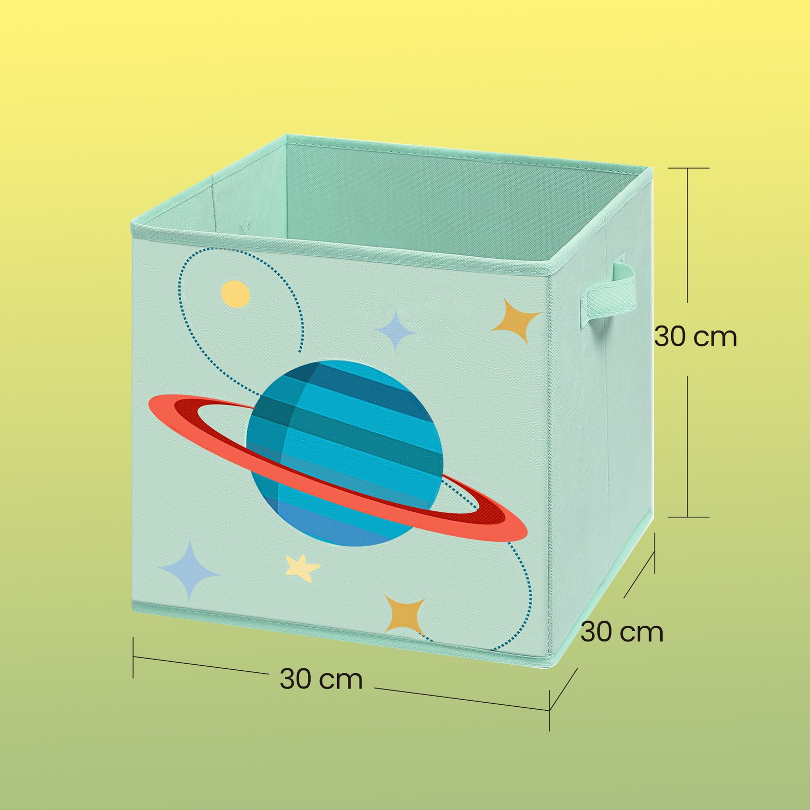 Tidying up can be fun: Does your child’s room look like a battlefield? Toys, clothes, and books everywhere? Surely you want to get rid of the mess and get the room back in shape. These 3 fabric boxes come to your rescue. The cute space motifs encourage your little ones to tackle the chaos themselves and tidy their toys away neatly in the boxes. Give more, take less: these boxes (each 30 x 30 x 30 cm) fit perfectly in your living room, bedroom, or children’s room and offer plenty of space for your odds and ends. When not in use, they can be easily folded up and stored to save space. Product details: Color: Green Material: Cardboard, non-woven fabric Size per box: 30 x 30 x 30 cm (L x W x H) Weight per box: 0.6 kg Scope of delivery: 3 x storage box SONGMICS notes: NOT washable! Please only wipe the product with a damp cloth to clean it. The product may have a slight odor when unpacked. In this case, please place it in a well-ventilated area for a few hours.