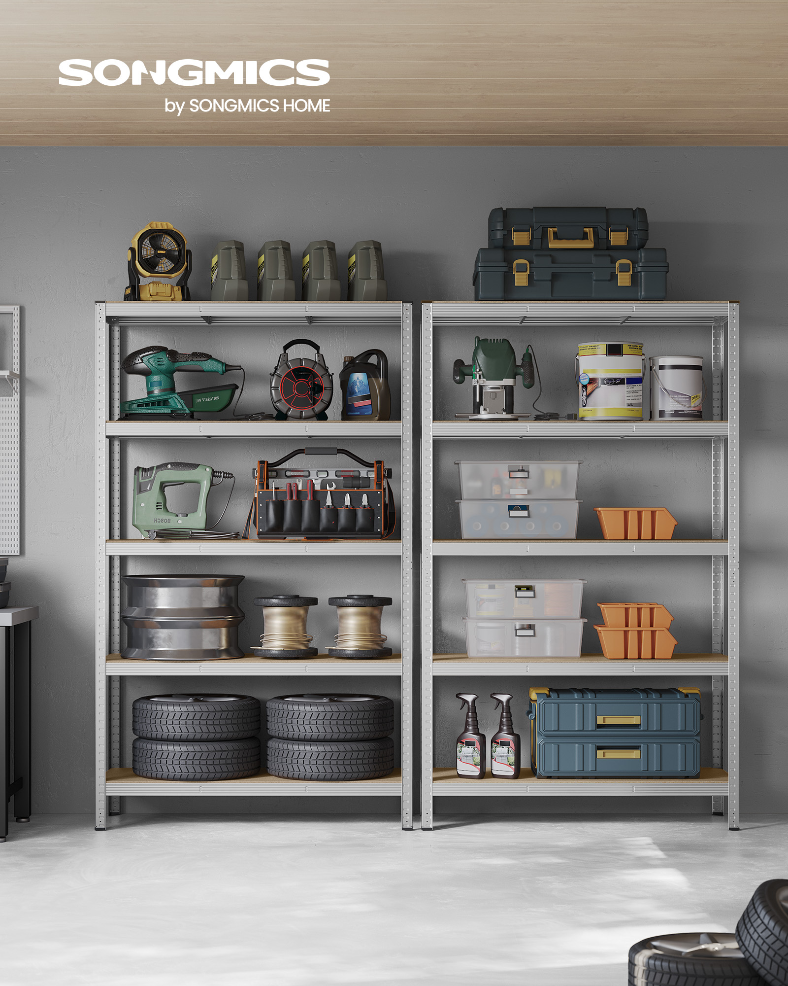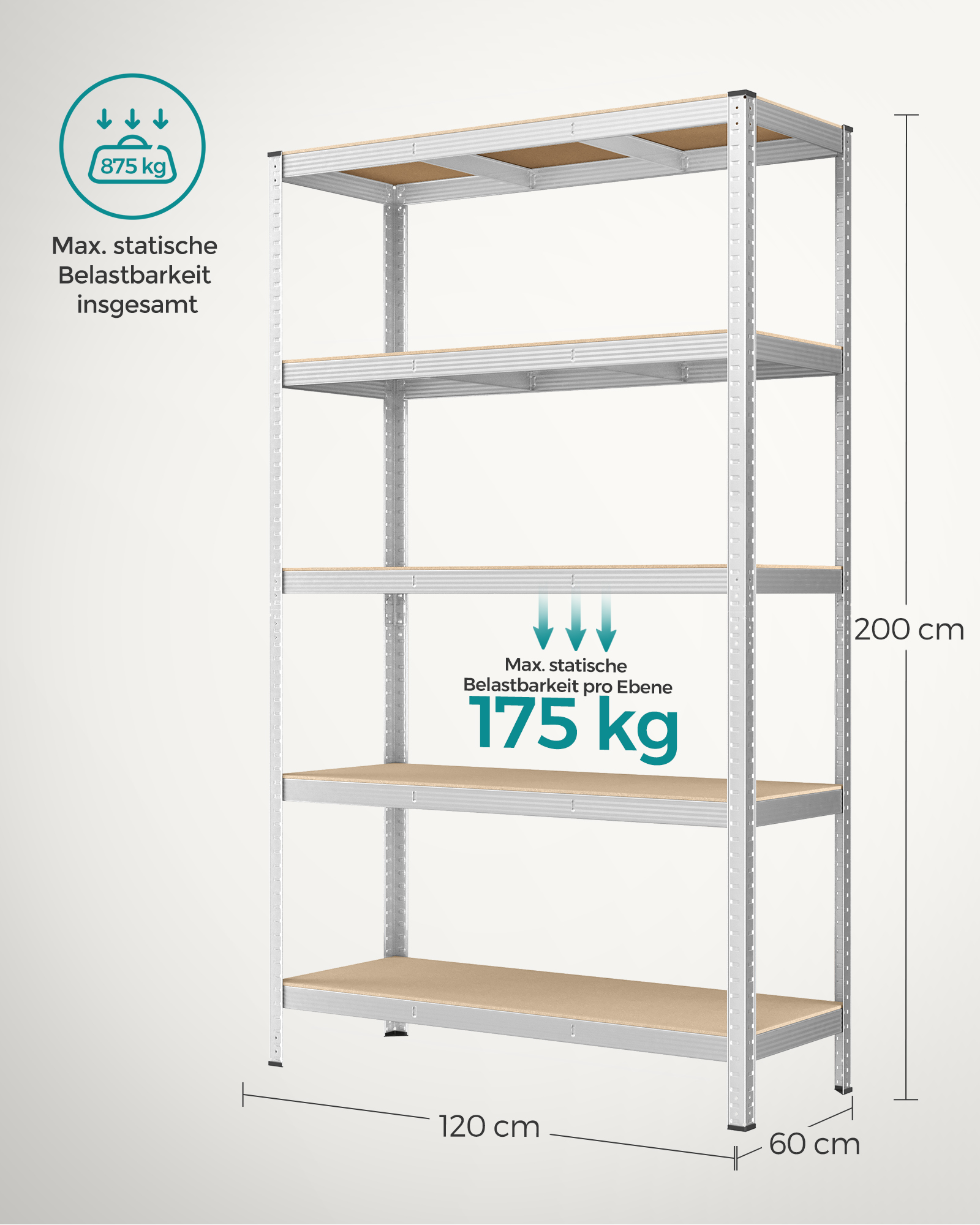 Are garden tools and various utensils scattered around your garage? Do you find it difficult to find the items you need? Then it’s high time to equip your garage with this storage rack and get the chaos under control. Top reasons why this shelving system from SONGMICS is just right for you: The reinforced steel frame and MDF shelves provide strong support.The crossbars under each shelf level increase stability. The frame is rust-resistant and wear-resistant. Each shelf can hold weights of up to 175 kg. The distance between the individual shelf levels is flexibly adjustable. You can also divide the shelf into two parts. The included anti-tip device ensures safe use. The shelf is suitable for basements, workshops, and business premises.Product details: Color: Silver Material: Steel, MDF (medium-density fiberboard) Size: 200 x 120 x 60 cm (H x L x W) Weight: 22.7 kg Max. static load capacity per shelf: 175 kg Scope of delivery: 1 x storage shelf 1 x anti-tip device 1 x instructions SONGMICS notes:Always wear gloves when assembling. Please do not place the product in a damp environment. The max. load capacity in the text refers to the maximum static weight.