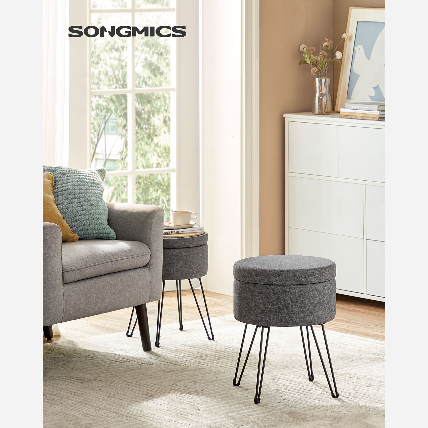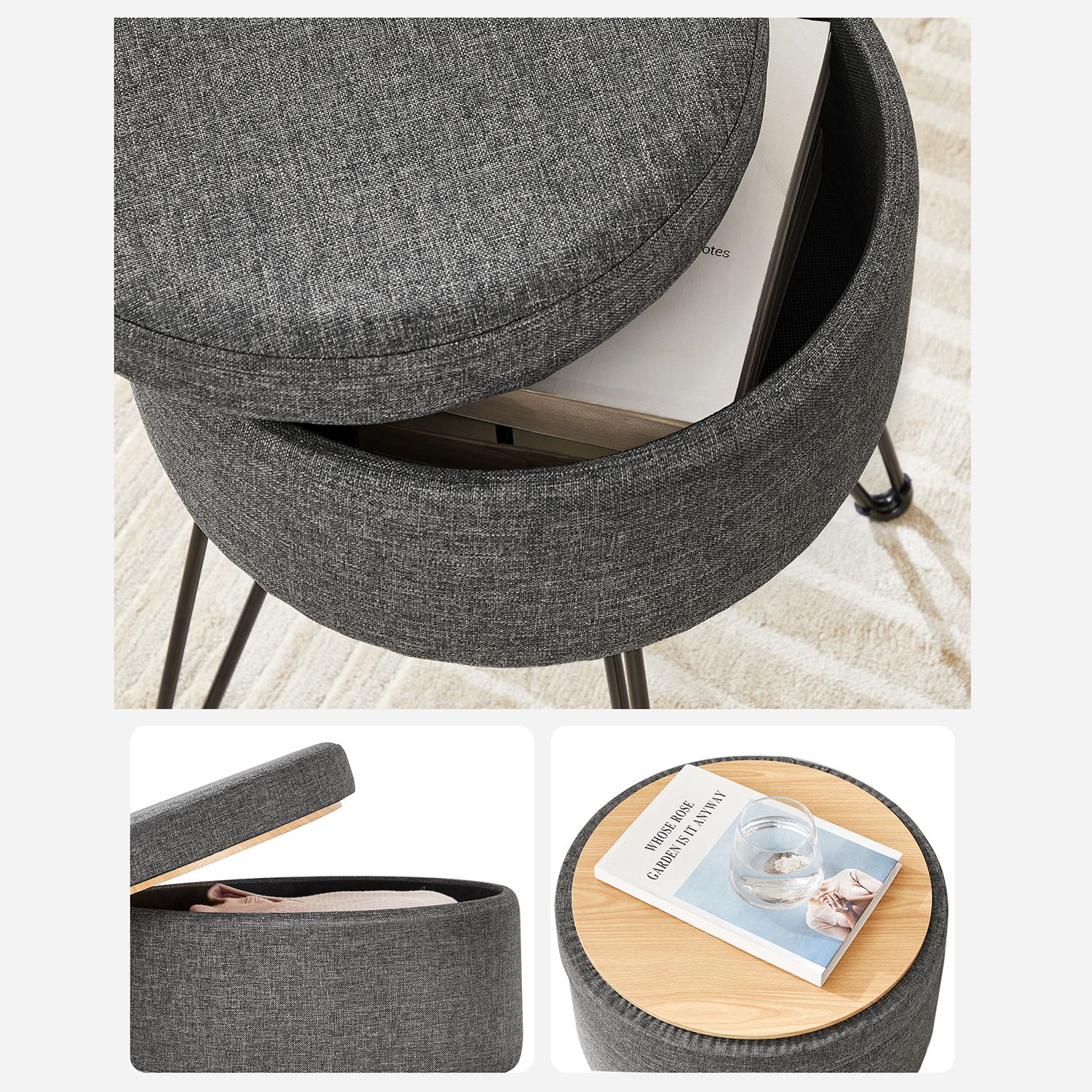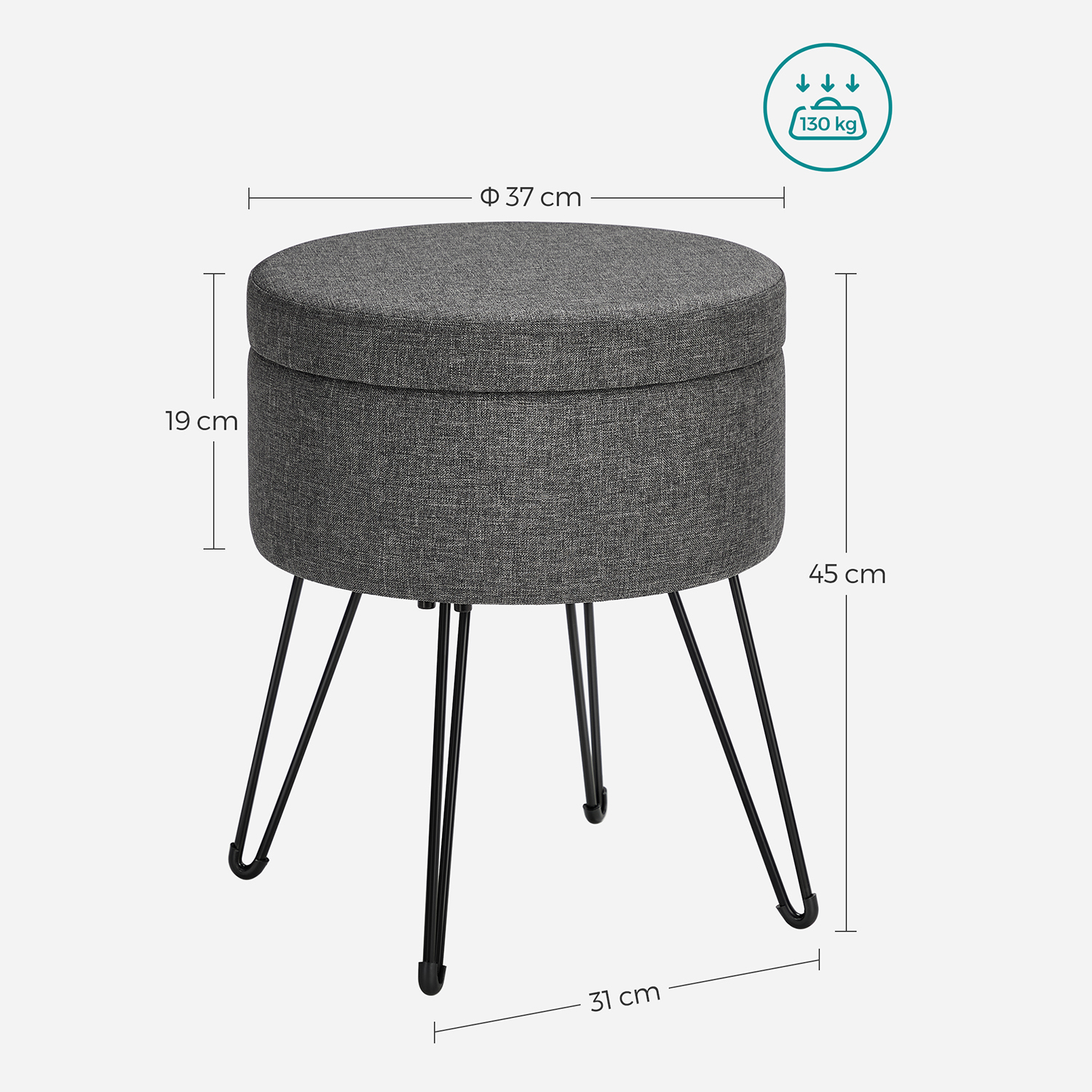 Stool with storage space Open the lid and use the interior space to help you keep things tidy by storing small toys, books, charging cables, etc. Footrest or stool You can place this piece of furniture next to the sofa and use it as a footrest; thanks to the high-density foam and high load capacity of 130 kg, the stool is comfortable and stable. Side table Turn the lid over to transform the stool into a side table where you can store coffee, drinks, your cell phone, or books. Product details: – Color: Dark gray – Material: Faux linen, foam, MDF (medium-density fiberboard), metal – Size: 37 x 45 cm (Ø x H) – Weight: 4.1 kg – Max. static load capacity: 130 kg Scope of delivery: – 1 x stool – 1 x instructions SONGMICS notes: – Children are not allowed to climb on the product. – Please do not use this product outdoors. – When moving the table, please lift it up instead of dragging it across the floor.