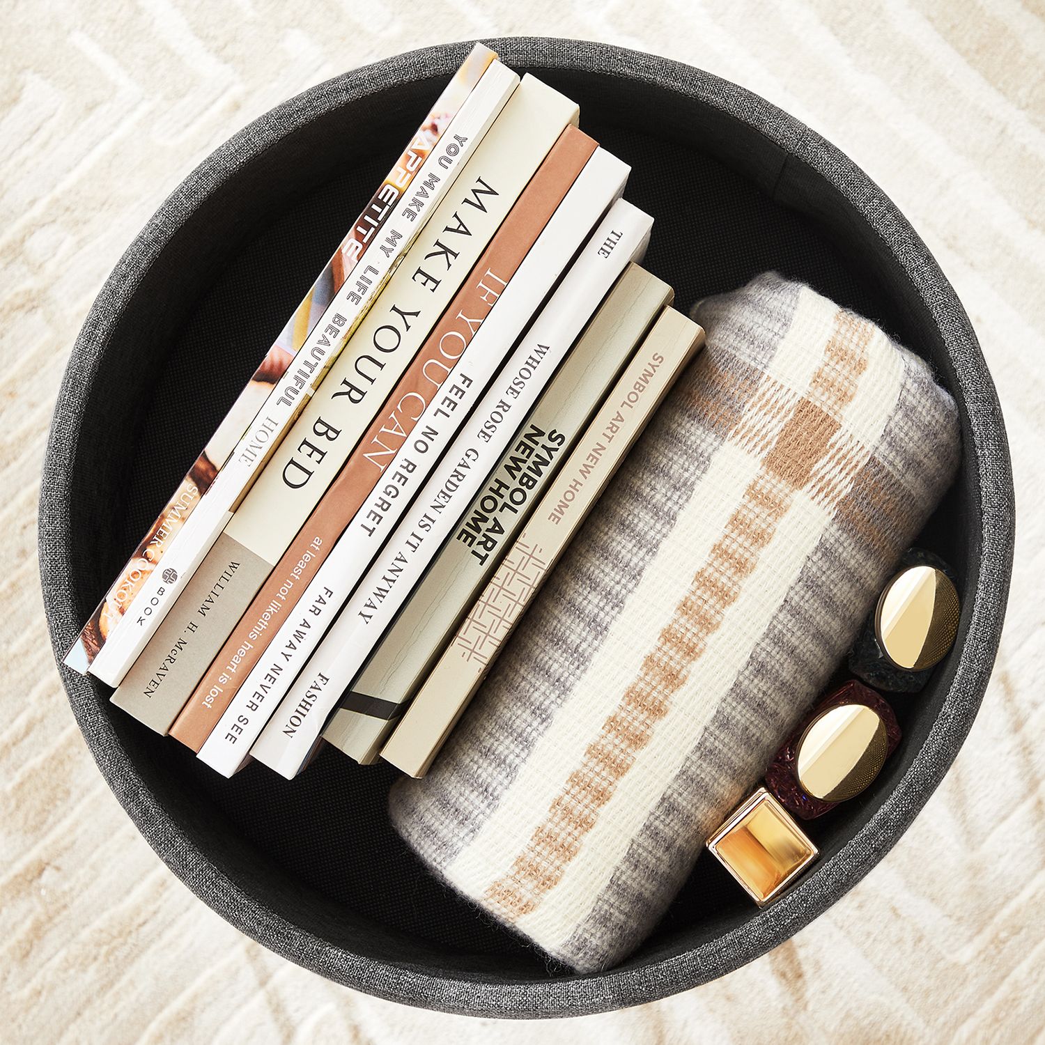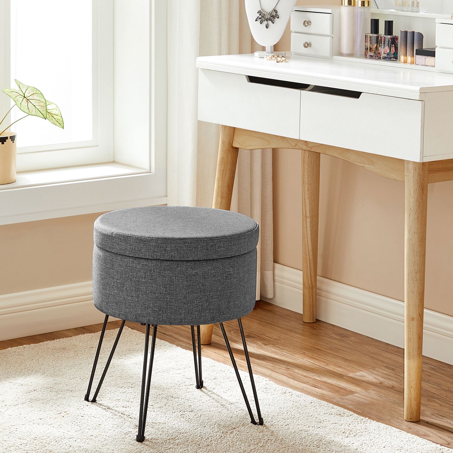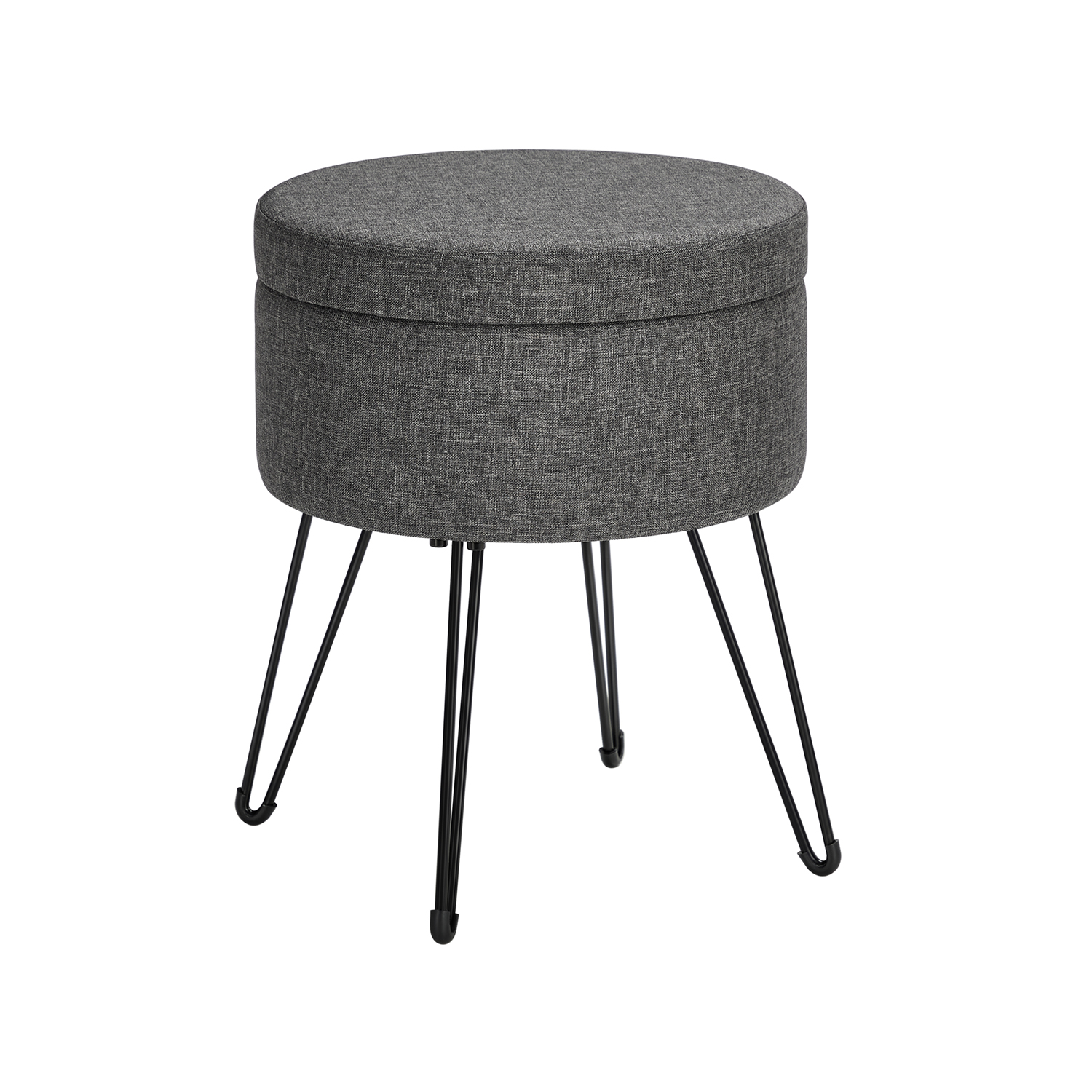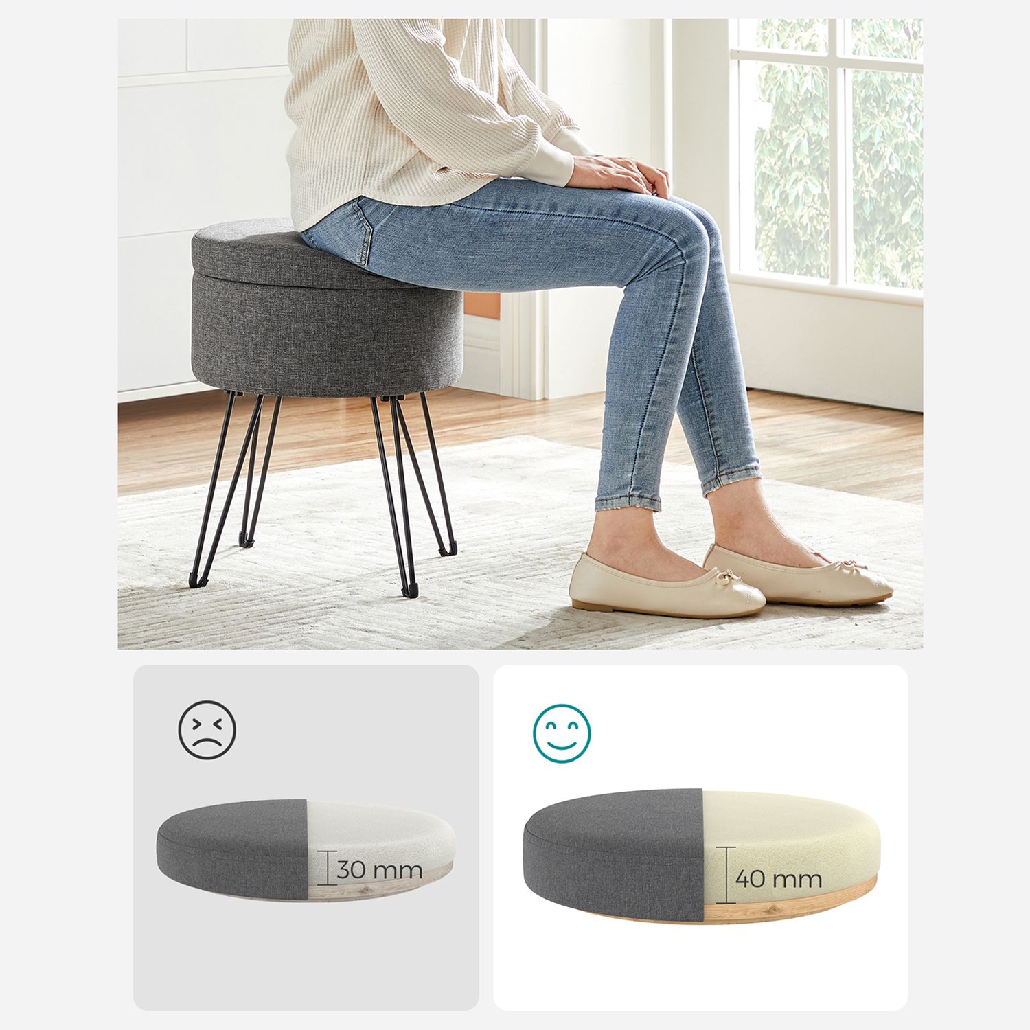 Stool with storage space Open the lid and use the interior space to help you keep things tidy by storing small toys, books, charging cables, etc. Footrest or stool You can place this piece of furniture next to the sofa and use it as a footrest; thanks to the high-density foam and high load capacity of 130 kg, the stool is comfortable and stable. Side table Turn the lid over to transform the stool into a side table where you can store coffee, drinks, your cell phone, or books. Product details: – Color: Dark gray – Material: Faux linen, foam, MDF (medium-density fiberboard), metal – Size: 37 x 45 cm (Ø x H) – Weight: 4.1 kg – Max. static load capacity: 130 kg Scope of delivery: – 1 x stool – 1 x instructions SONGMICS notes: – Children are not allowed to climb on the product. – Please do not use this product outdoors. – When moving the table, please lift it up instead of dragging it across the floor.