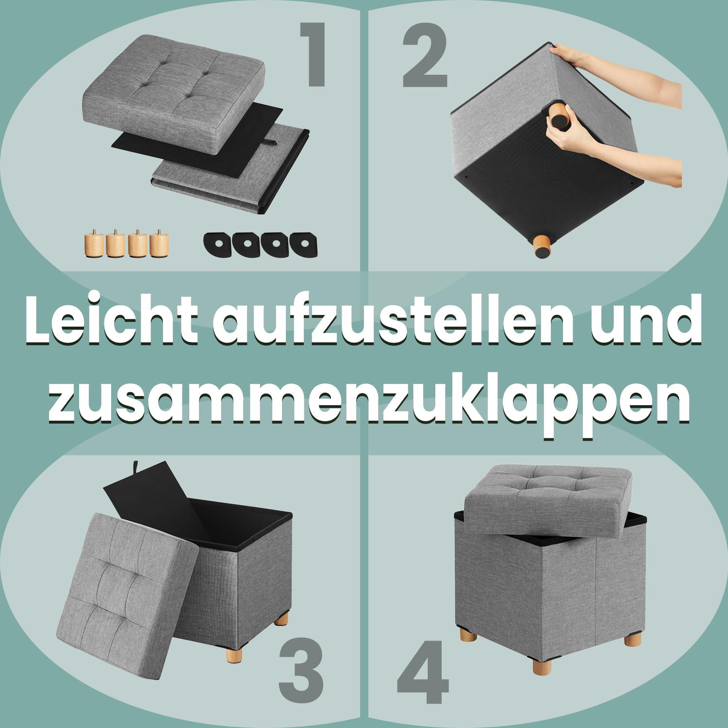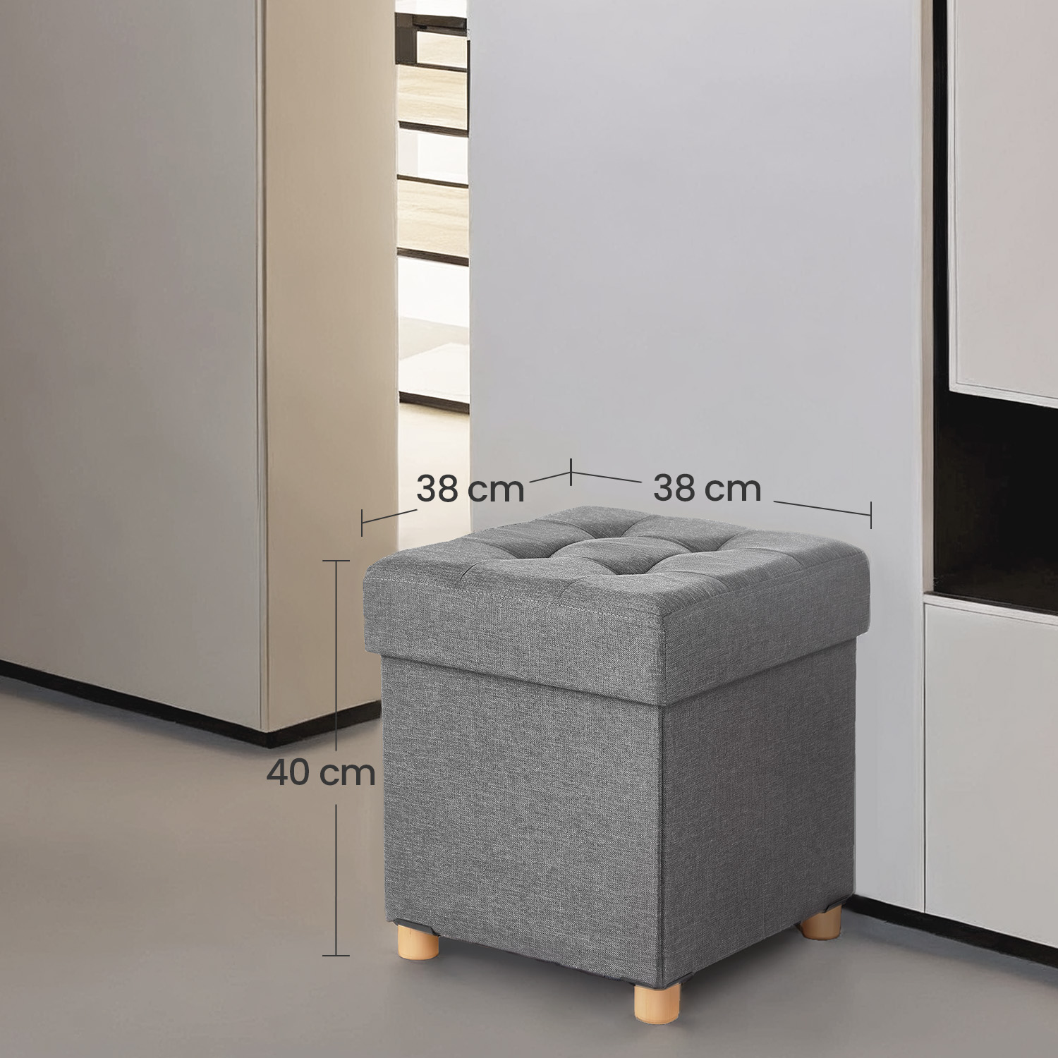 More space-saving than a sofa or wardrobe Instead of buying another sofa for extra seating or a new wardrobe for more storage space, you can kill two birds with one stone with this space-saving storage bench. Where to put this stool? Opposite the sofa in the living room? At the end of your bed in the bedroom? Or next to the coat rack in the hallway? The only limit is your imagination! If you don’t want to use the storage bench, you can fold it up and simply store it under your bed or on a shelf. Product details:- Color: Light gray – Material: Faux linen, foam, MDF (medium-density fiberboard), solid wood – Dimensions: 38 x 38 x 40 cm (L x W x H) – Weight: 3.5 kg – Max. static load capacity: 300 kg Scope of delivery: – 1 x stool