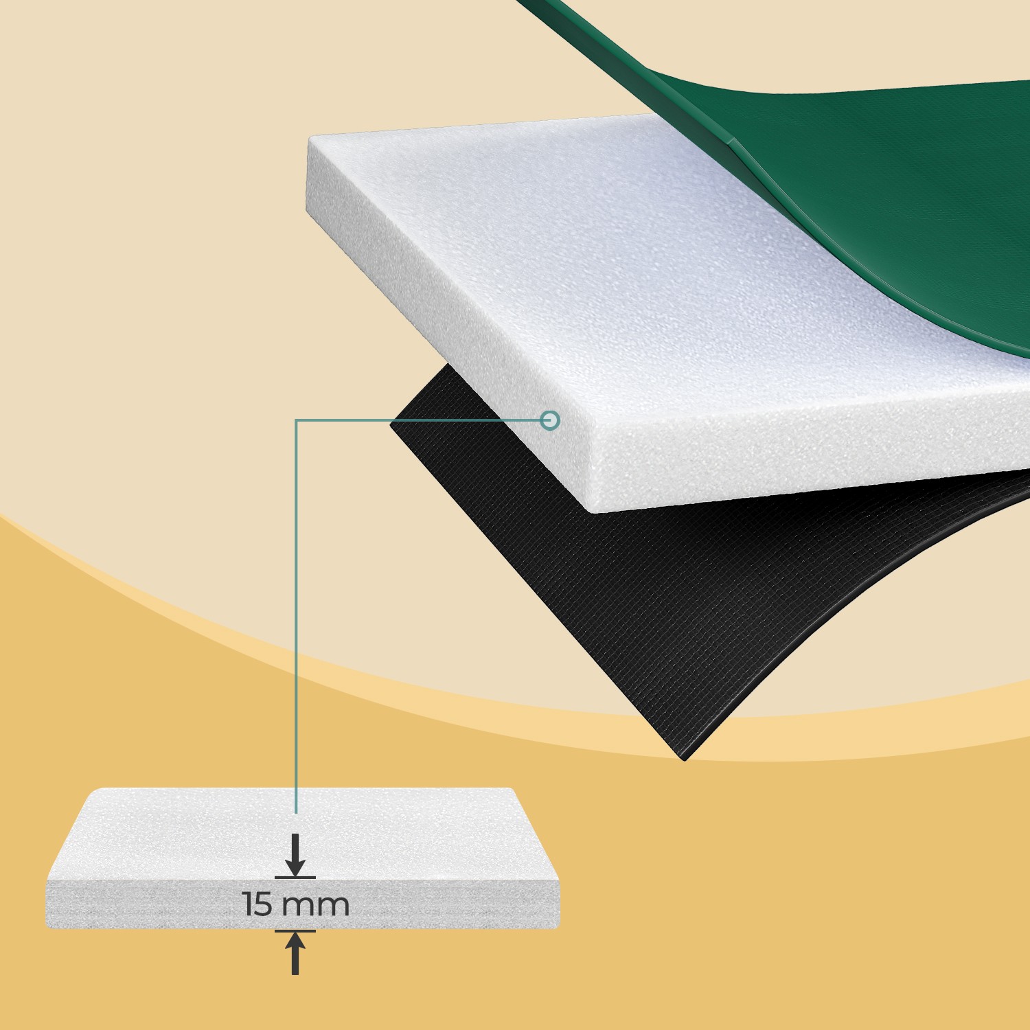 Songmics edge cover is made of high-quality material and has a long service life. The PVC surface and the inner EPD foam make this cover waterproof, tear-resistant, and dimensionally stable. Your safety is paramount. If you have had the cover for a long time or if there are already tears in it, prepare your trampoline for a new cover. The newly designed Songmics edge cover can prevent injuries from falls against the springs or frame, ensuring that children and adults are well protected. Product details: Material: – Surface: Green – Underside: PE plastic – The center of the cover is equipped with padding that is 15 mm thick and 300 mm wide. Dimensions: – Outer diameter: 305 cm – Inner diameter: 245 cm Scope of delivery: – 1 x edge cover