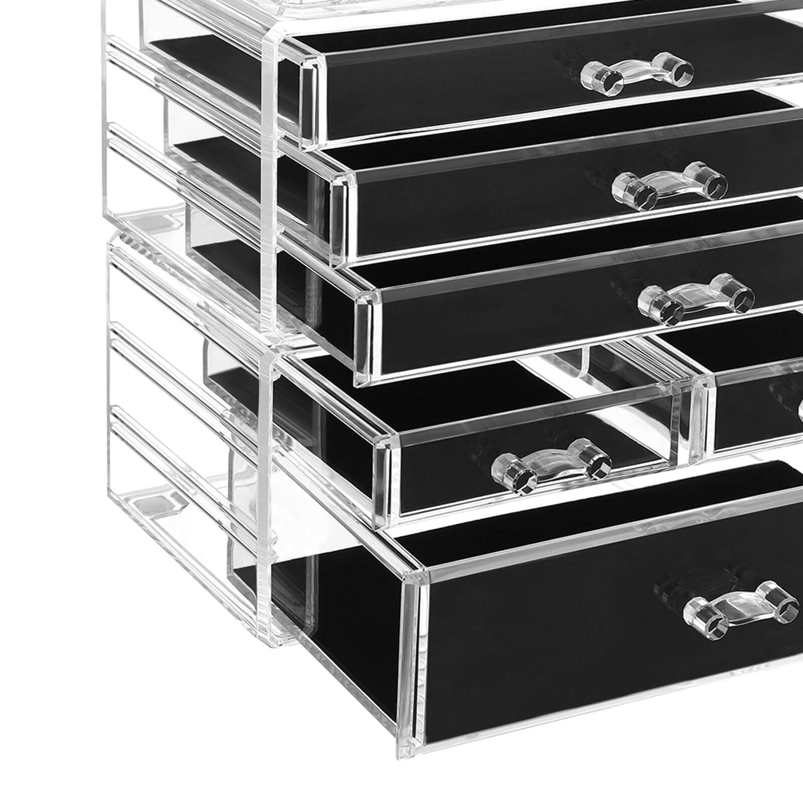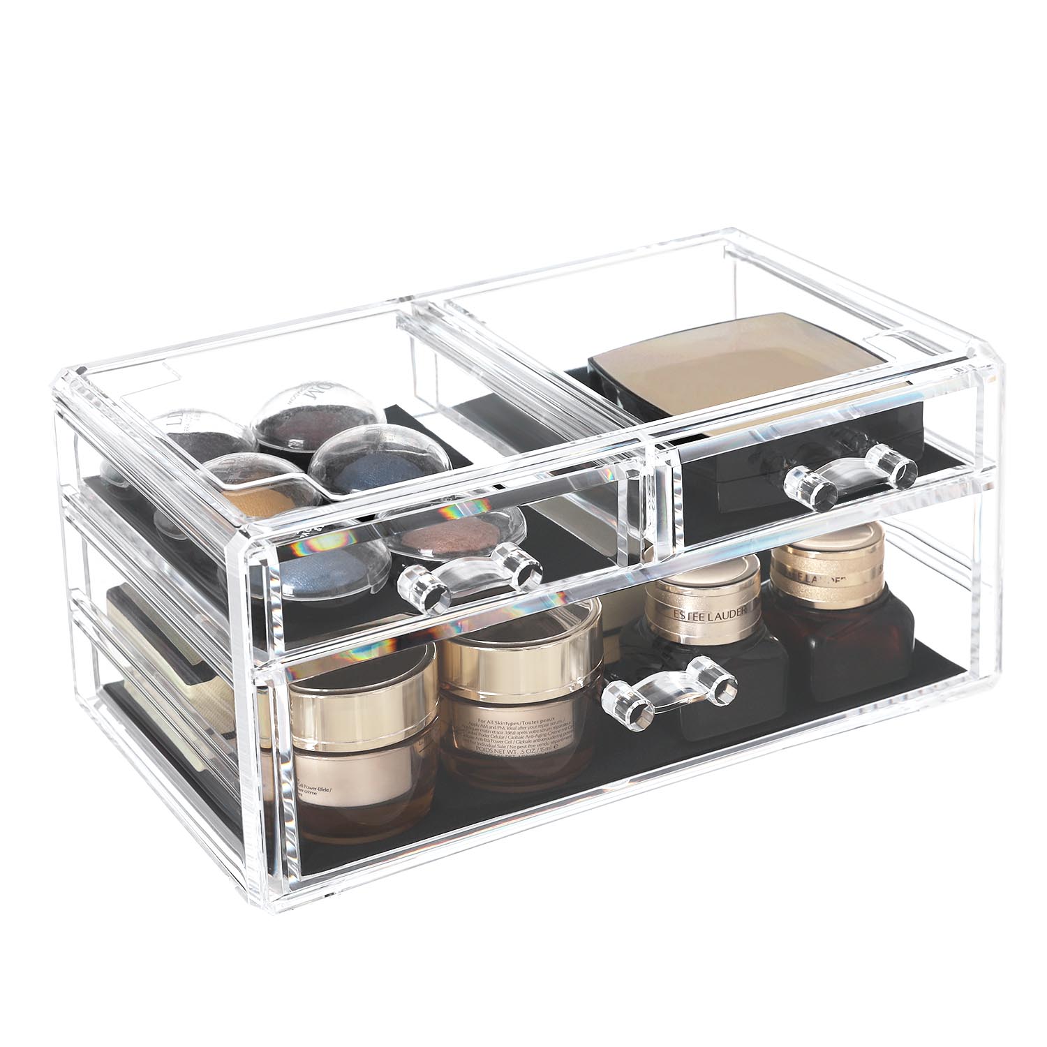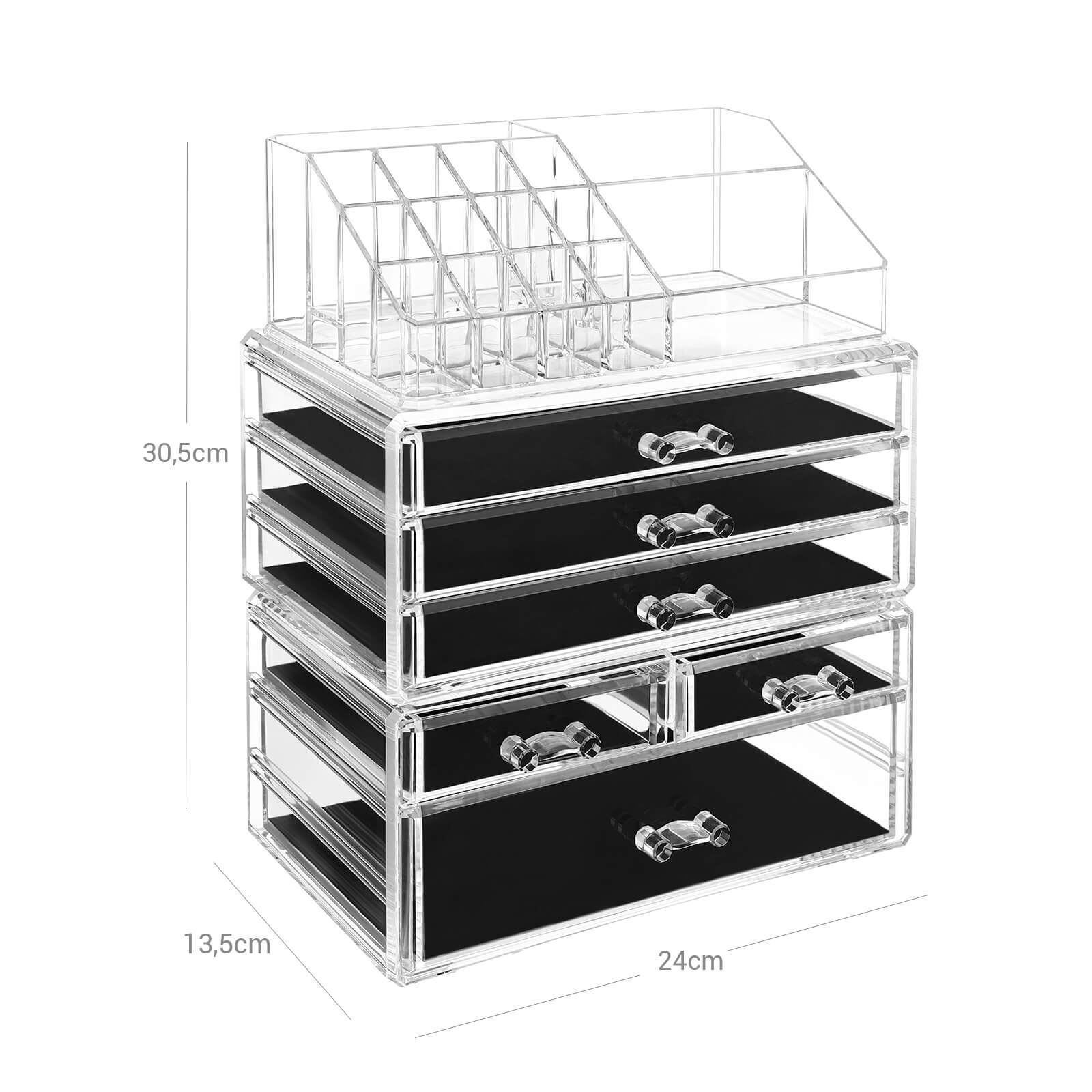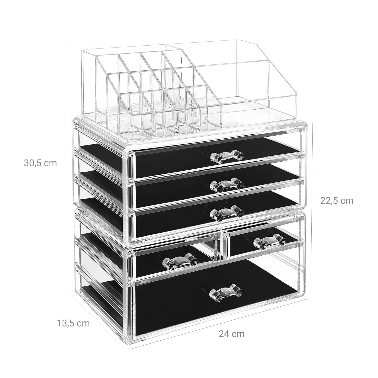 Finely divided compartments With several compartments of different heights and sizes, all your makeup can be organized. Rounded edges Careful workmanship ensures that the edges are smooth, posing no risk of injury, and giving the organizer a modern and elegant look.Anti-slip insert mat Prevents slipping, allows jewelry and cosmetics to be placed quietly, and protects them from scratches. Notes: Please use with care and avoid subjecting the product to impacts or scratches. Product details: Dimensions: 24 x 30 x 13.5 cm (W x H x D)Dimensions 1st level: 22.5 x 8 x 13 cm (W x H x D) Dimensions 2nd level: 24 x 11 x 13.5 cm (W x H x D) Dimensions 3rd level: 24 x 11 x 13.5 cm (W x H x D) Scope of delivery: 1 x cosmetics organizer