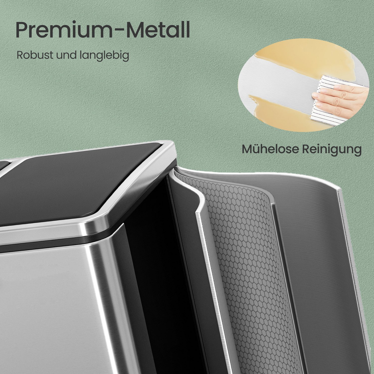 Robust and durable stainless steel housing (thickness 0.35 mm) increases pressure resistance, and the easy-to-clean housing is corrosion-resistant. Two handle inserts allow you to move the waste bin easily. The lid made of environmentally friendly plastic can seal the waste bin tightly, and thanks to the ergonomic lid design, the bin is easy to open and closes quietly. You can remove the inner bins, which is very practical for moving waste and emptying the bins. The foot pedals are stable and durable. The non-slip and waterproof base protects your floor from scratches. Product details: Material: Matte stainless steel (housing) + PP plastic (inner bucket) + ABS plastic (lid) External dimensions: 41 x 47 x 36 cm (W x H x D) Inner bucket dimensions: 26.5 x 40.5 x 18 cm (W x H x D) Lid dimensions when fully open: 41 x 73.5 x 36 cm (W x H x D) Foot pedal dimensions: 11.5 x 4 cm; Ø tube: 1 cm Color: silver (housing), black (inner bucket, lid) Net weight: 5.1 kg Gross weight: 8.6 kg Scope of delivery: 1 x waste bin