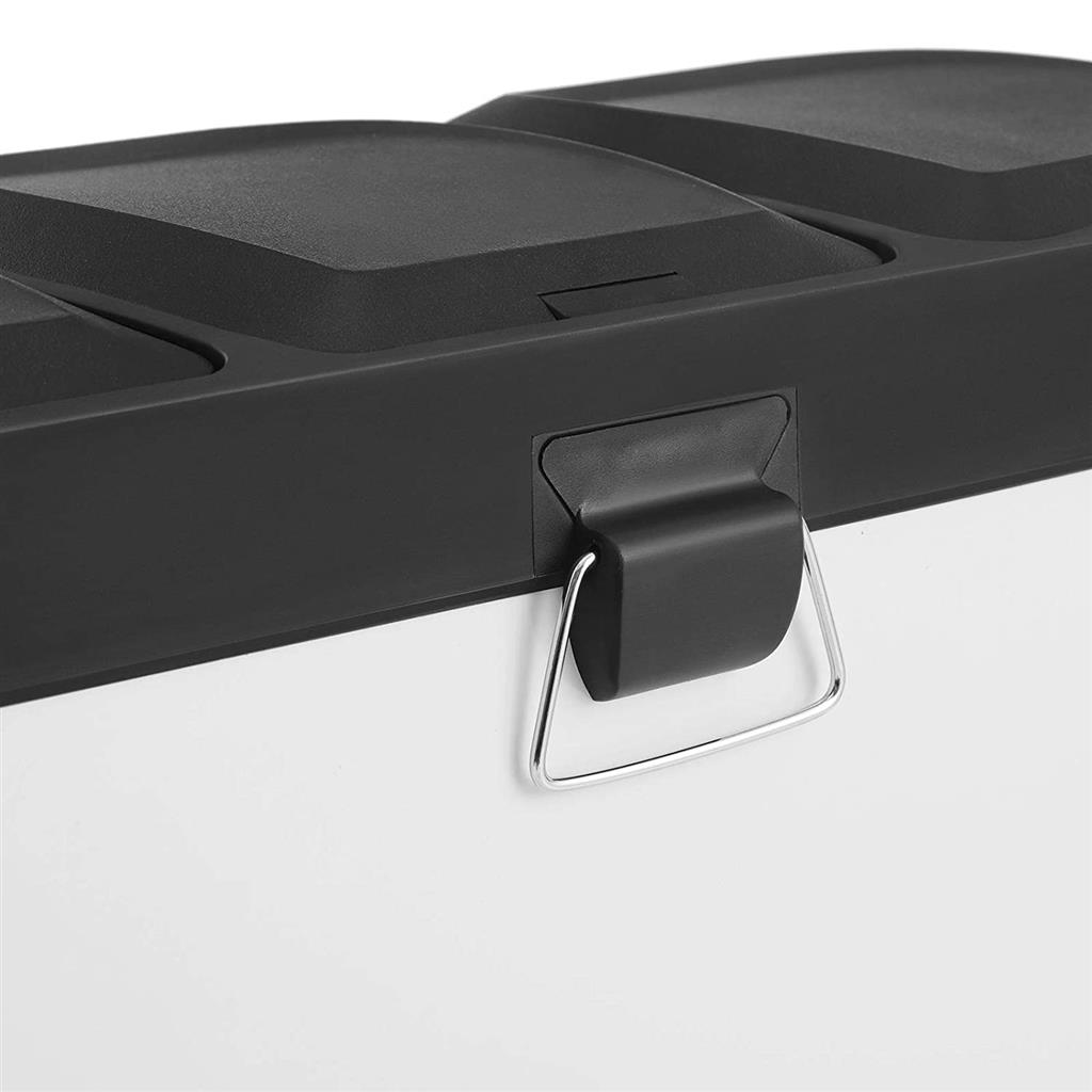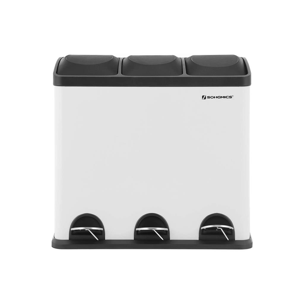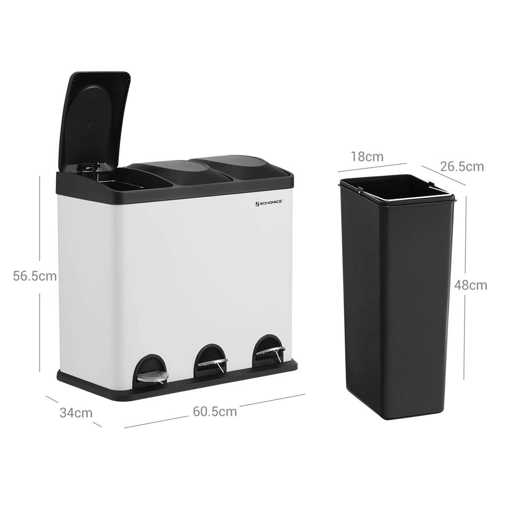 Why should you choose this trash can from SONGMICS? 3 separate compartments for sorting waste Fits in your kitchen Recycling can be easy: With this pedal bin with 3 separate compartments, you can easily sort your trash, e.g., residual waste and organic waste. All you have to do is press the pedal and throw the waste into the inner bin. You don’t even have to touch the trash can with your hands, which ensures hygiene. A puppy- and child-proof trash can: Does your dog often rummage through the trash can? Do your little ones frequently reach into the open container? If so, you’ll definitely want to put a stop to that. That’s where our pedal bin comes in! The lid only opens when you press the pedal. Product details: Color: White-black Material: Steel, ABS plastic Overall size: 60.5 x 34 x 56.5 cm (L x W x H) Size per inner bin: 18 x 26.5 x 48 cm (L x W x H) Total height (with lid open): 82 cm Weight: 7.5 kg Scope of delivery: 1 x trash can