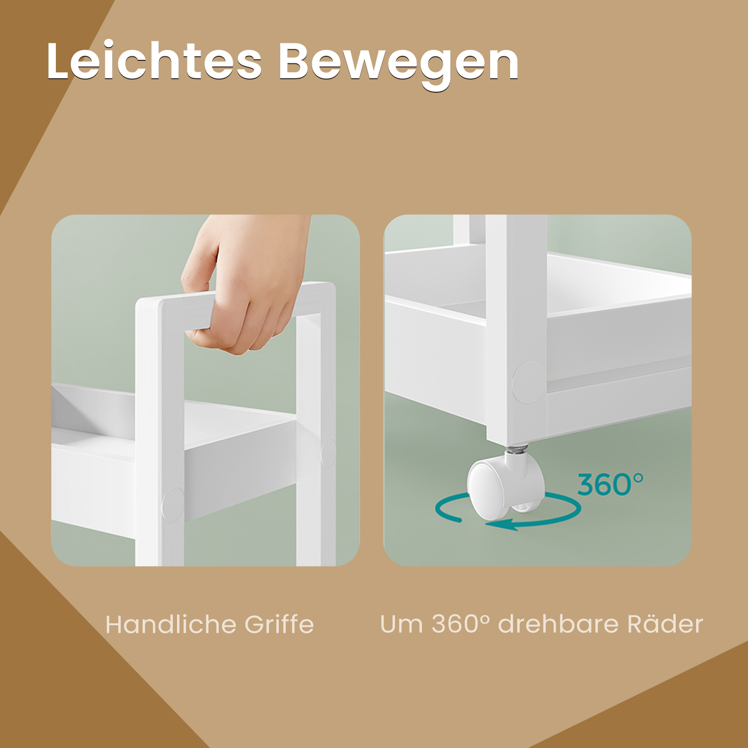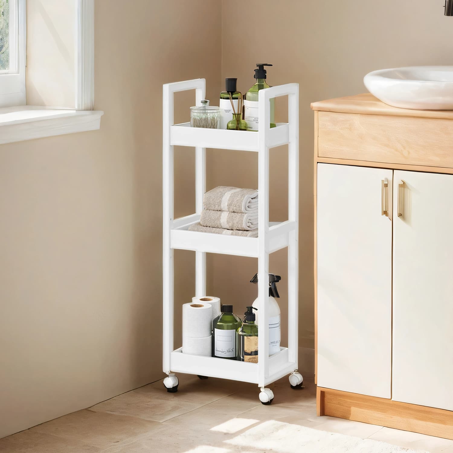 SONGMICS trolley, bathroom shelf, bathroom shelf with 3 levels, niche shelf bamboo, narrow shelf, niche trolley on casters, space-saving