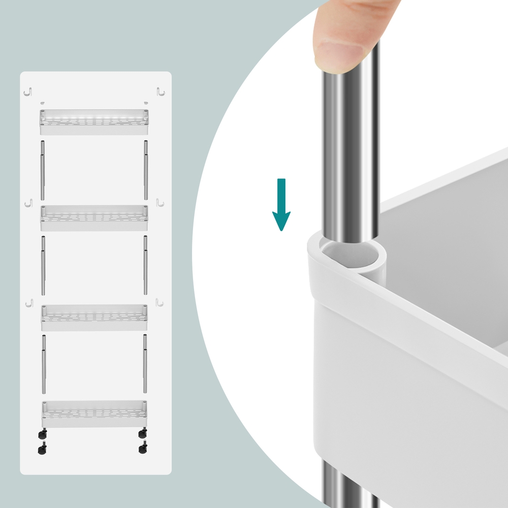 Everything within easy reach: equipped with 4 high-quality PP plastic shelves and supported by sturdy iron tubes, this trolley offers enough space for all those items that have not yet found a permanent place in your home. This versatile piece can also easily hold heavy items. Thanks to its compact size (40 x 13.5 x 86 cm), the serving trolley fits perfectly in the bathroom for storing beauty products, in the kitchen for storing kitchen utensils, or in the office for storing documents.Product details: Color: White Material: PP (polypropylene), iron tubes Overall size: 40 x 13.5 x 86 cm (L x W x H) Weight: 1.3 kg Max. static load capacity: 20 kg (5 kg per level) Scope of delivery: 1 x trolley 3 x hooks 1 x instructions (DE, EN, DE, FR, ES, IT)SONGMICS Notes: Only assemble the product as described in these instructions. Please do not disassemble it by force. Each shelf can hold up to 5 kg. Please do not store heavier items on the product.