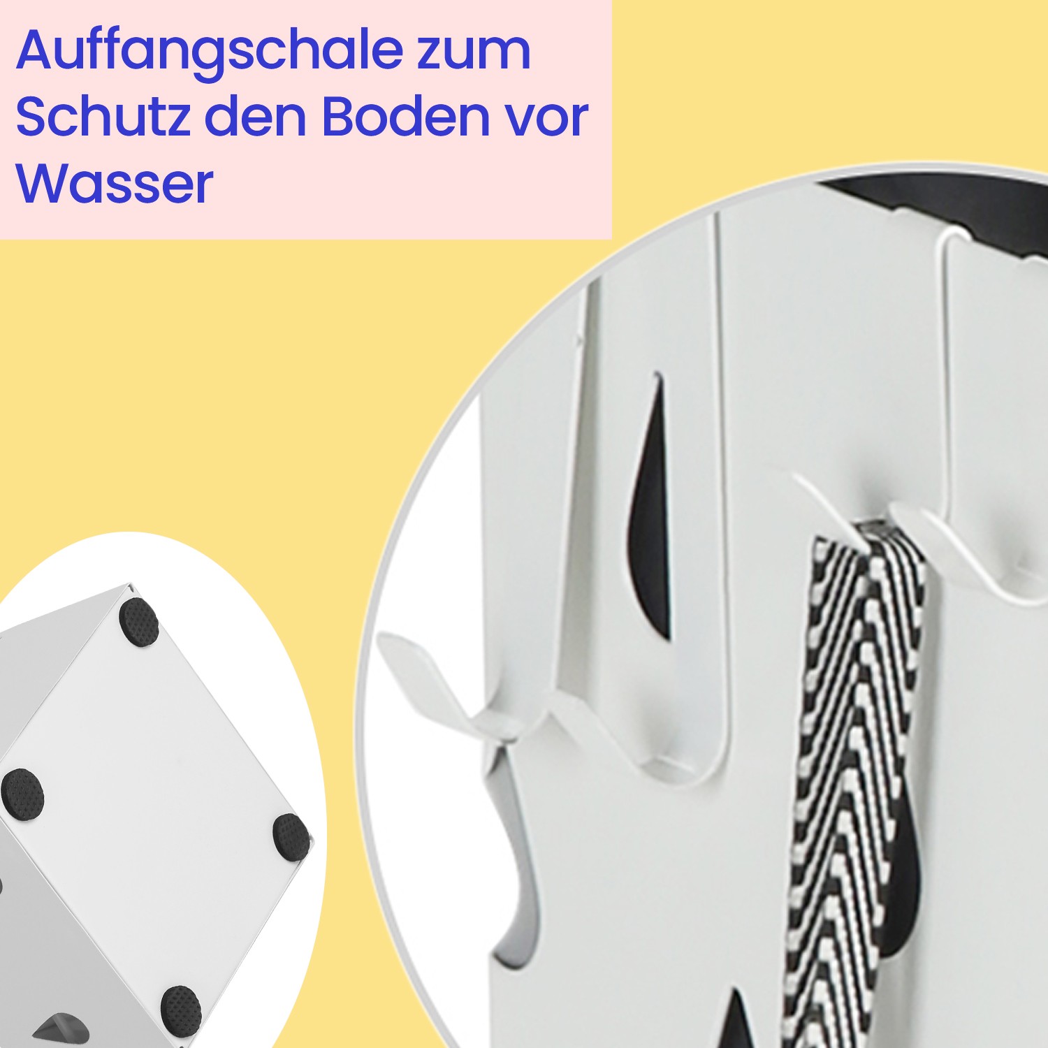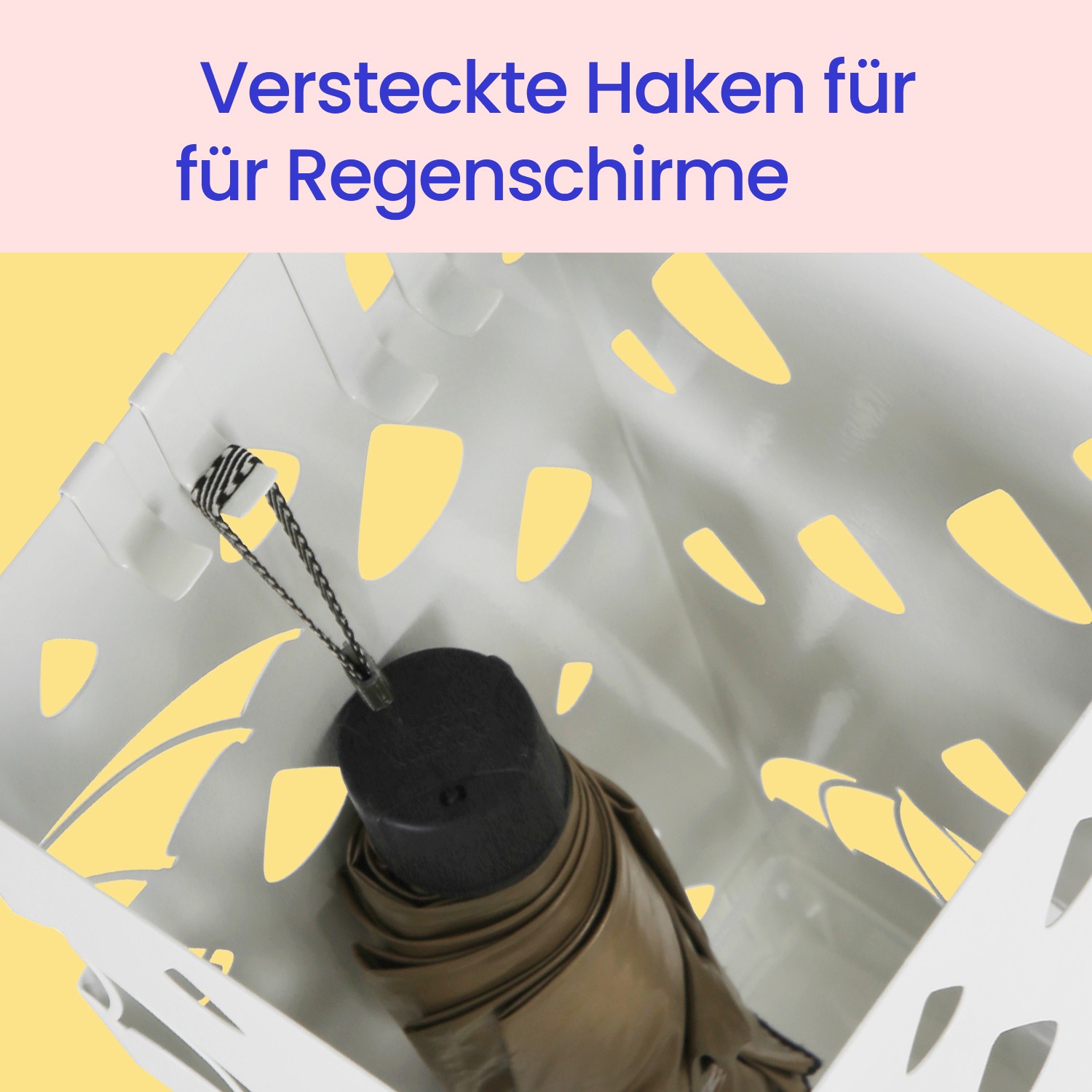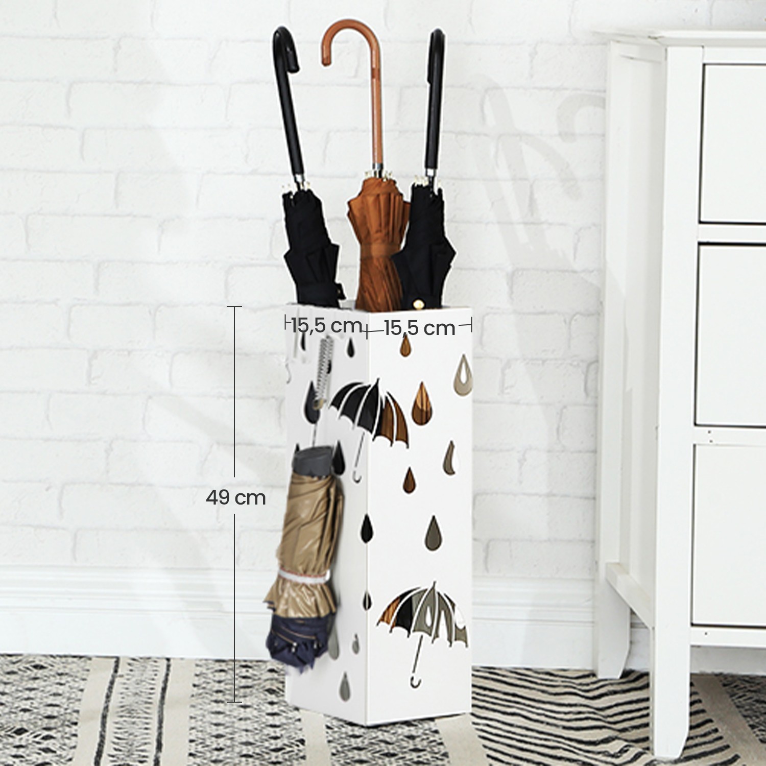 This iron umbrella stand is both functional and stylish. The hole pattern of raindrops and an open umbrella is very fitting for an umbrella stand. The stand not only offers you storage space, but also decorates your room and is sure to be an eye-catcher in your hallway/entrance area. Product details: Material: Sheet iron Dimensions: 15.5 x 15.5 x 49 cm Color: White Weight: 2 kg Scope of delivery: 1 x umbrella stand 1 x water collection tray 4 x hooks
