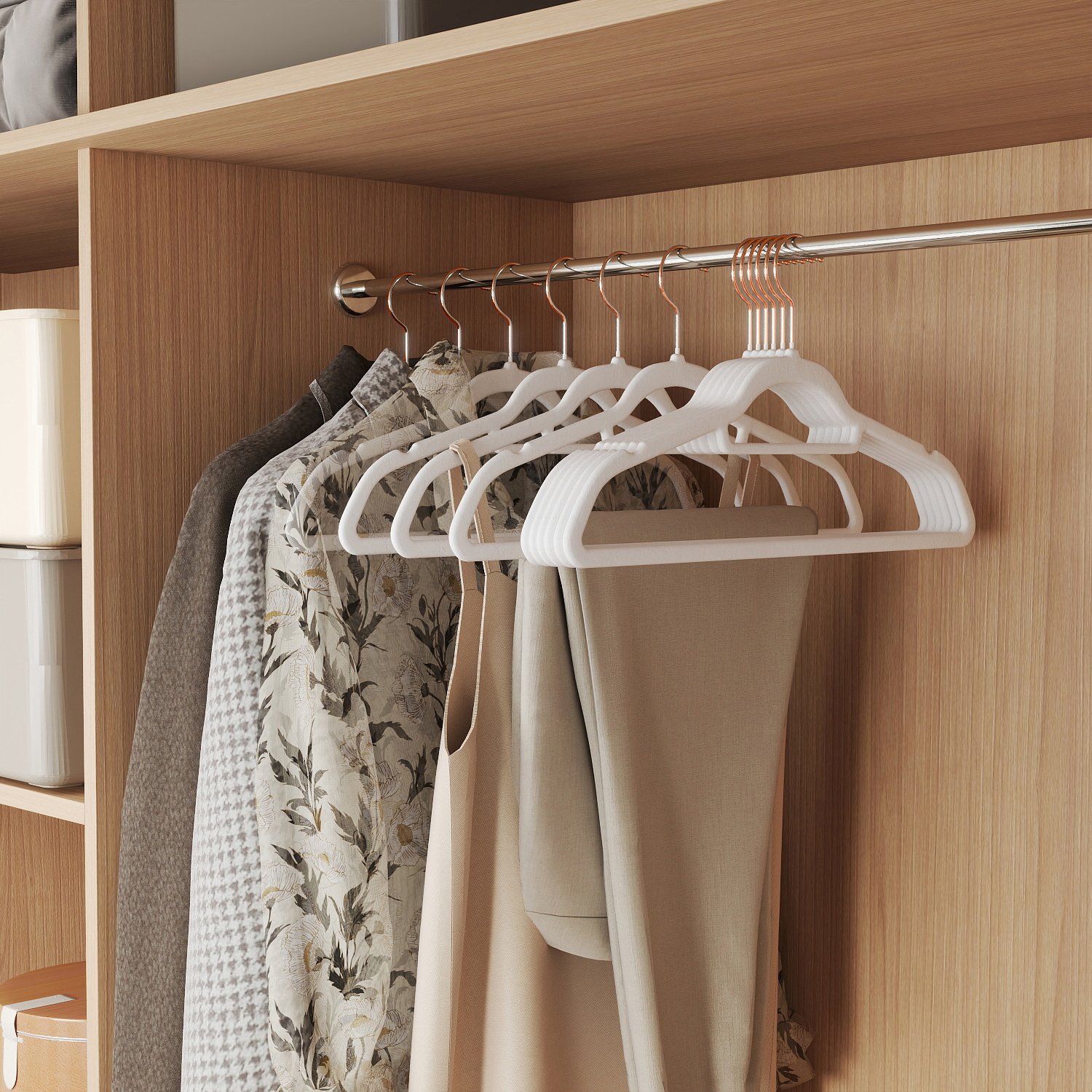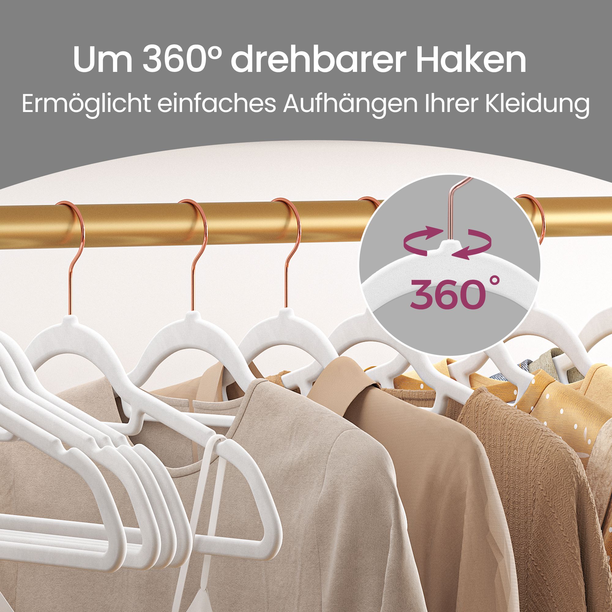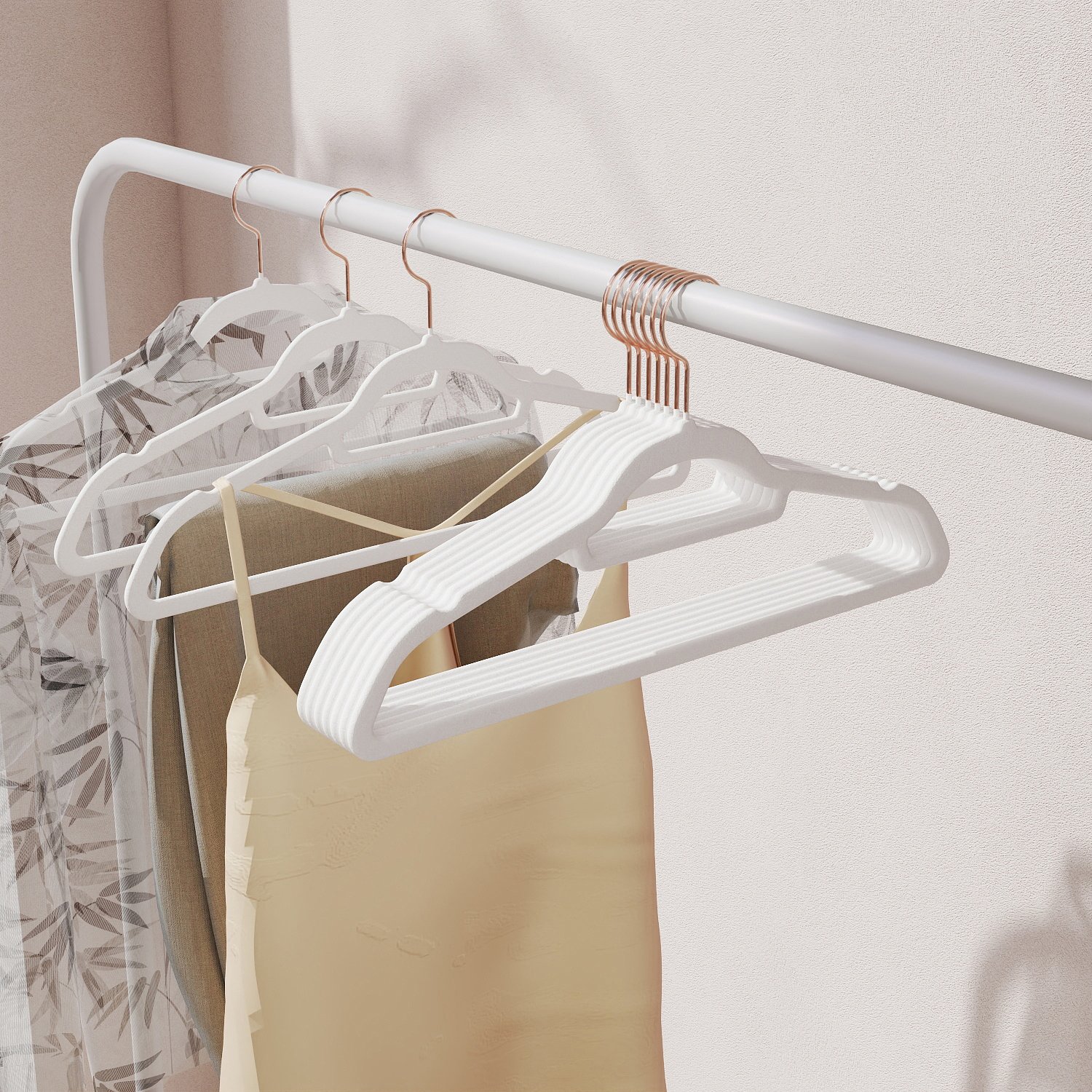 Clothes hangers, a seemingly mundane accessory, make your everyday life so much easier. Thanks to their simple, practical design, SONGMICS hangers will whip your wardrobe into shape. Choosing an outfit in the morning will be fun again! Double the space in your closet Compared to wire hangers, these 0.6 cm thin velvet hangers take up less space, so you can fit twice as many clothes in your wardrobe. A perfect solution for limited closet space! So strong, yet so gentle These jacket hangers are strong enough to hold even your heavy winter coats. But they also have a gentle side—thanks to their pleasantly soft surface, even your most delicate clothes can be hung up neatly and wrinkle-free. These 50 colorful hangers not only look good, but also serve as practical everyday helpers. There’s room for your entire outfit on these hangers. Not only can you hang jackets, shirts, or sweaters on them, but thanks to the small center bar, you can also hang ties, belts, and scarves. Simply place pants over the sturdy crossbar. Product details: – Color: white – Material: velvet, ABS plastic, metal hooks – Size per hanger: 45 x 0.6 x 23.5 cm (L x W x H) – Weight per hanger: 78 g – Max. static load capacity per hanger: 5 kg Scope of delivery: – 50 x velvet hangers SONGMICS notes:- Please do not hang wet clothes on the hangers. – Keep the hangers away from sources of heat and ignition. – Do not use the hangers in an environment with high temperatures or high humidity. – H&