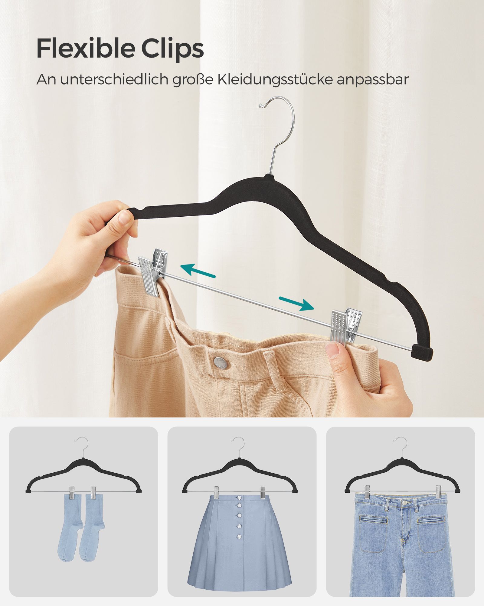 SONGMICS Trouser Hangers, Set of 12, 42.5 cm Velvet Hangers with Adjustable Clips, Heavy Duty, Non-Slip and Space-Saving, for Trousers, Skirts, Jackets, Dresses, Tank Tops, White CRF012W01