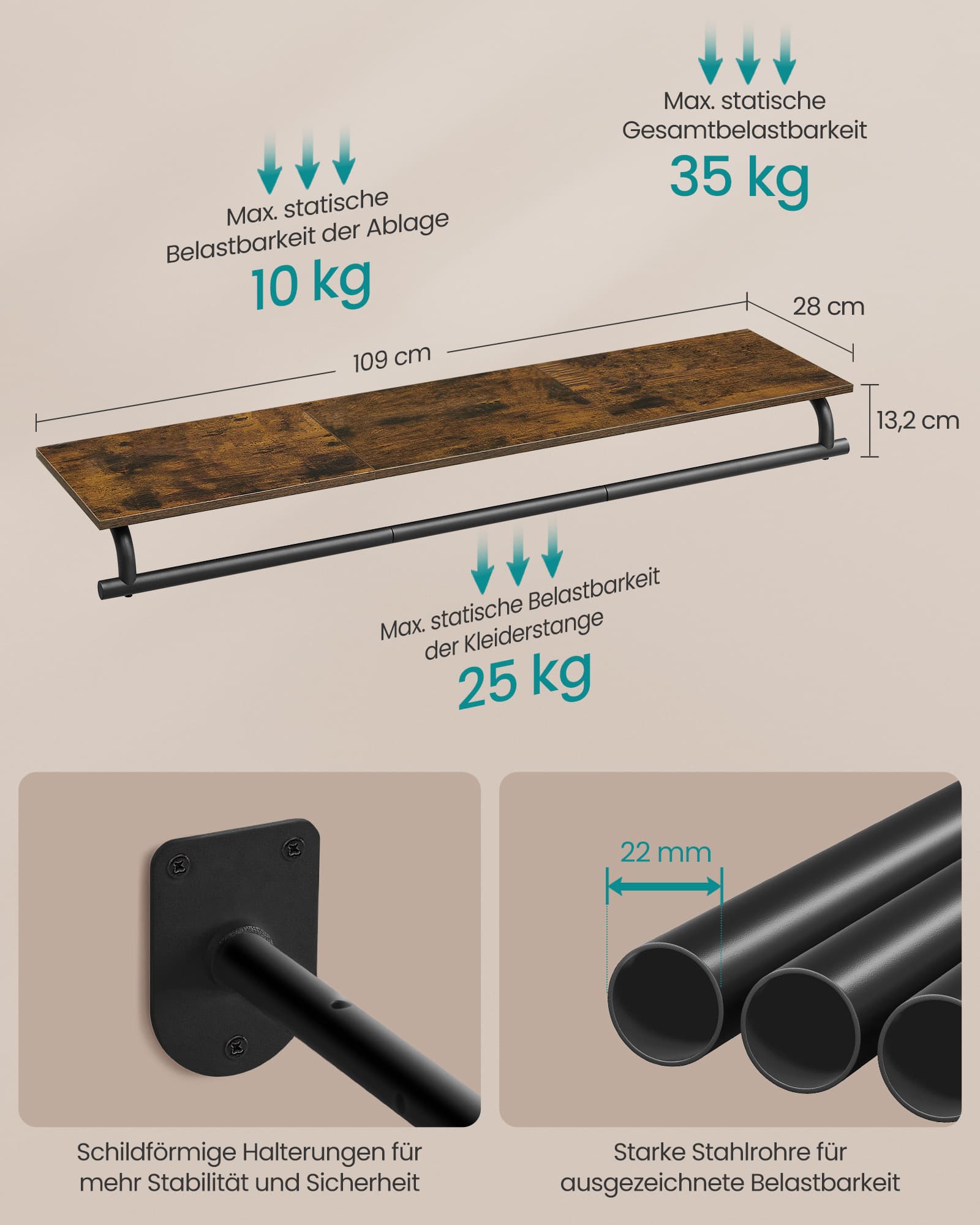 SONGMICS wall coat rack, coat rack, wall shelf with clothes rail, total load capacity 60 kg, 28 x 109 x 13.2 cm, for bedrooms, dressing rooms, natural beige-cloud white HSR135W01