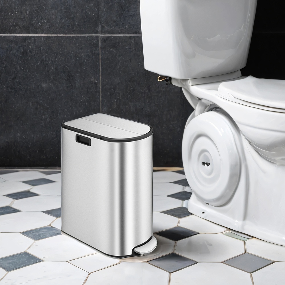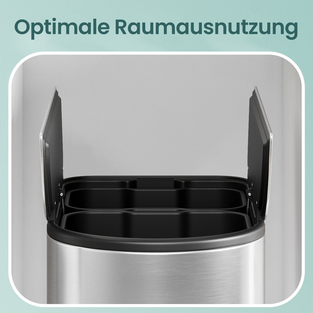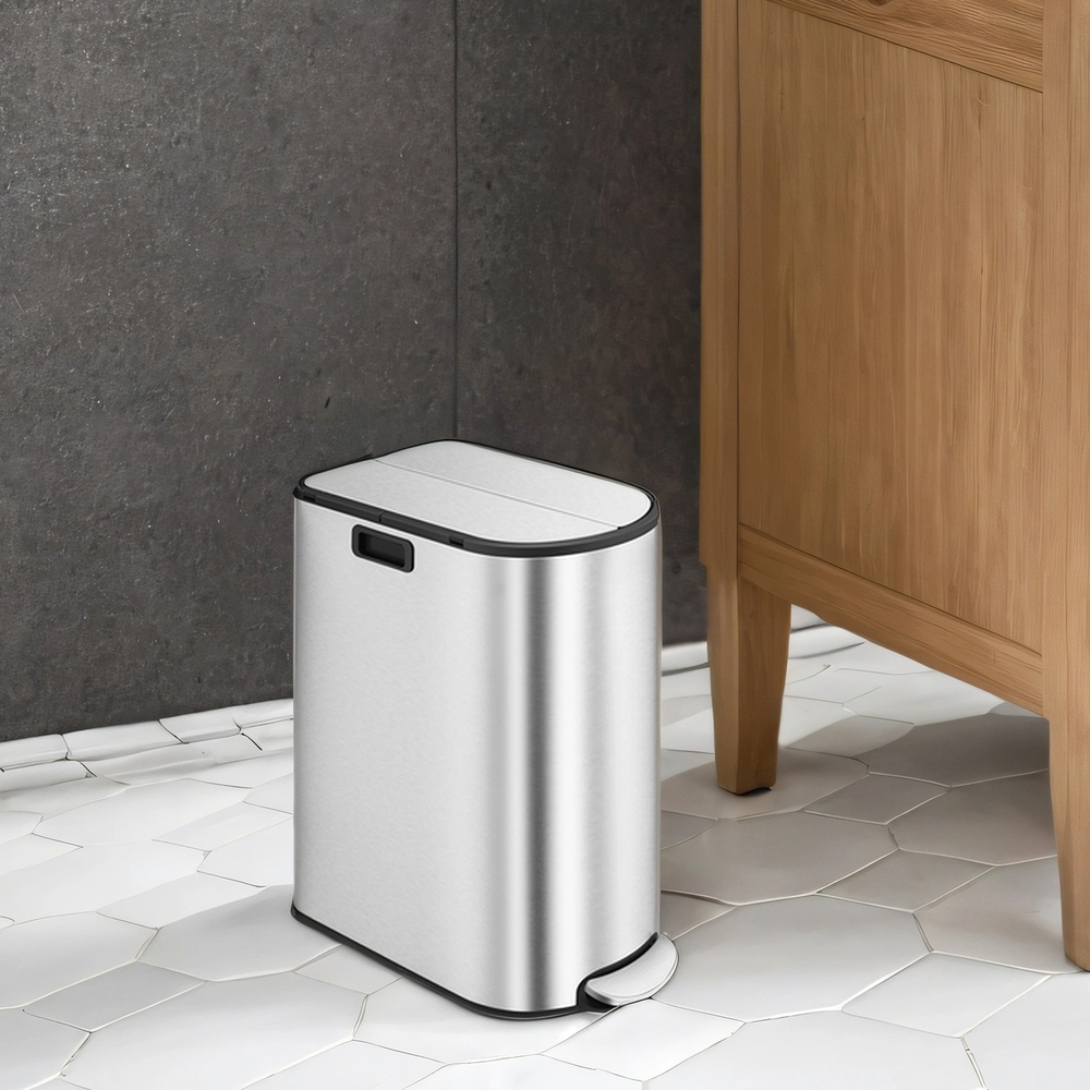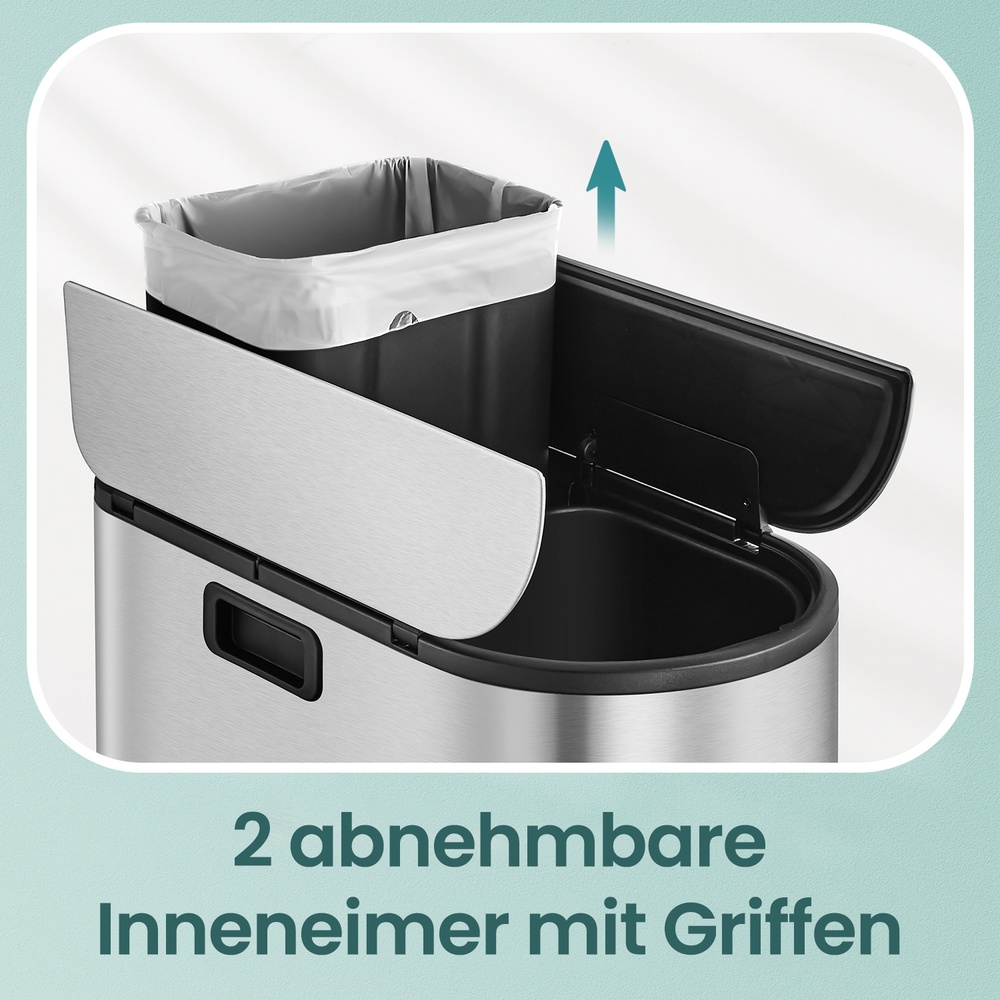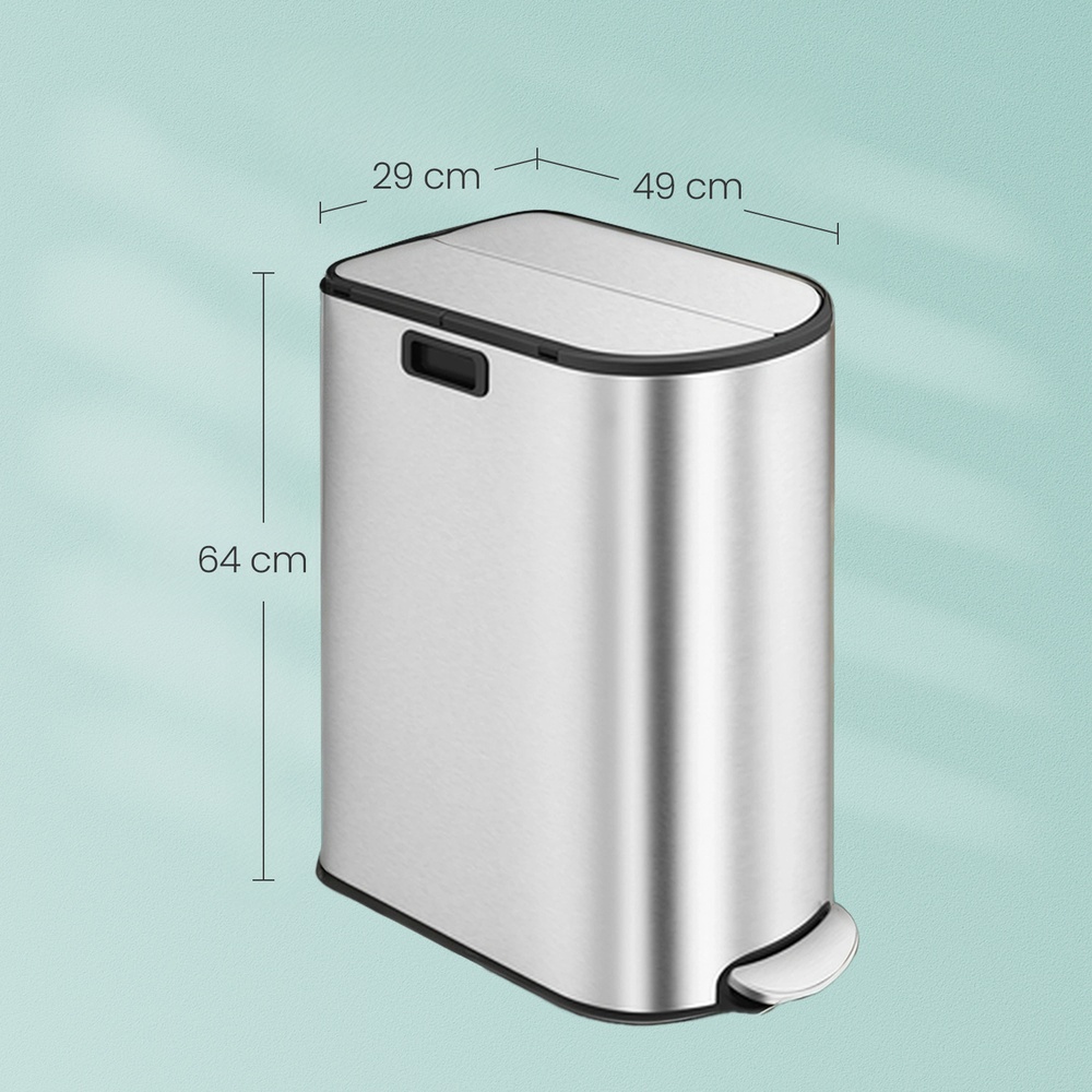SONGMICS Kitchen trash can, waste separation system with 2 compartments, 30 L and 20 L, narrow trash can, pedal bin for yellow bag and waste, with 2-piece lid, metallic