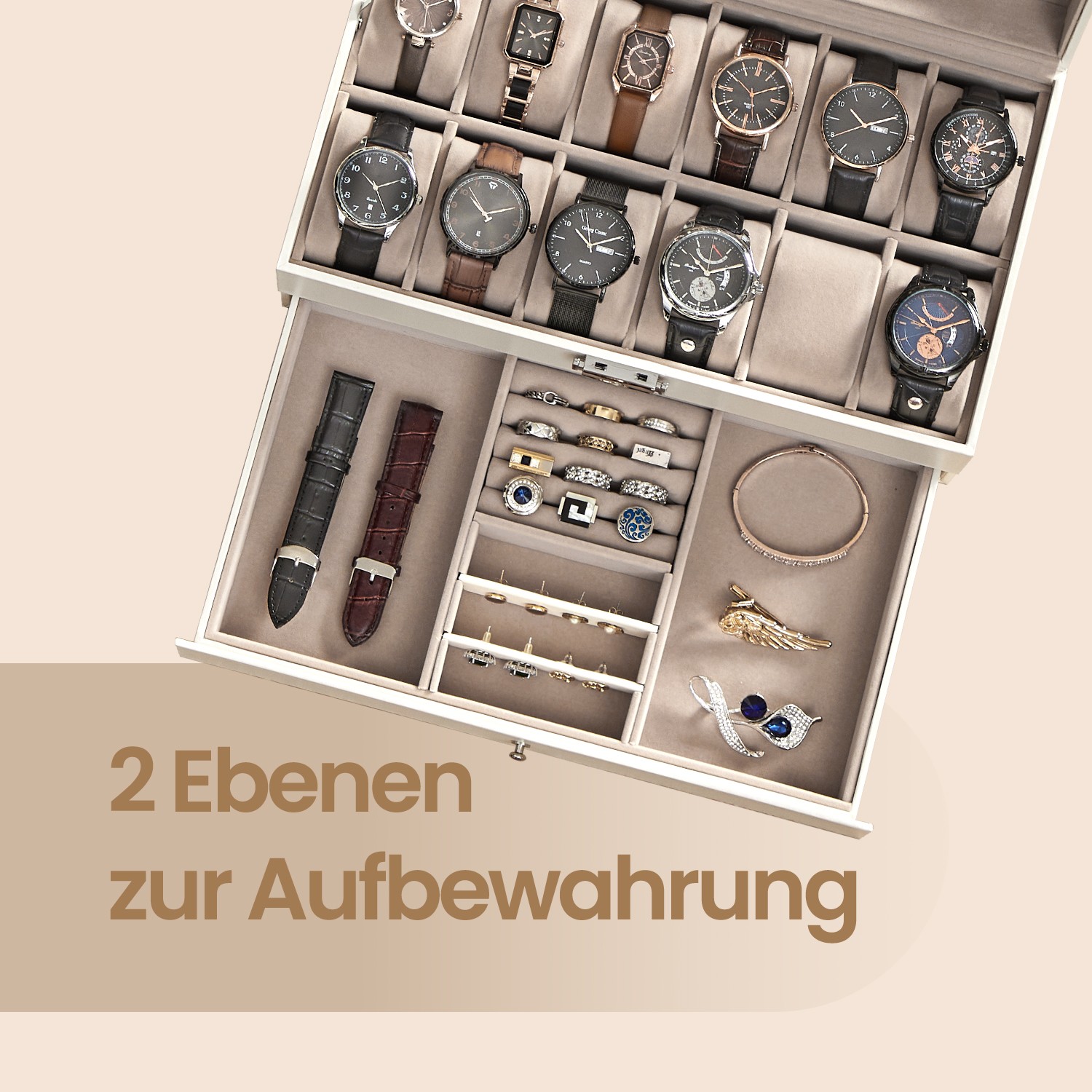 Watch box, watch case with glass lid, 2 levels, for 12 watches, lockable, 1 drawer, for rings, bracelets, PU cover in brown, interior lining in brown