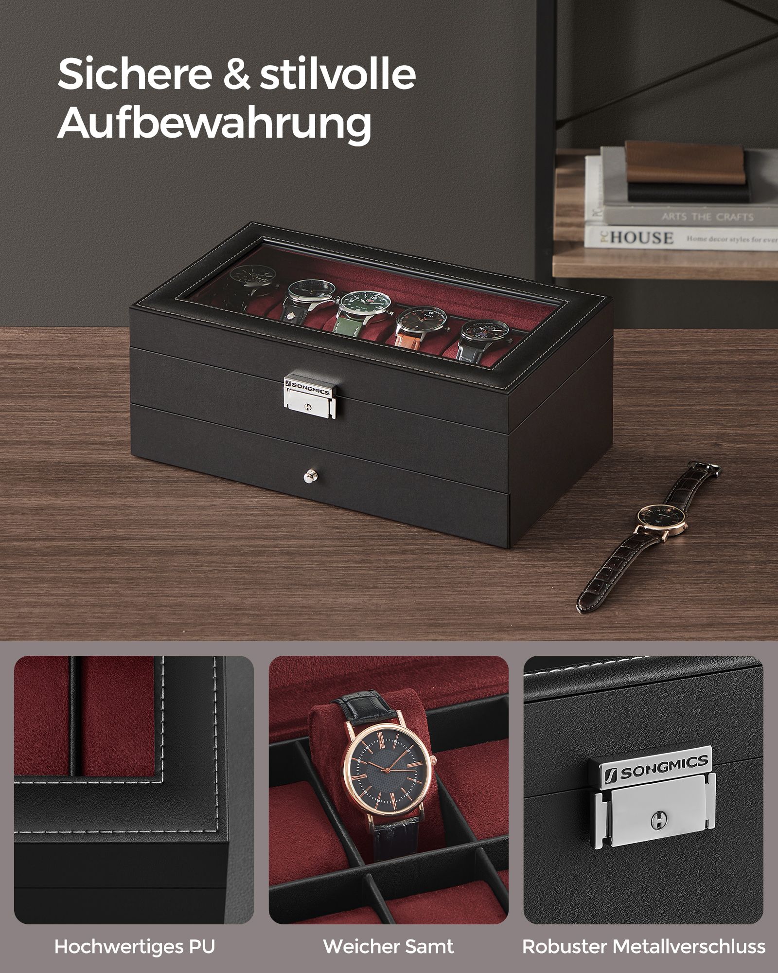 Watch box, watch case with glass lid, 2 levels, for 12 watches, lockable, 1 drawer, for rings, bracelets, PU cover in brown, interior lining in brown