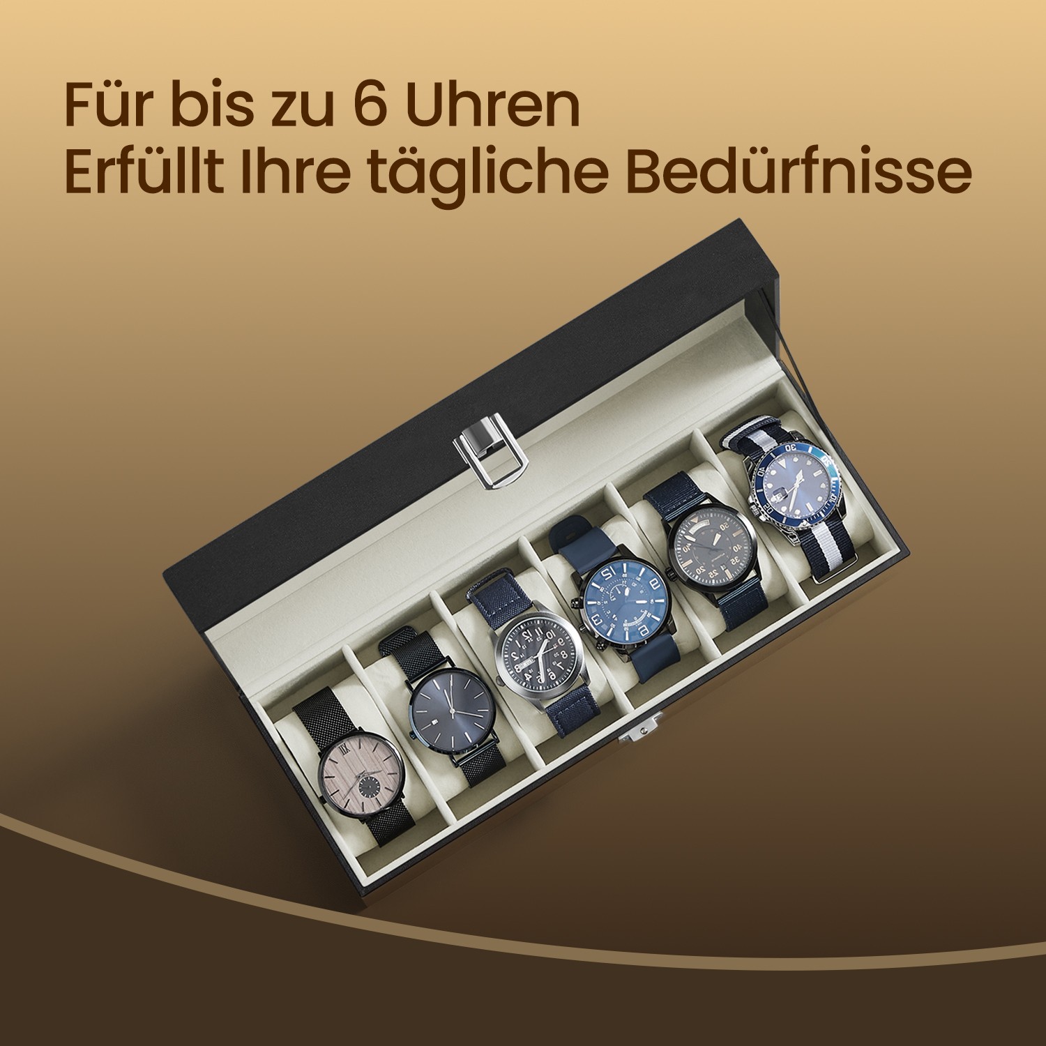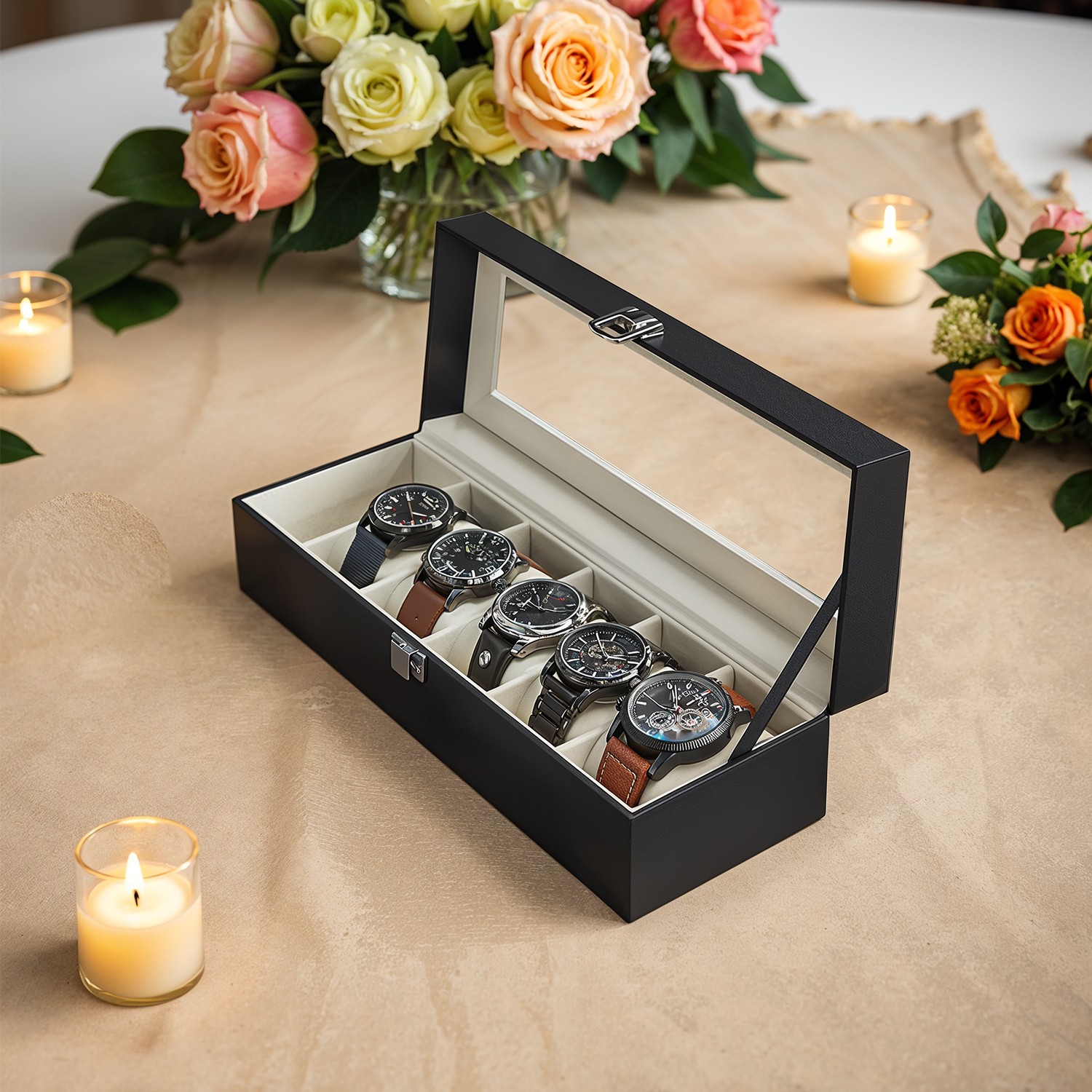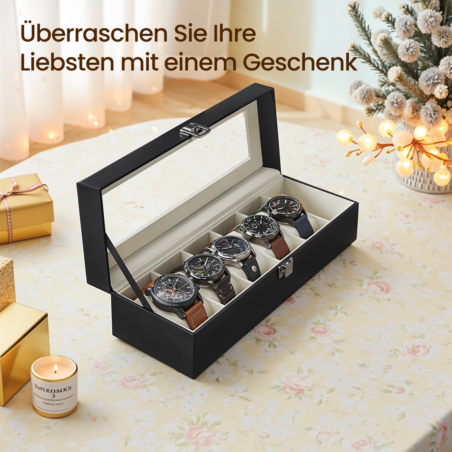 Where on earth is my watch? Do you always forget where you put your watch? This classic, elegant watch box with a glass lid offers space for 6 timepieces that were previously gathering dust on your bedside table or languishing in a chest of drawers. Protection is a priority Whether you are an avid watch enthusiast or have just started collecting, you should protect your treasures. The high-quality velvet lining, slim-shaped cushions, and glass lid of this watch box are ideal for protecting your watches from scratches. What’s more, the box provides the perfect display space for your timepieces, allowing you to admire them at any time or show them off to your friends. A perfect gift idea Do you know a watch lover? This watch storage box is a perfect gift for your father, boyfriend, or husband—whether for a birthday, Father’s Day, Valentine’s Day, graduation, or Christmas. If you currently keep your personal watch in your girlfriend’s jewelry box, you can also treat yourself to this chic accessory. Product details: – Color: black cover, beige velvet lining – Material: MDF (medium-density fiberboard), velvet, PU, glass – Size: 30 x 11.2 x 8 cm (L x W x H) – Weight: 0.6 kg Scope of delivery: – 1 x watch box
