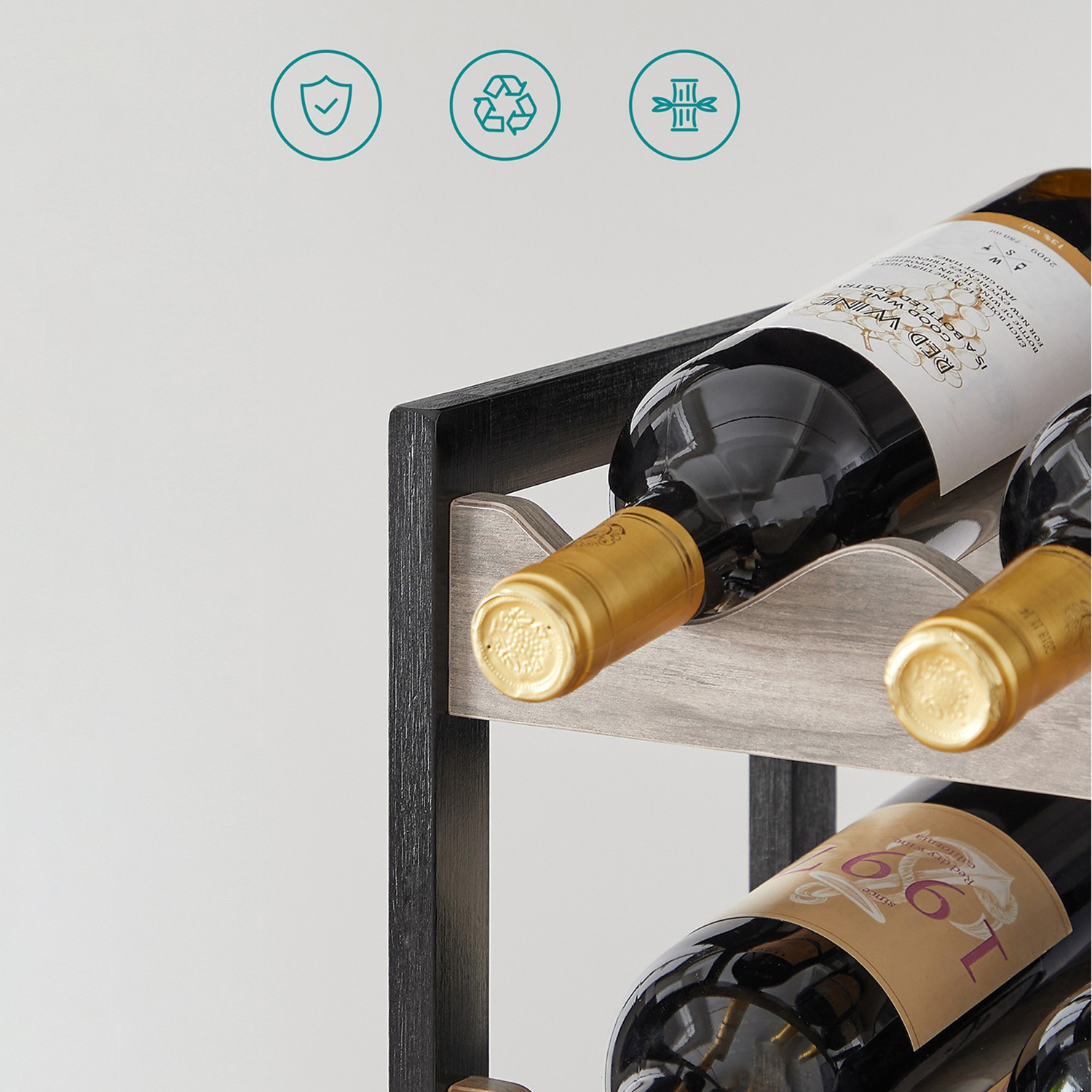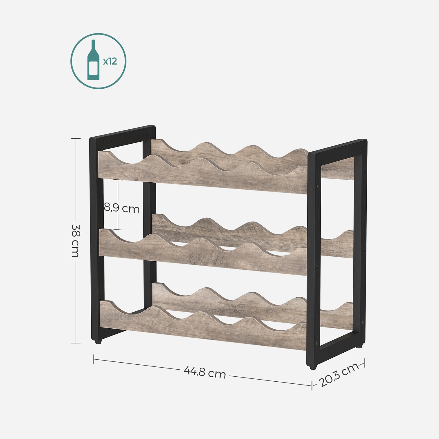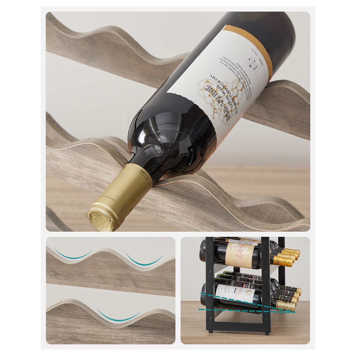 Planning a party? With this bottle rack, your home bar will always be ready. This wine rack offers 12 open compartments where you can display your wine collection. Apart from being a good storage option, this wine holder is also a great decorative piece that will enhance your wine collection. Thoughtful details: – Retro design in country house style. – Made of MDF and bamboo. – Easy to use and assemble. – 3 shelves that can hold 12 bottles. – Compact design for efficient and space-saving storage. – Unique wave-shaped design to prevent wobbling. Product details: – Color: Greige-black – Material: Bamboo, MDF (medium-density fiberboard) – Size: 20.3 x 44.8 x 38 cm (D x W x H) – Weight: 1.5 kg – Max. static load capacity per shelf: 15 kg Scope of delivery:- 1 x wine rack – 1 x accessory pack – 1 x instructions SONGMICS notes: – Avoid exposing the item to moisture for long periods of time. – Never touch with sharp objects that could damage the surface of the item. – Children must not climb on or play with the product.