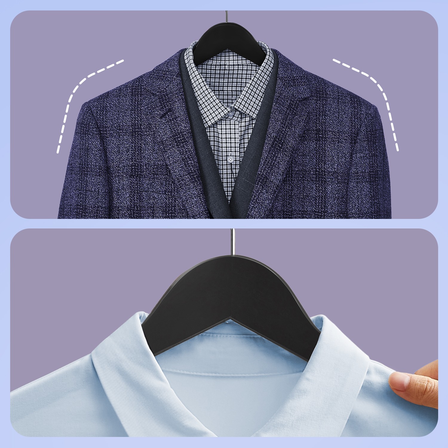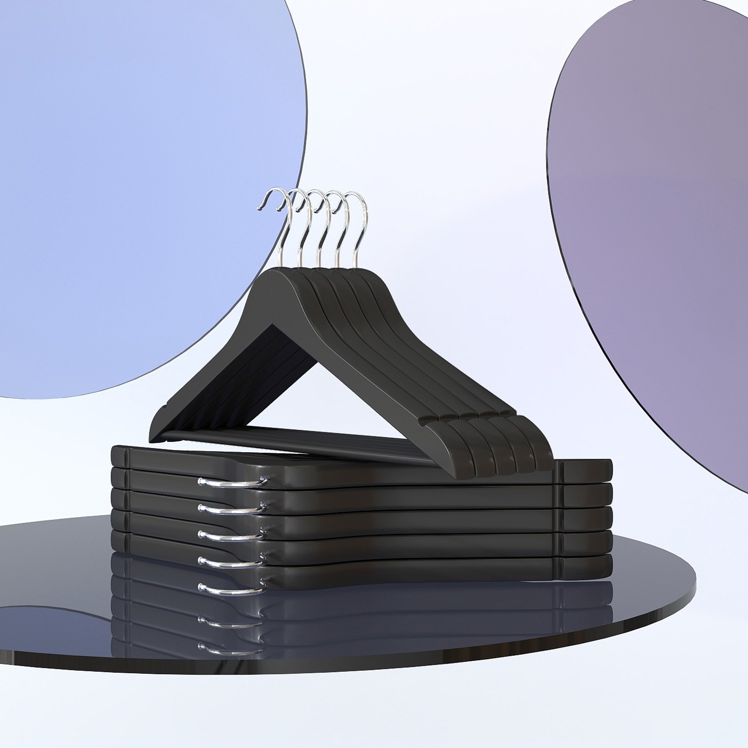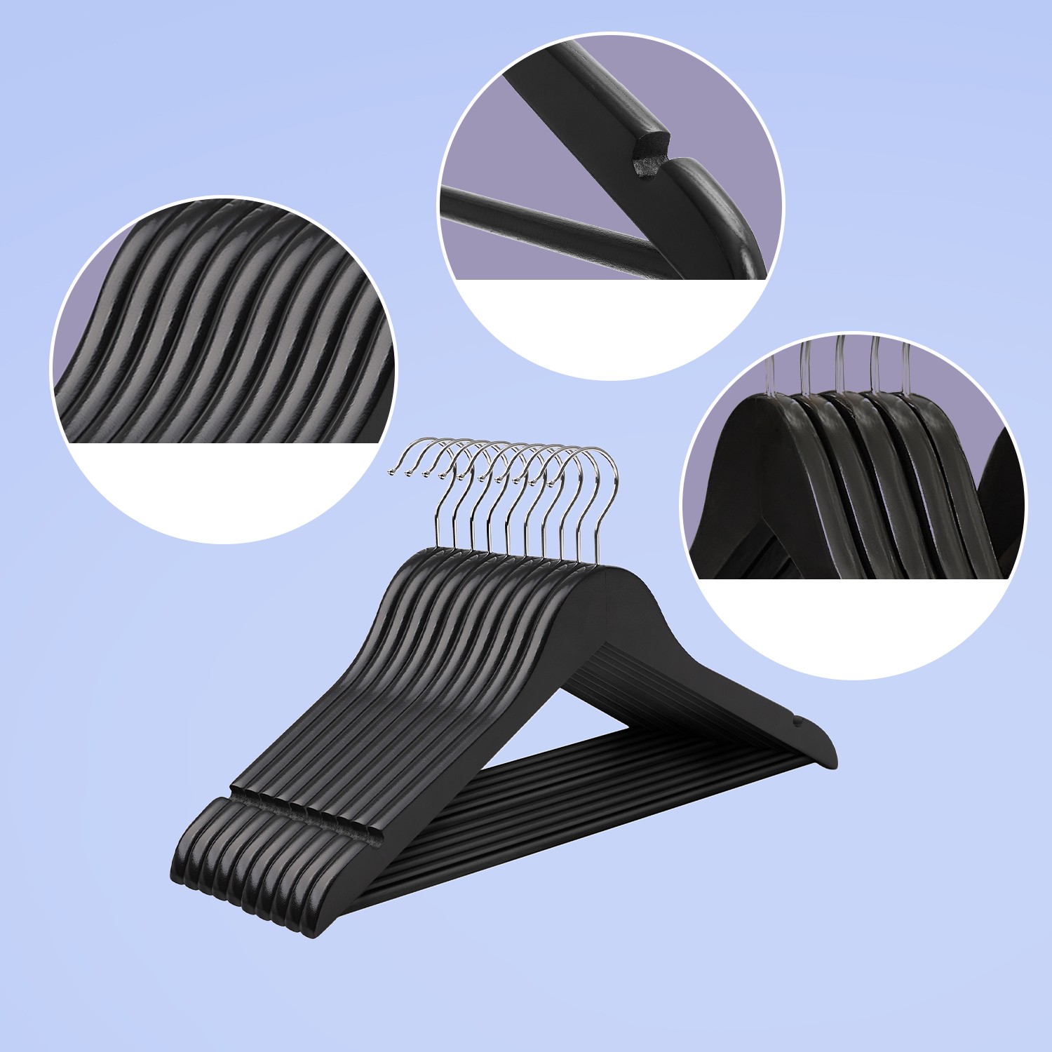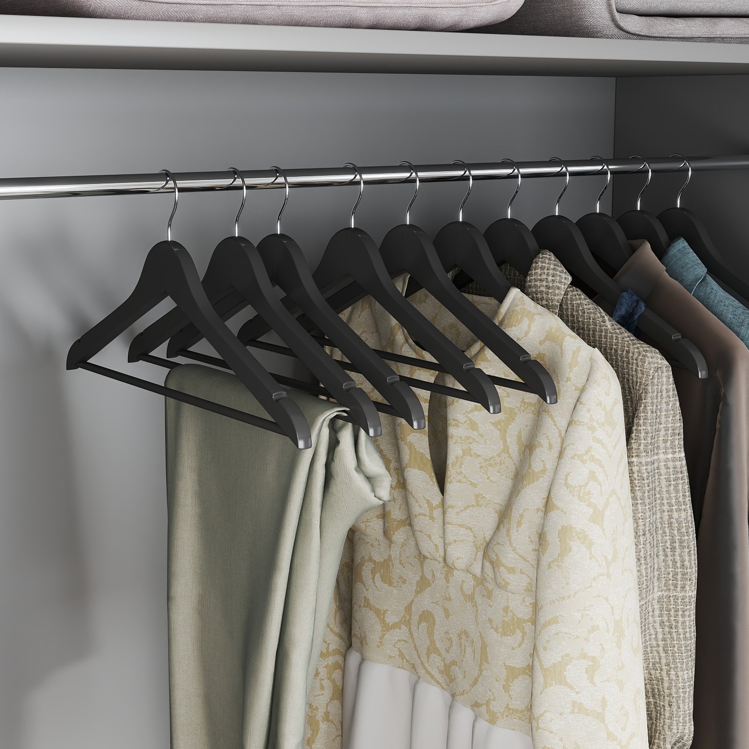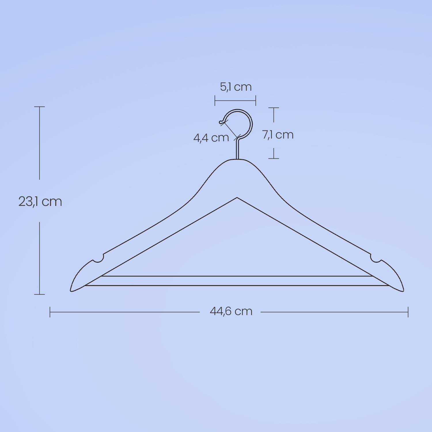 Are you always annoyed by clothes lying around everywhere? Are you looking for suitable hangers? These hangers from SONGMICS are the ideal solution! In addition to 2 practical skirt notches, the hangers have a trouser bar that not only allows you to hang up trousers, but also adds to the stability of the hangers. A high-quality, practical, and stable addition to your wardrobe. Product details: – Material: maple wood, chrome-plated metal hooks – Color: black – Dimensions: 44.5 x 23 x 1.2 cm (W x H x D) – Hook height: 7 cm – Hook width: 5 cm – Total weight: 2.4 kg Scope of delivery: – 20 x black wooden hangers