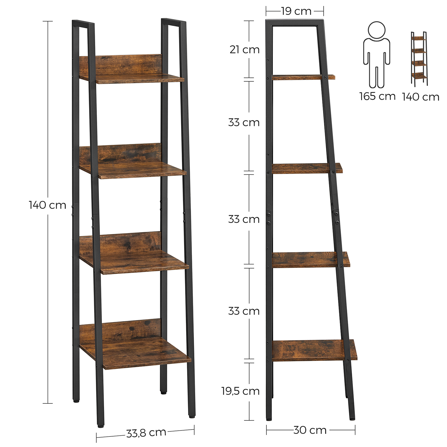 Product details: – Color: Vintage brown-black – Material: Chipboard, steel – Size: 33.8 x 30 x 140 cm (L x W x H) – Weight: 6 kg – Max. static load capacity per shelf level: 10 kg Scope of delivery: – 1 x ladder shelf – 1 x accessory pack – 2 x anti-tip brackets – 1 x instructions VASAGLE Notes: – Please secure this product to the wall using the anti-tip brackets provided. – For safety reasons, children are not allowed to climb on or play with the product.