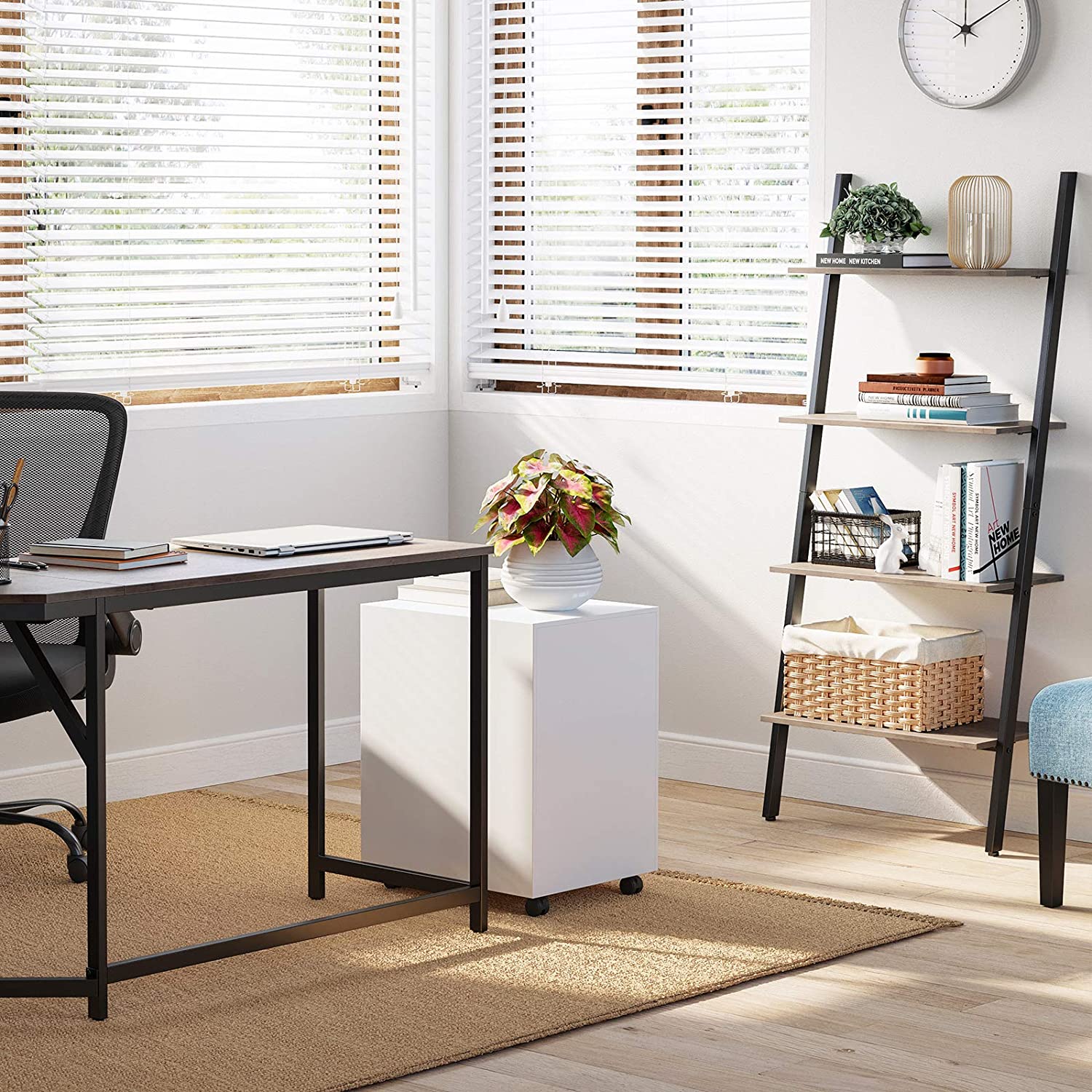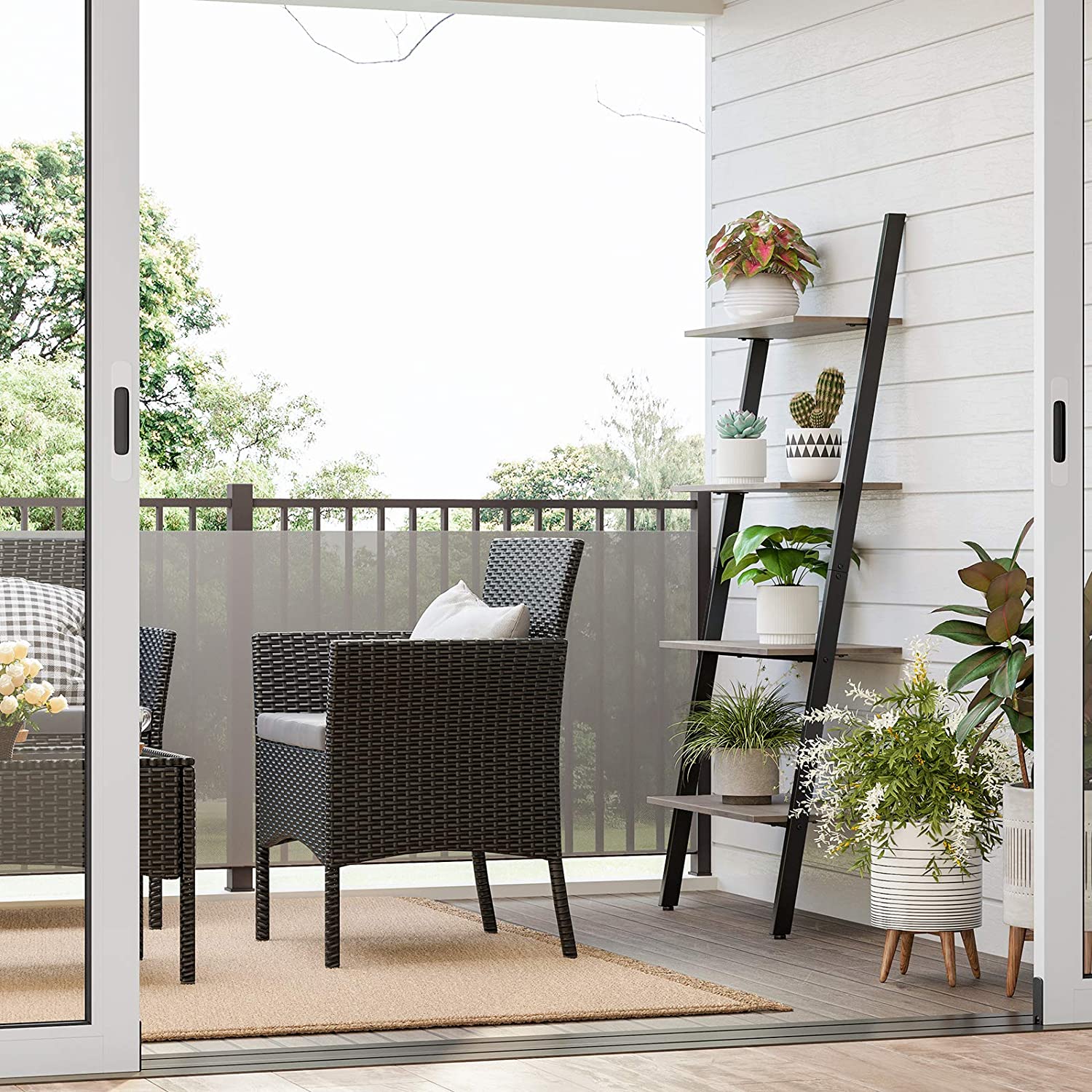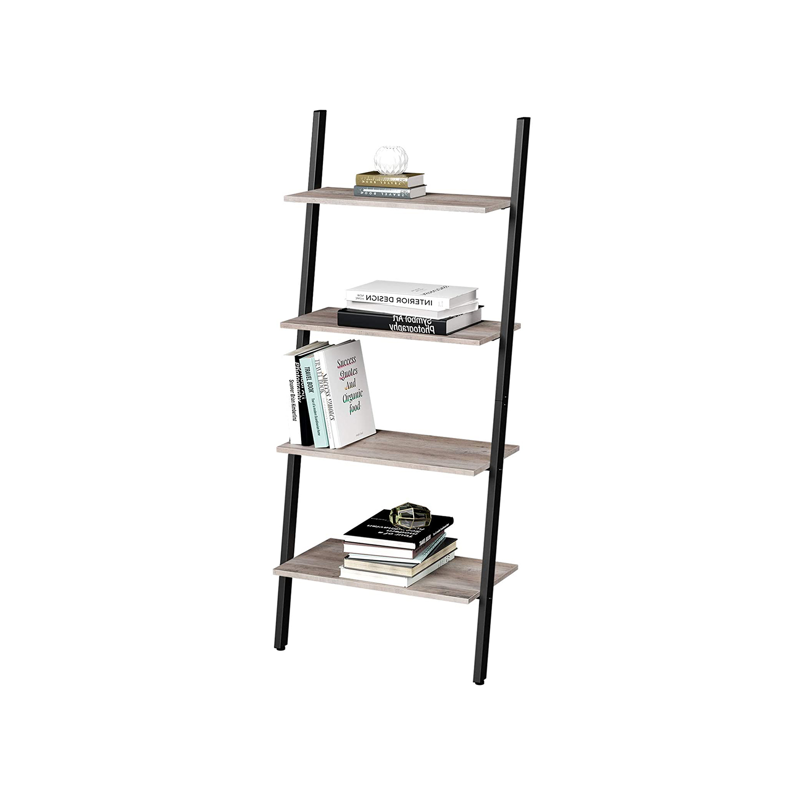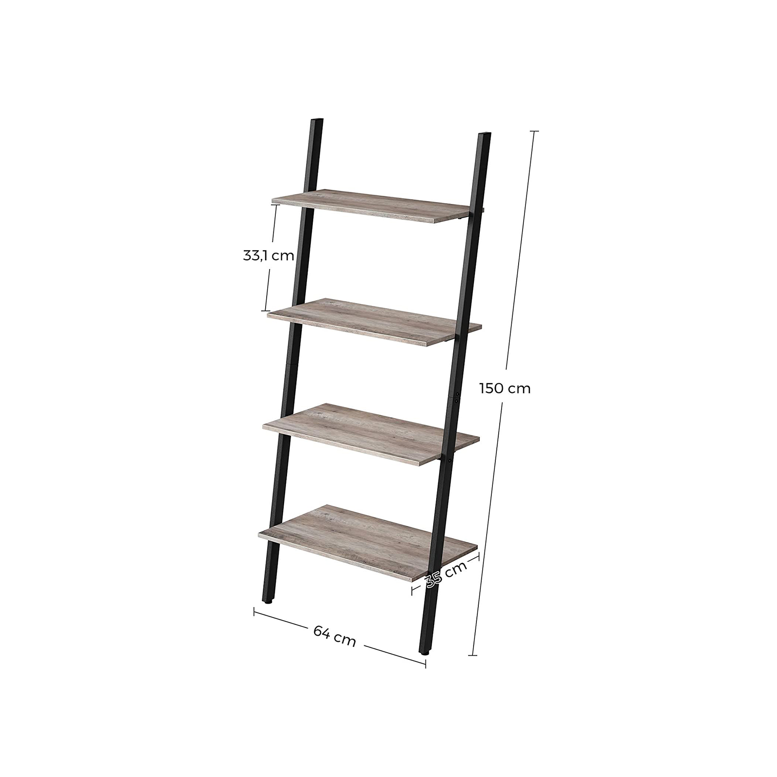 Product details: – Color: Greige-Black – Material: Chipboard, steel – Size: 64 x 35 x 150 cm (L x W x H) – Distance between each level: 33.1 cm – Weight: 10.2 kg – Max. total static load capacity: 40 kg Scope of delivery:- 1 x ladder shelf – 1 x accessory package – 1 x instructions (DE, EN, FR, ES, IT)