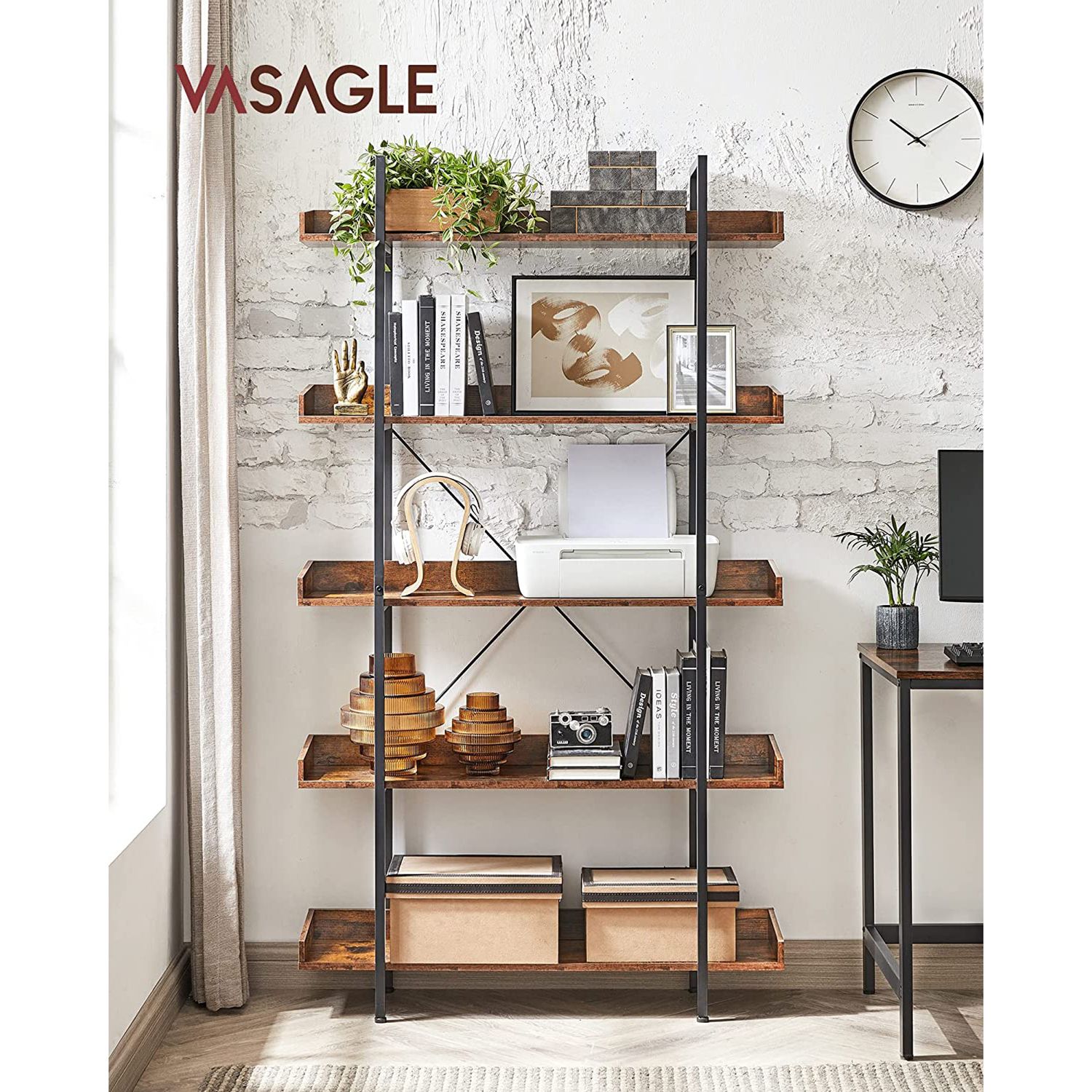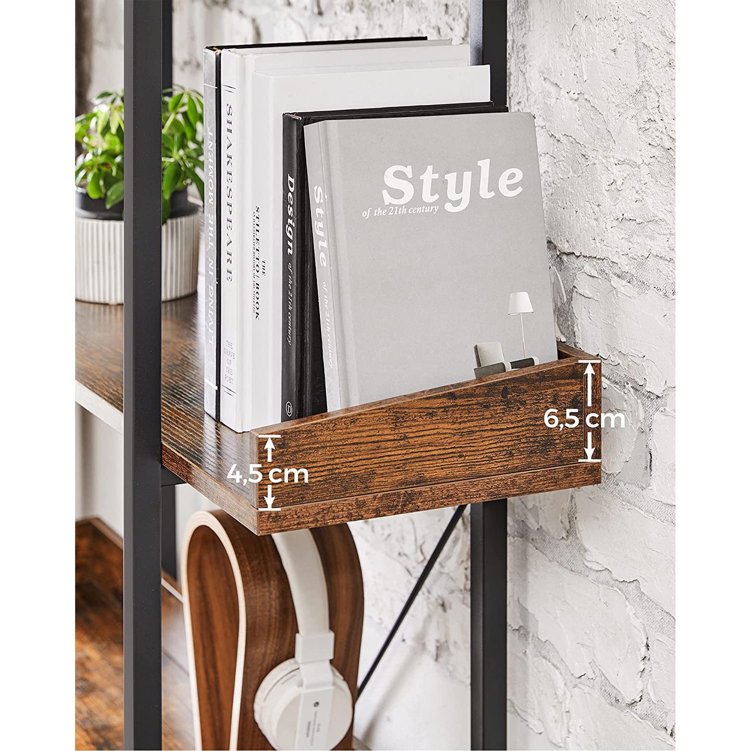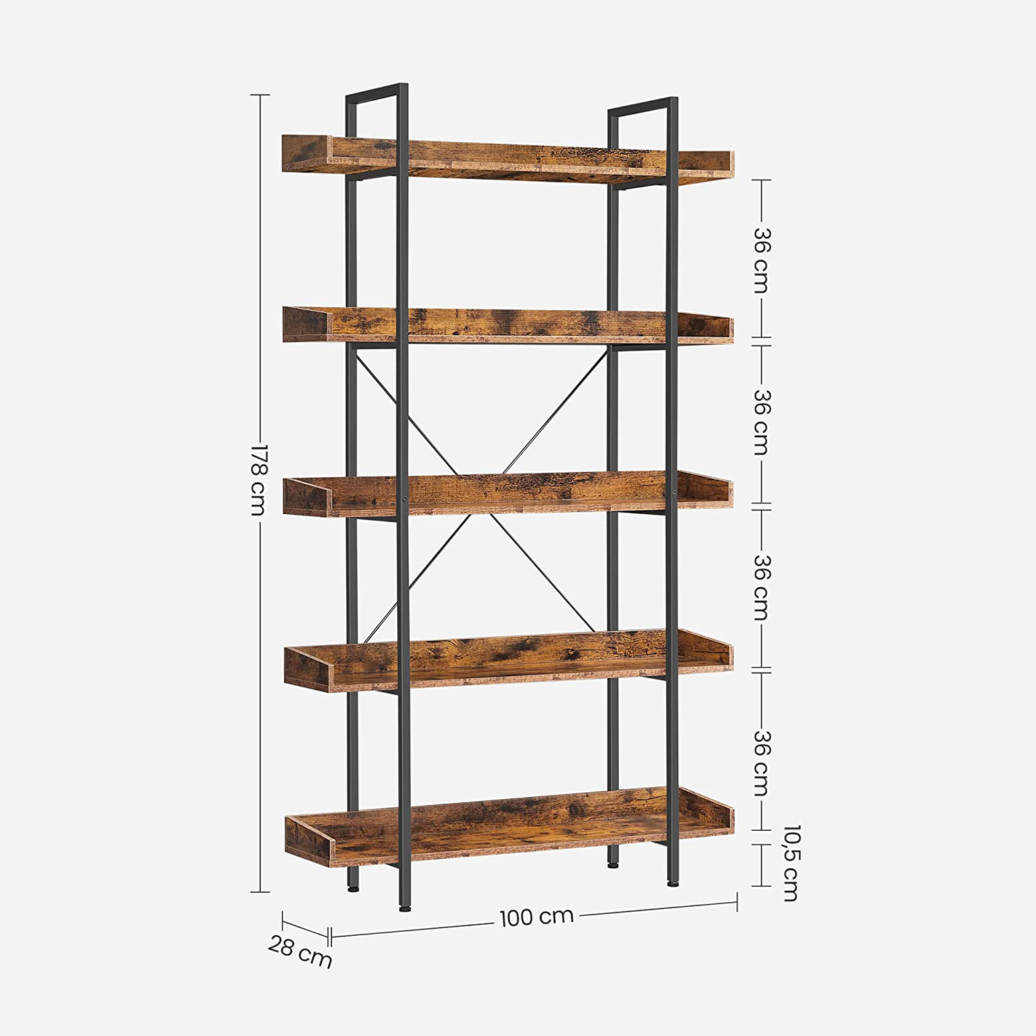 Product details: – Color: Vintage brown-black – Material: Chipboard, steel – Size: 100 x 28 x 178 cm (L x W x H) – Distance between shelves: 36 cm – Weight: 19.7 kg – Max. static load capacity per shelf: 36 kg – Max. static load capacity total: 180 kg Scope of delivery: – 1 x bookcase – 1 x accessory package – 1 x anti-tip device – 1 x instructions VASAGLE Notes:- For safety reasons, children are not allowed to climb on or play with the product. – Please secure this product to the wall using the included anti-tip device.