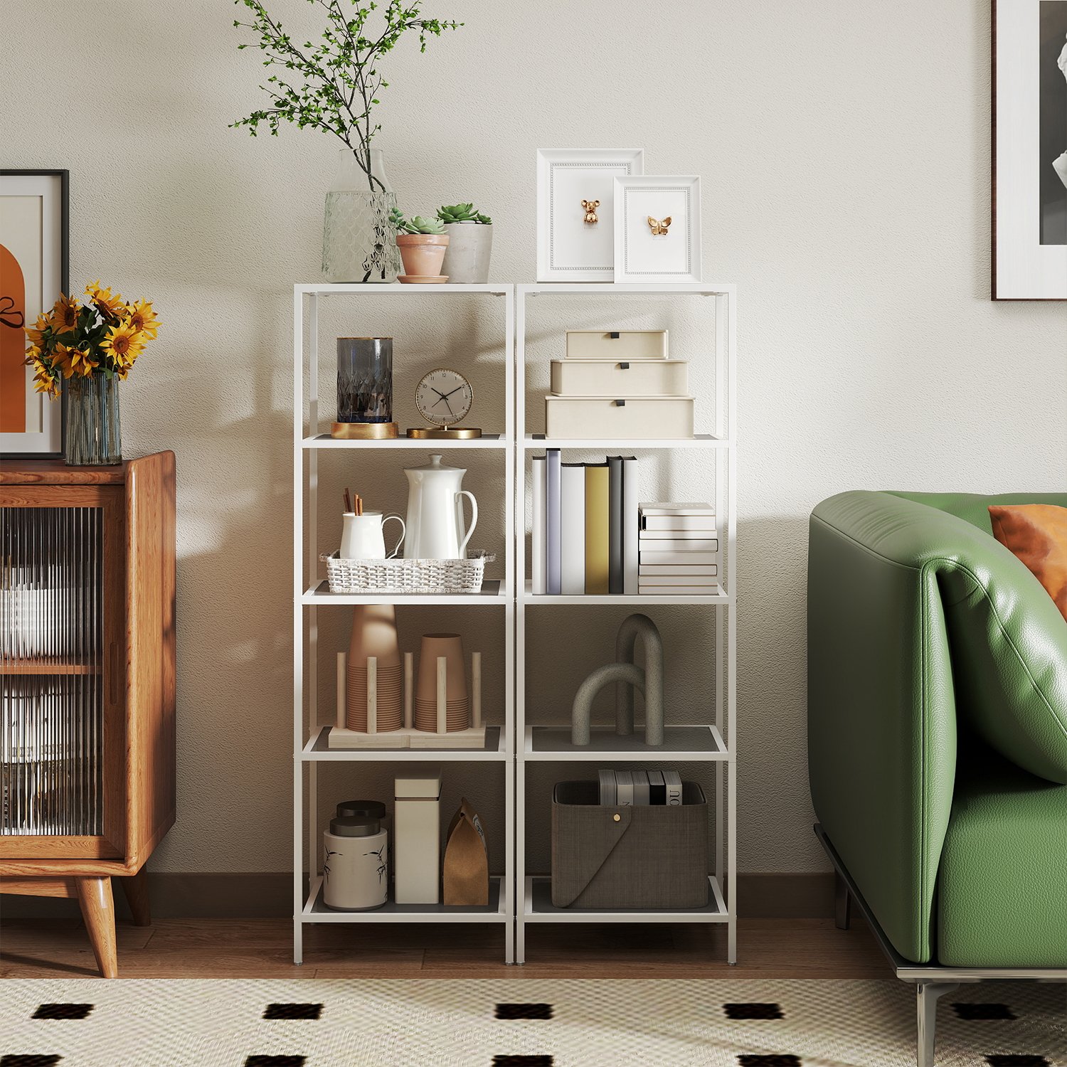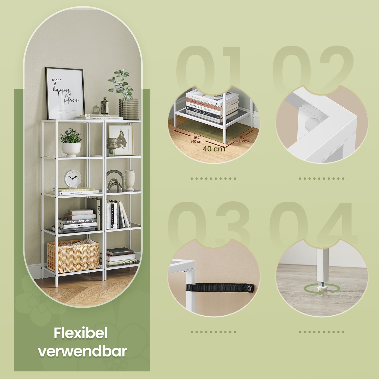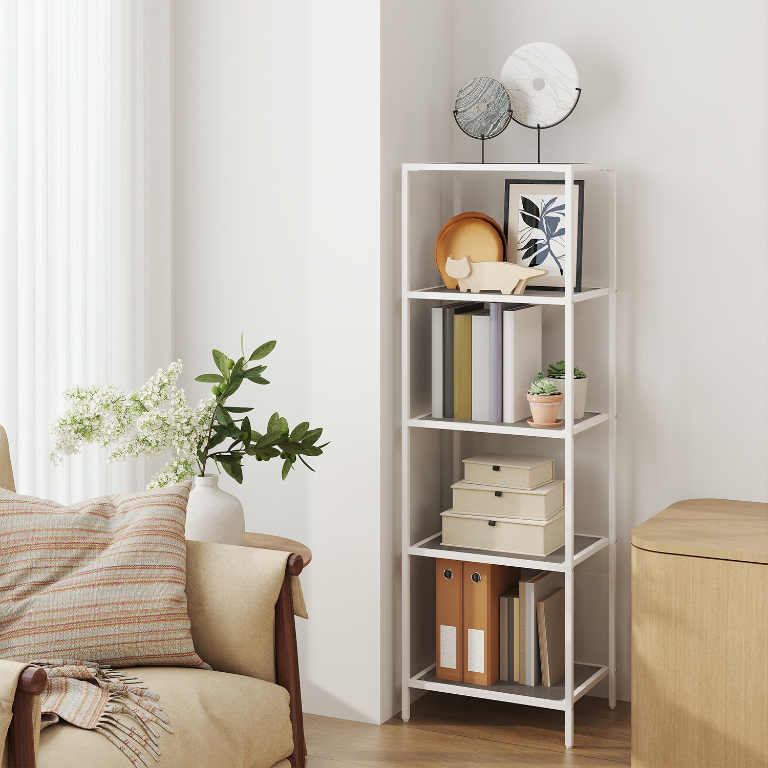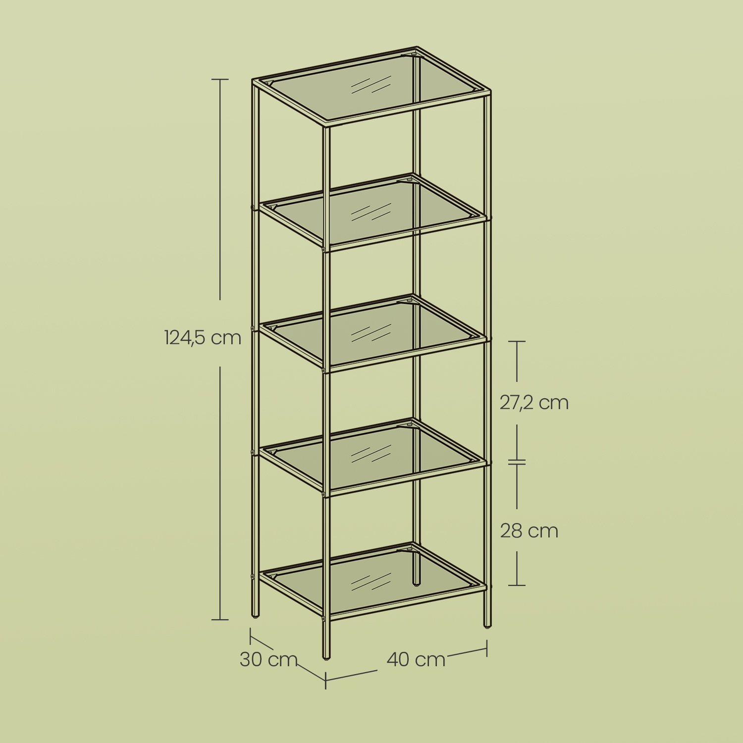 VASAGLE Standing shelf, bookshelf, bathroom shelf, 5 levels, kitchen shelf, narrow, shelf, bathroom shelf, for living room, bedroom, study, tempered glass, steel frame, gold color LGT029A01