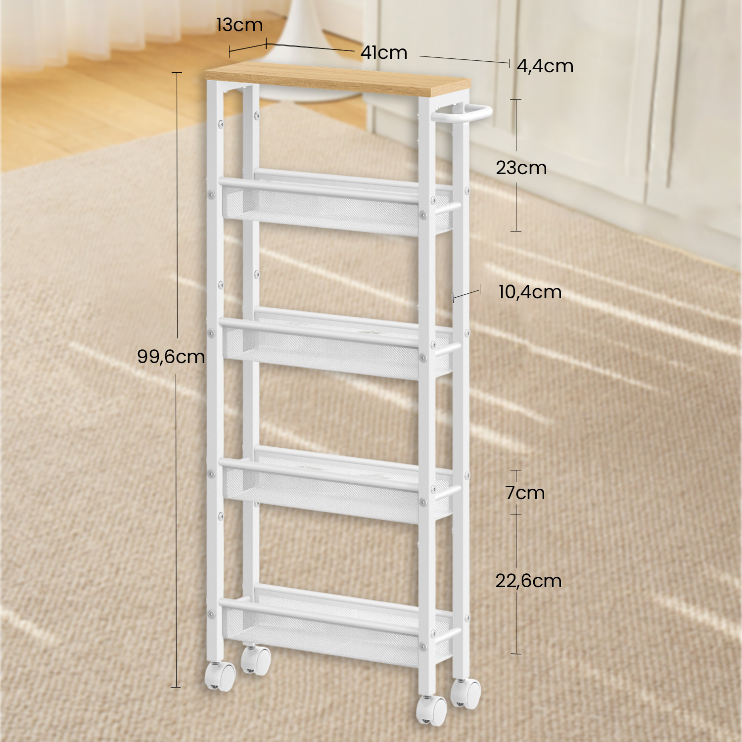 5-tier rolling cart, narrow kitchen cart, niche shelf on casters, steel, handle, small spaces, 13 x 45.4 x 99.6 cm, kitchen, bathroom, oak-colored white