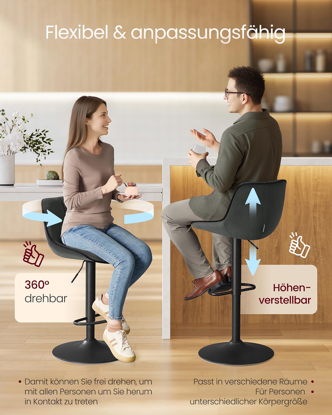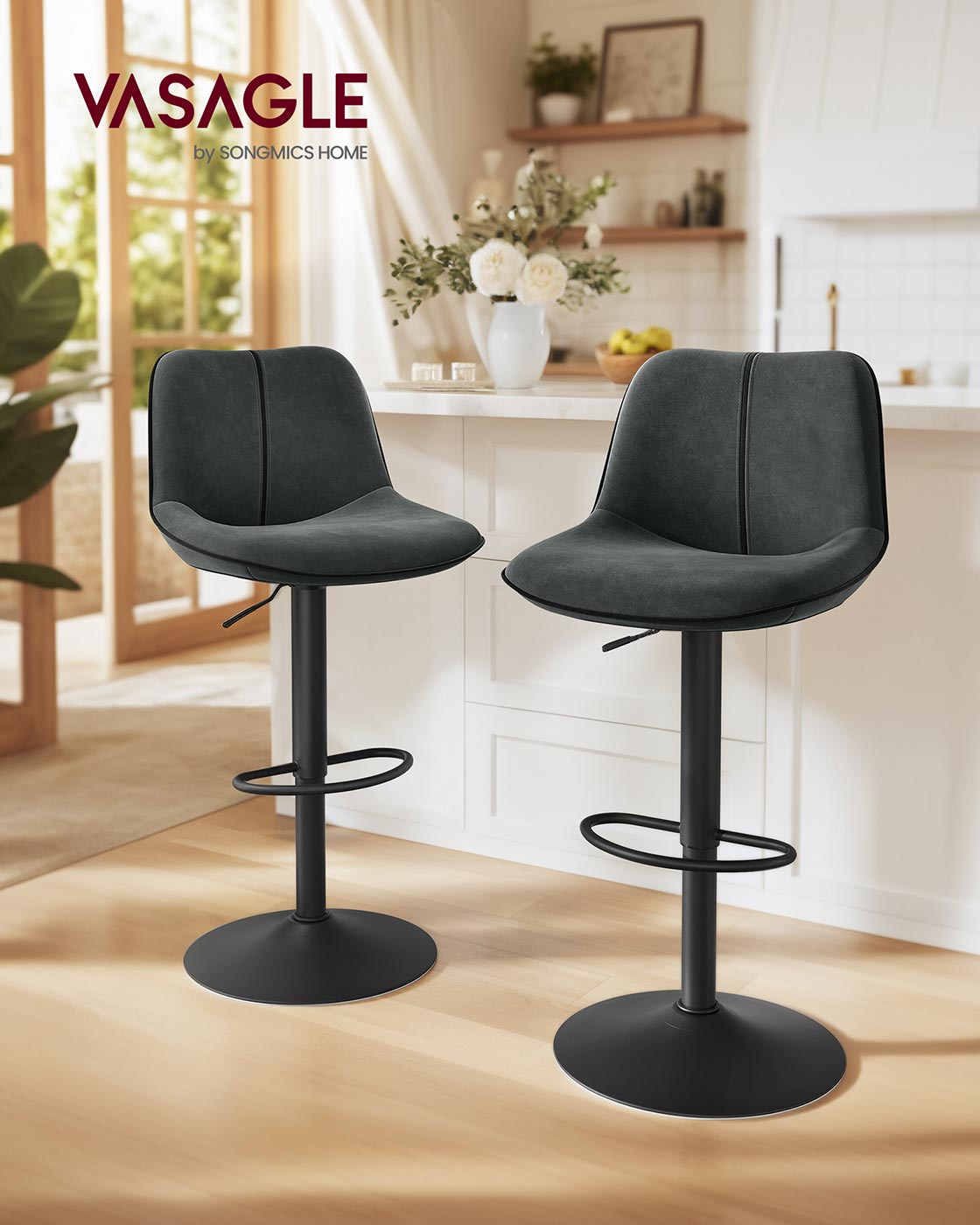 VASAGLE Bar Stool Set of 2, Height-Adjustable Bar Chairs, Swivel Kitchen Stools, with Ergonomic Backrest, Velvet, for Kitchen Island, Home Bar, Modern, Ink Black LJB188B01