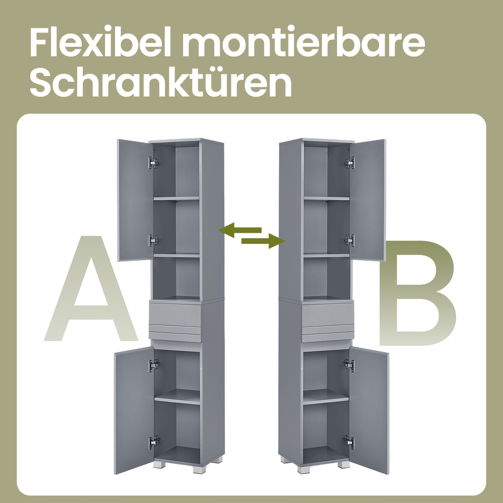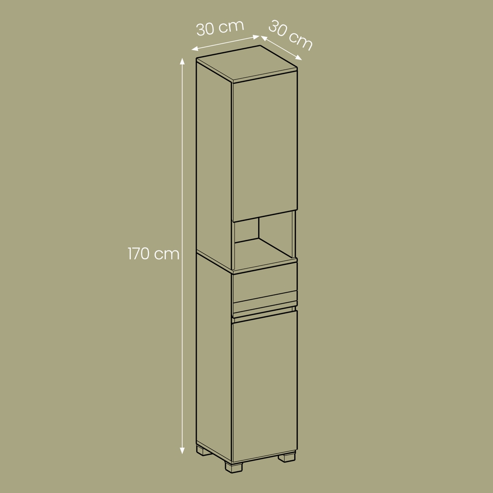 Bathroom cabinet, bathroom furniture with one drawer, adjustable shelves, open compartment, 30 x 30 x 170 cm, classic white