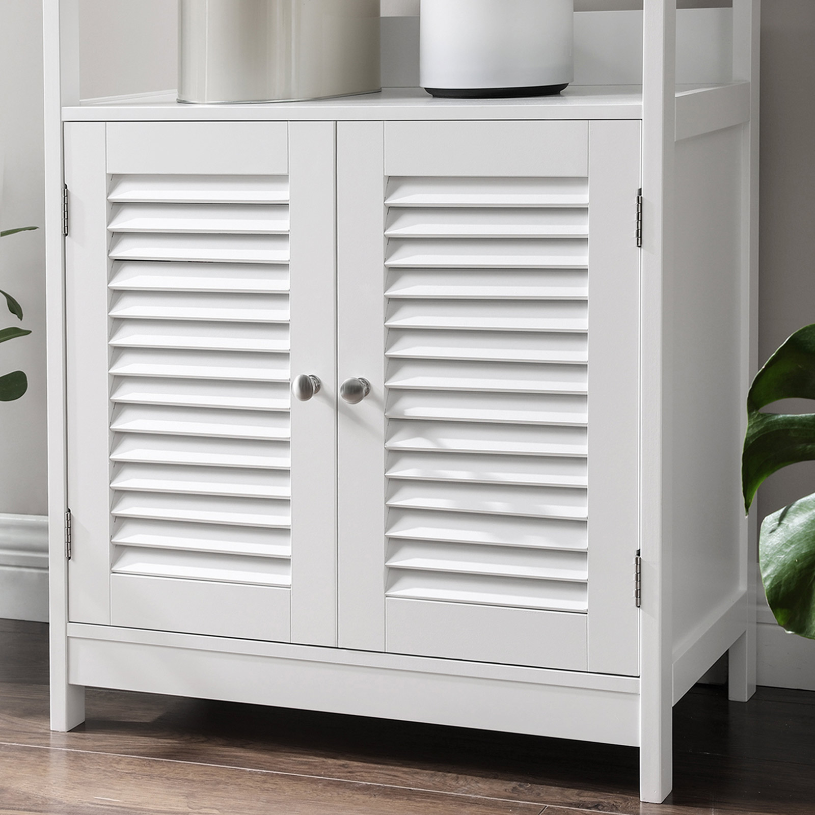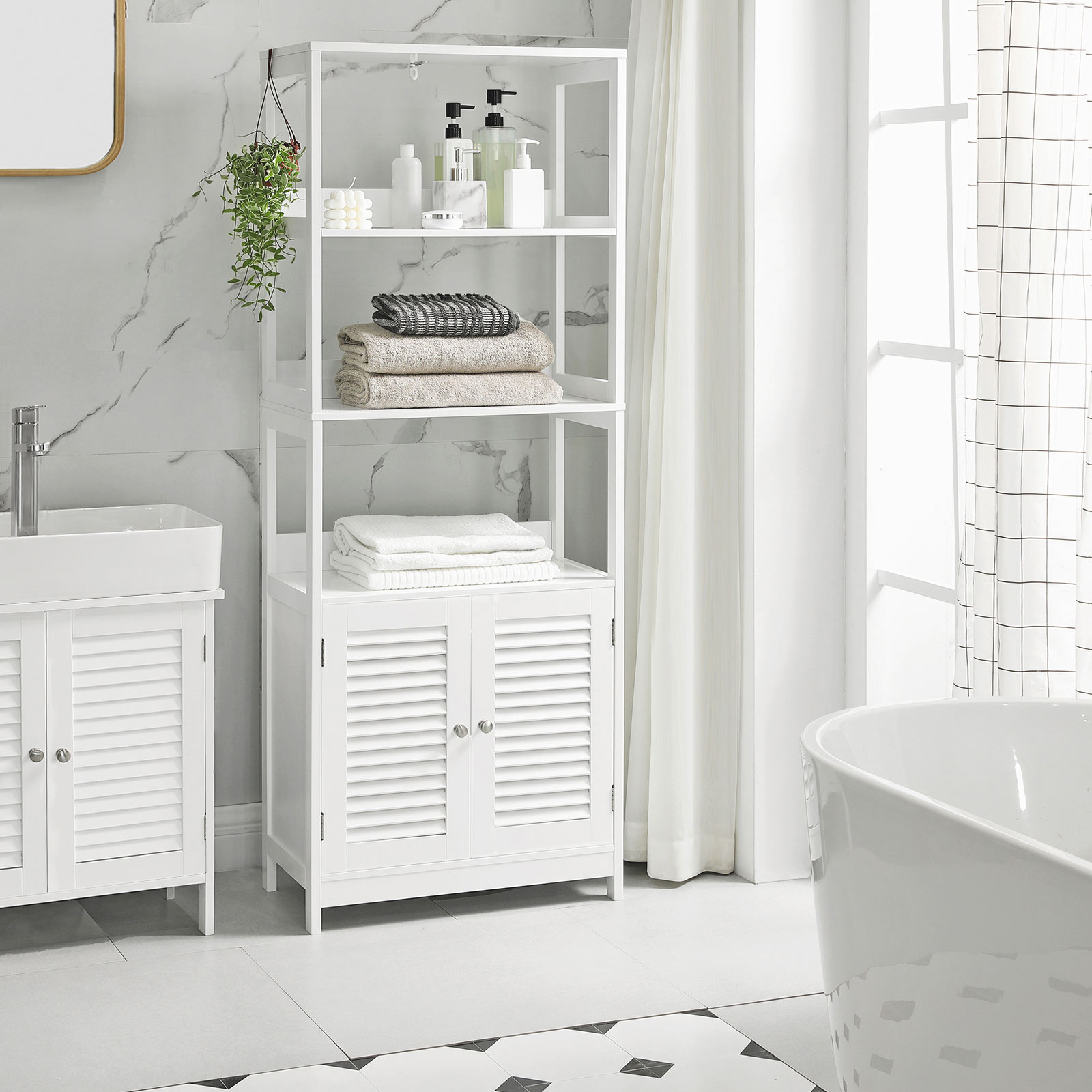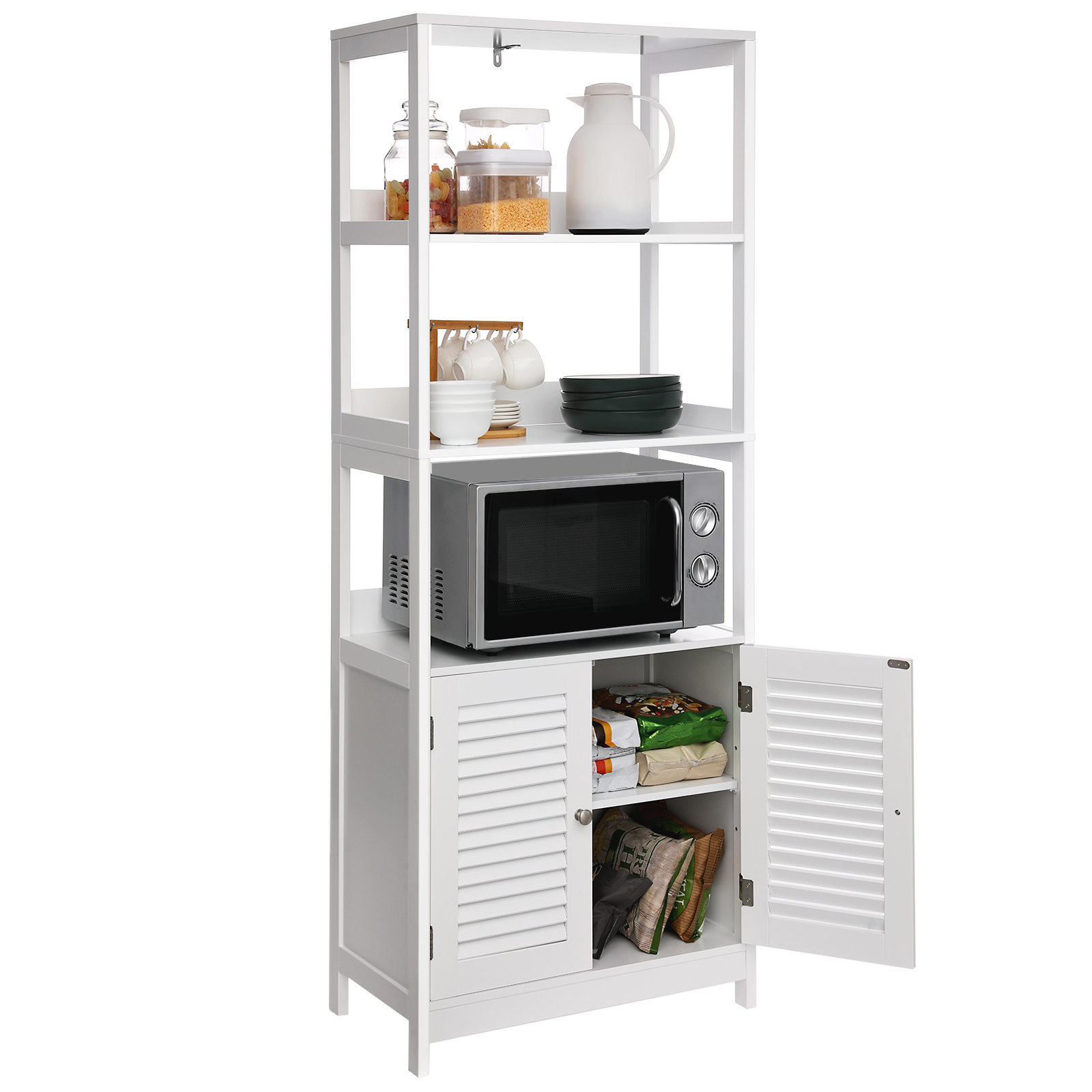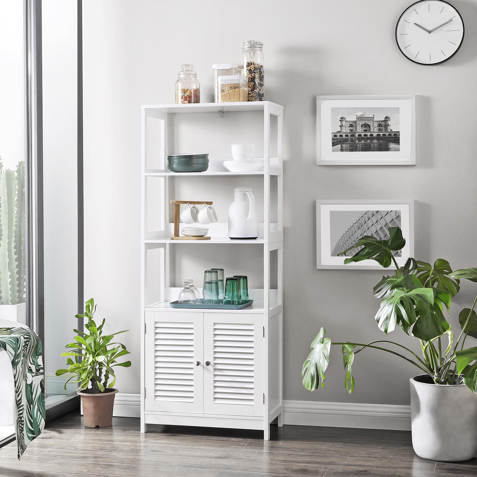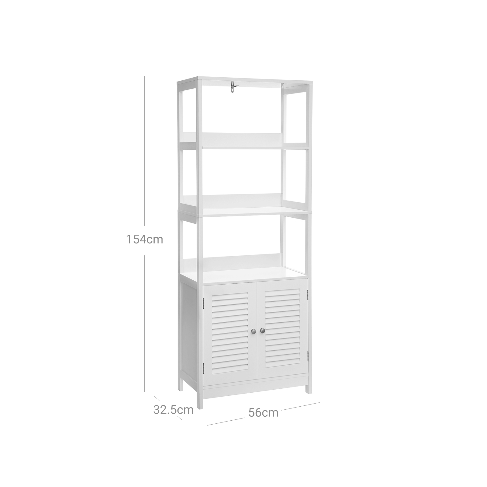 There is nothing better than wrapping yourself in a cozy towel after a hot bubble bath and applying fragrant lotion. This storage cabinet offers you plenty of storage space for your bathroom accessories. Versatile storage options Care products and bath salts fit perfectly on the open shelves. Cleaning products and other items are best hidden behind the double doors. Place a scented candle on the top shelf to give your bathroom a romantic atmosphere. A real all-rounder More than just a bathroom cabinet! This piece of furniture also fits in your kitchen to store your microwave and pots, and in your living room to hold books and picture frames. Or use this cabinet in the hallway to store keys and wallets within easy reach. What’s your plan? Product details: – Color: Matt white – Material: E1 class MDF (medium density fiberboard) – Size: 60 x 32.5 x 154 cm (L x W x H) – Weight: 20.3 kg – Max. total static load capacity: 20 kg Scope of delivery: – 1 x bathroom cabinet – 1 x accessory pack – 1 x anti-tip device – 1 x instructions (DE, EN, FR, ES, IT) VASAGLE Notes:- Please secure this product to the wall using the included anti-tip device to ensure safe use. – For safety reasons, children are not allowed to climb on or play with the product. – If you want to place your microwave oven on this shelf, you should measure it first to make sure that the microwave oven fits.