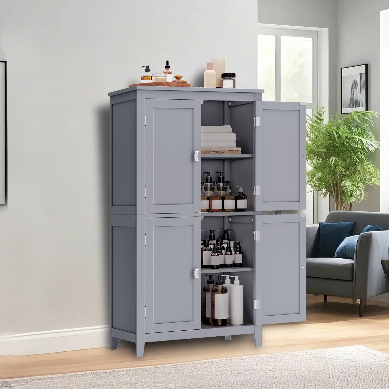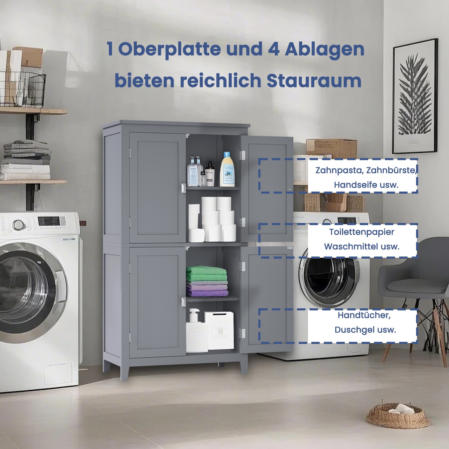 Bathroom cabinet, bathroom cabinet, kitchen cabinet with 4 doors, adjustable shelves, 30 x 60 x 110 cm, classic white