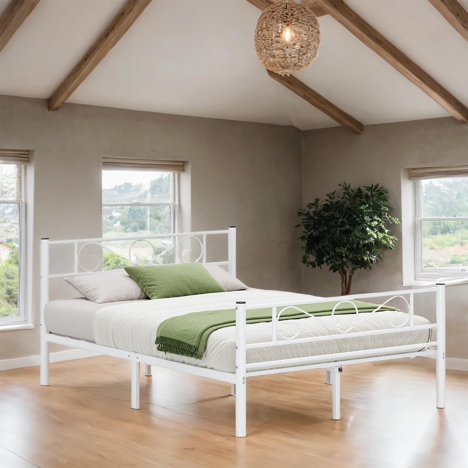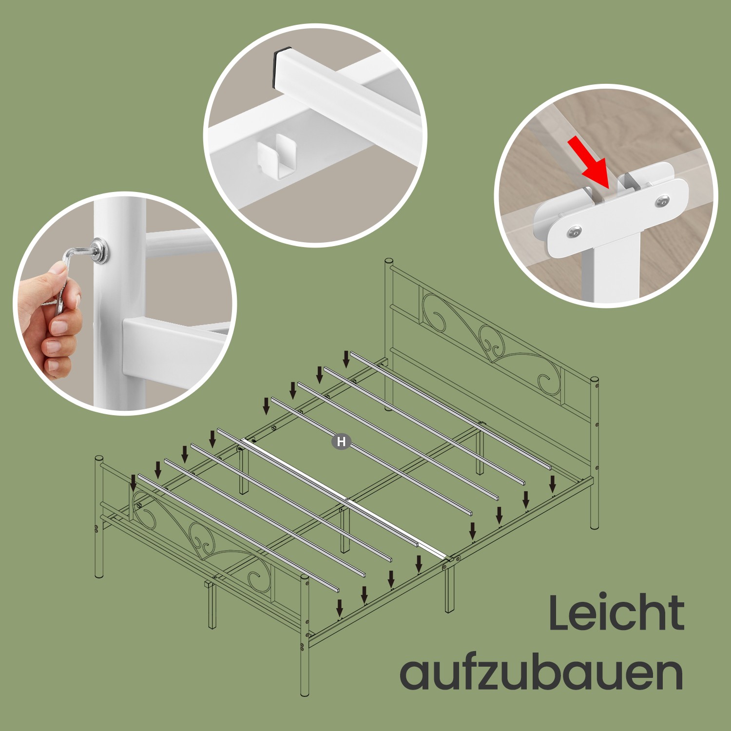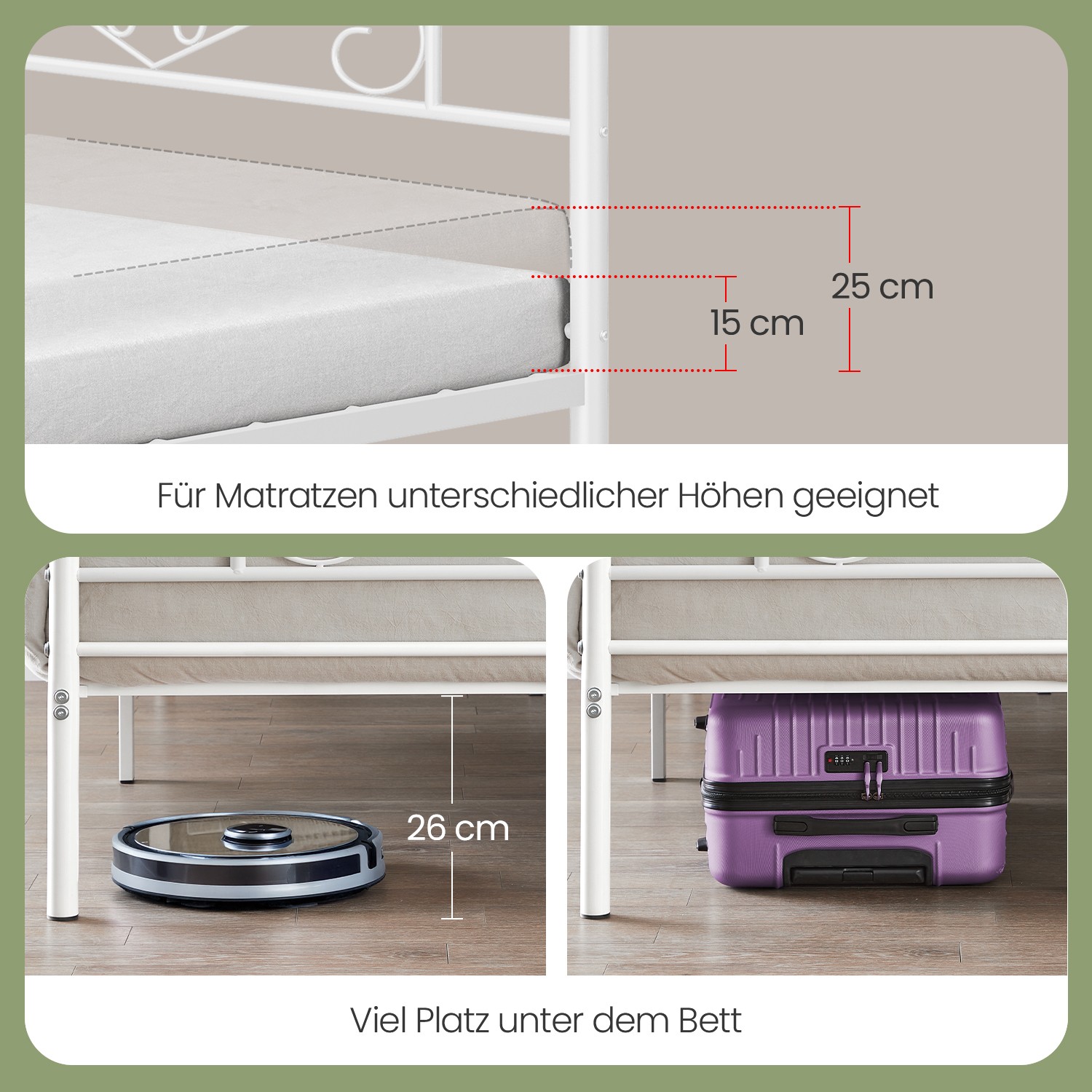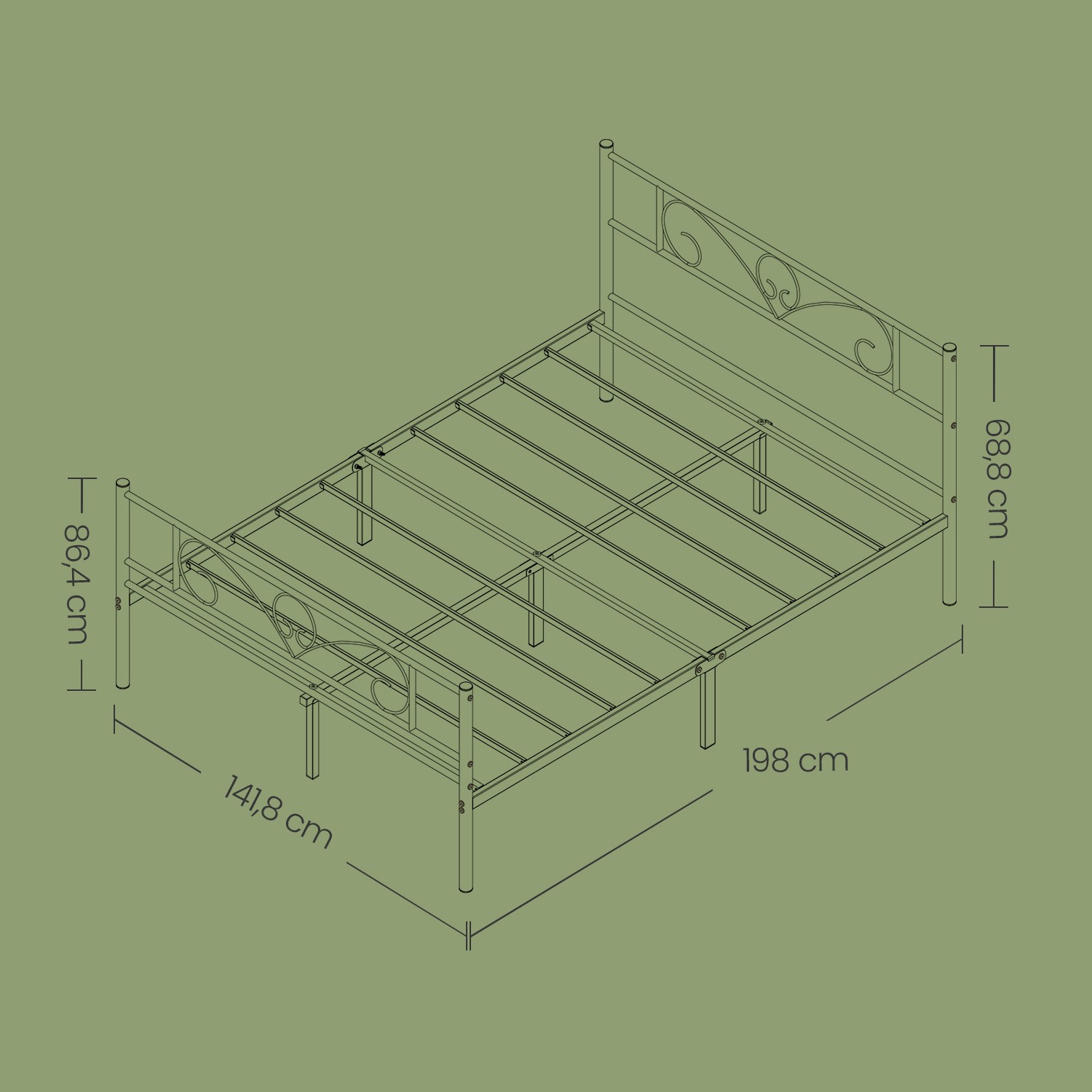 No more insomnia – sweet dreams await: The difference between a sleepless night and a night full of sweet dreams often comes down to the bed frame and mattress that support you throughout the night. As you make your bed, so you must lie in it! Highlights of this VASAGLE metal bed frame: – No box spring required; this bed frame supports your mattress directly. – No tools are required for assembly, everything is included in the package! – A durable metal frame, 11 metal crossbars, and 9 metal legs ensure that you lie securely throughout the night. – The attractive white finish and simple design add a modern charm to your room. Product details: – Color: White – Material: Powder-coated metal – Size: 198 x 141.8 x 86.4 cm (L x W x H) – Weight: 19.8 kg – Max. static load capacity: 225 kg Scope of delivery:- 1 x bed frame – 1 x accessory pack – 1 x instructions (DE, EN, ES, FR, IT) VASAGLE notes: – Children must not stick their heads into the gaps between the metal tubes. – Make sure that all parts and screws are securely fastened before use. – A mattress is not included in the delivery.