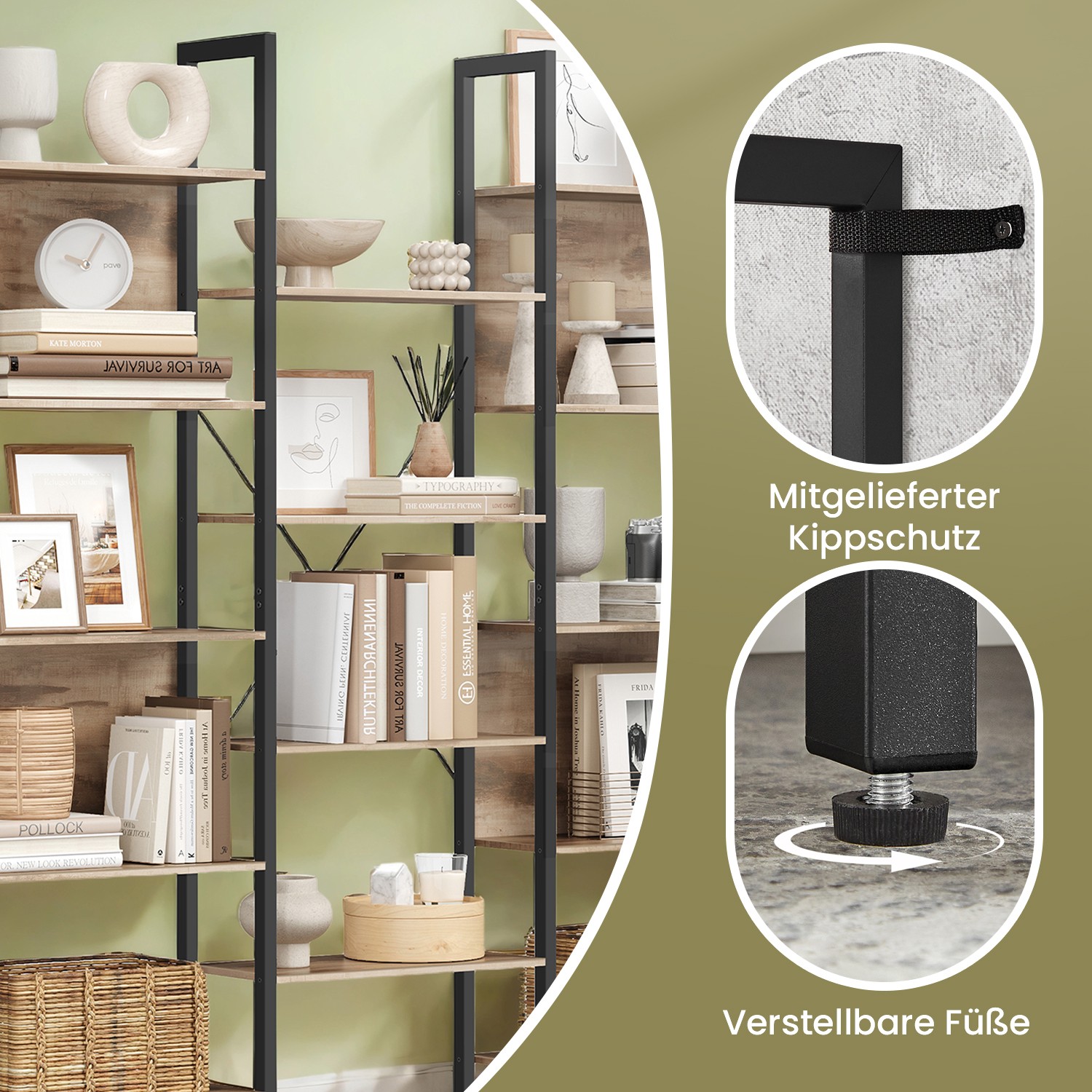 VASAGLE Bookshelf, ladder shelf, 14 shelves, metal frame, for living room, study, office, industrial design, 158 x 24 x 166 cm, vintage brown-black LLS107B01