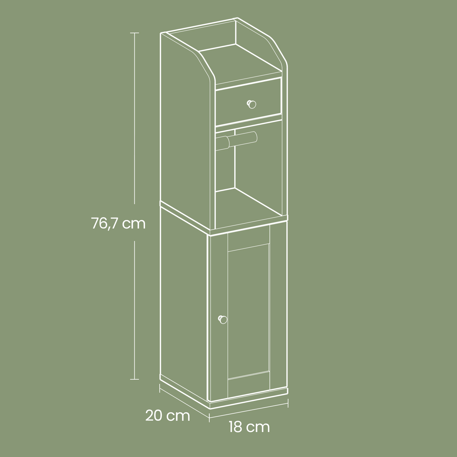 Product details: – Color: White – Material: MDF (medium-density fiberboard) – Dimensions: 20 x 18 x 76.7 cm (D x W x H) – Weight: 5.2 kg – Max. static load capacity of top shelf: 5 kg Scope of delivery: – 1 x storage cabinet – 1 x accessory pack – 1 x instructions VASAGLE Notes: – Please secure this product to the wall using the included anti-tip device to ensure safe use.