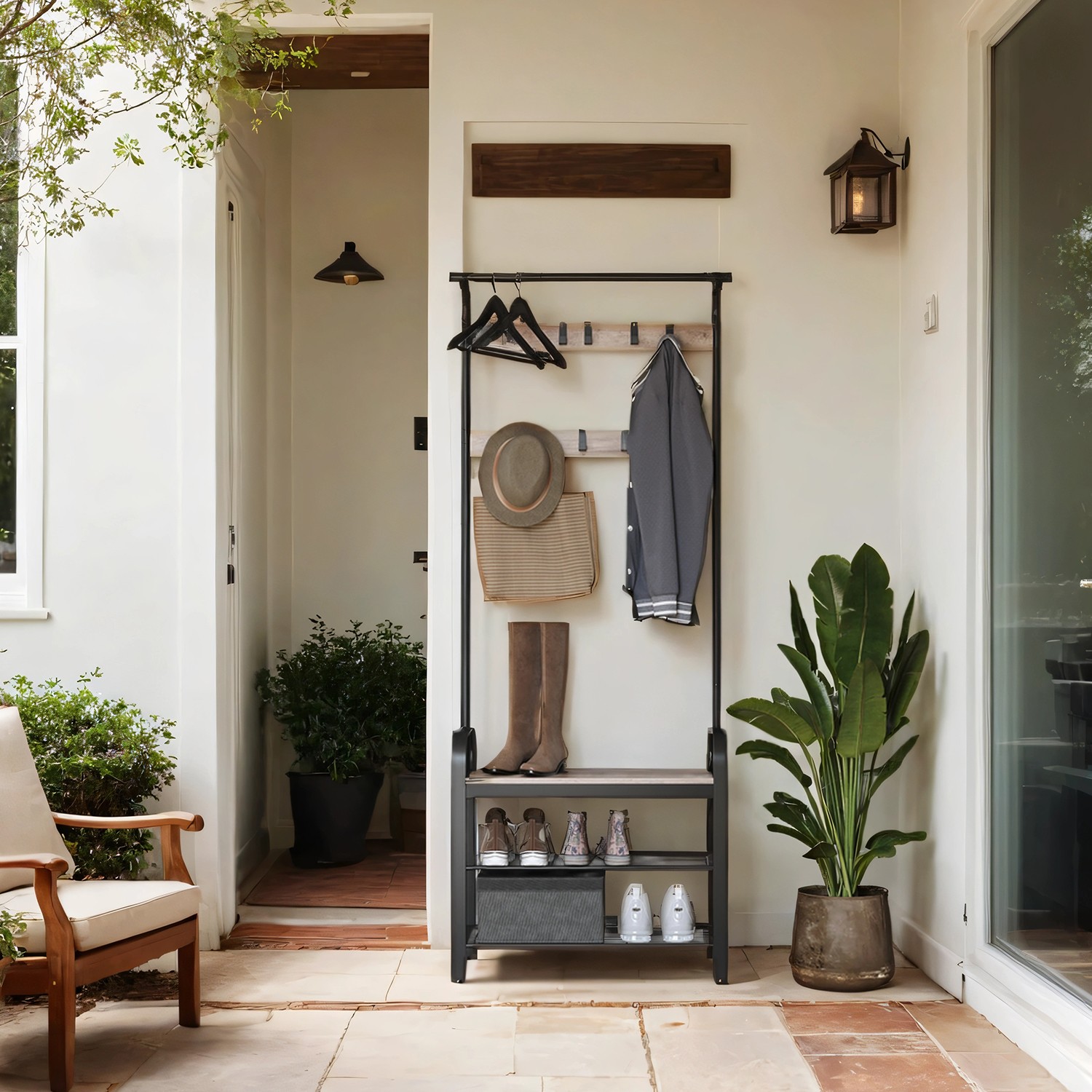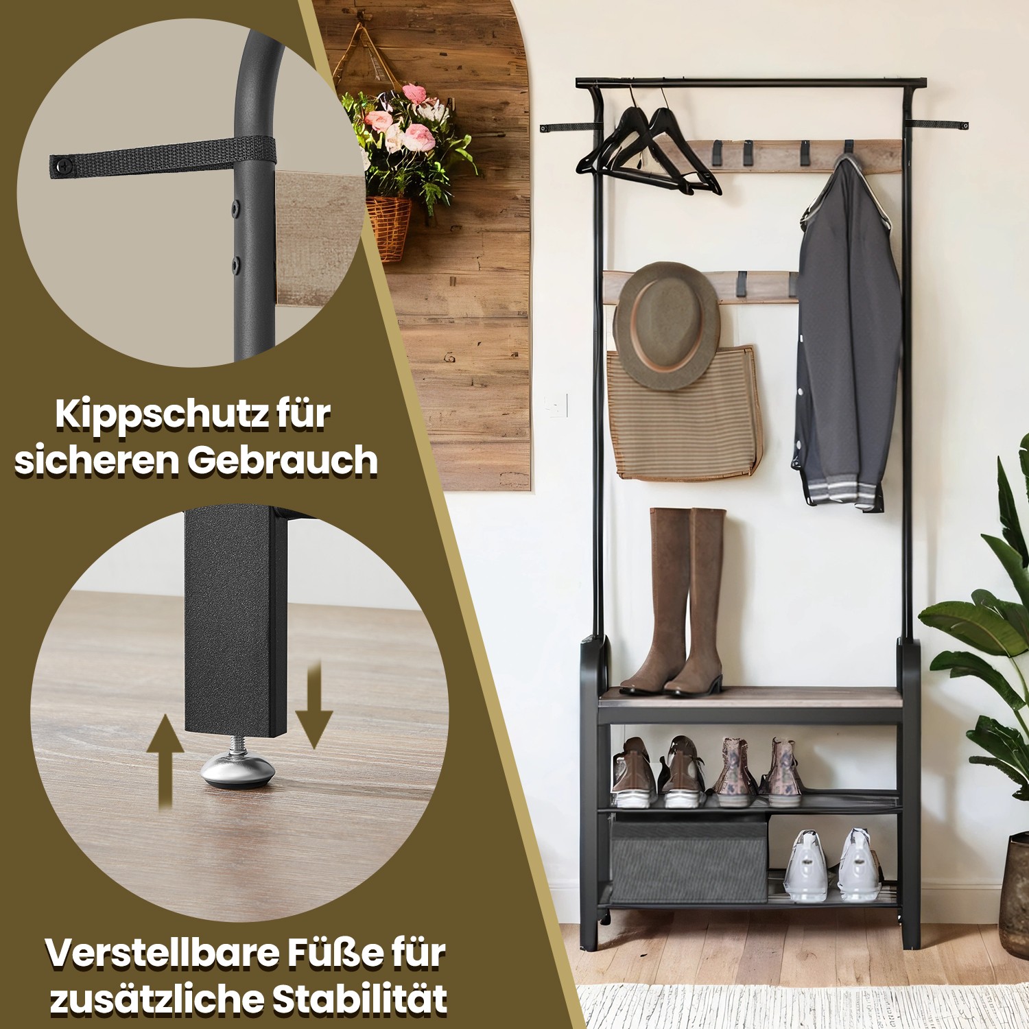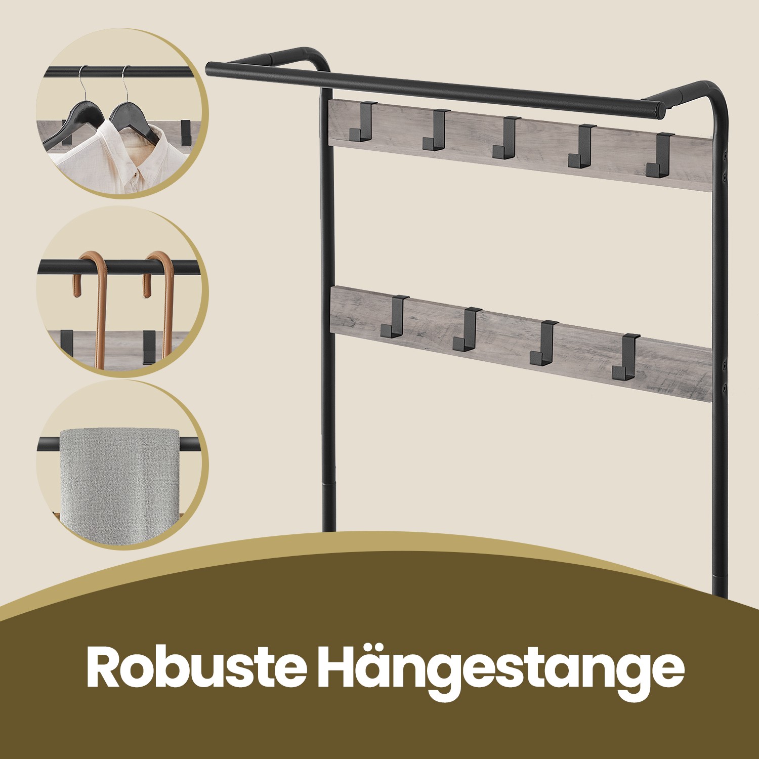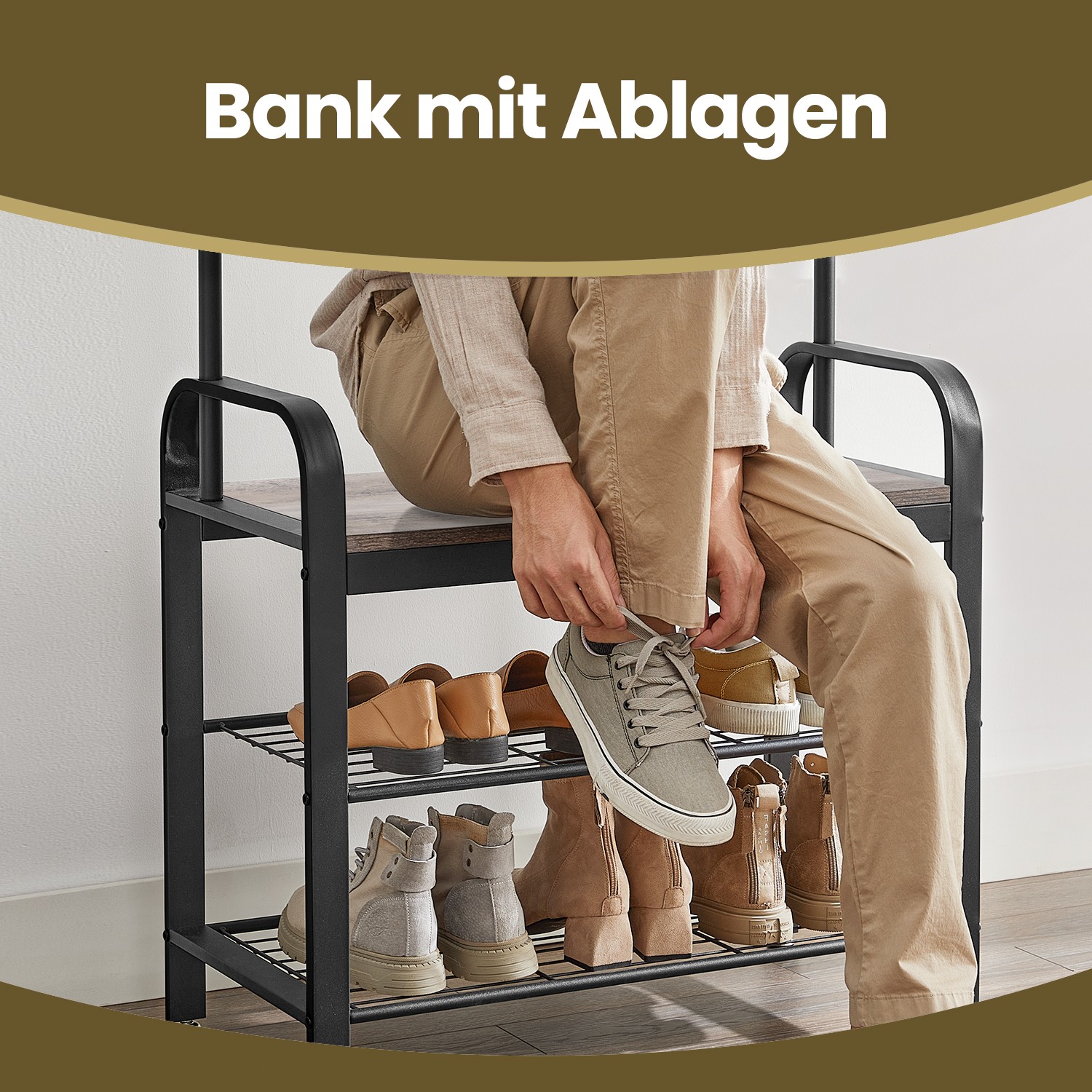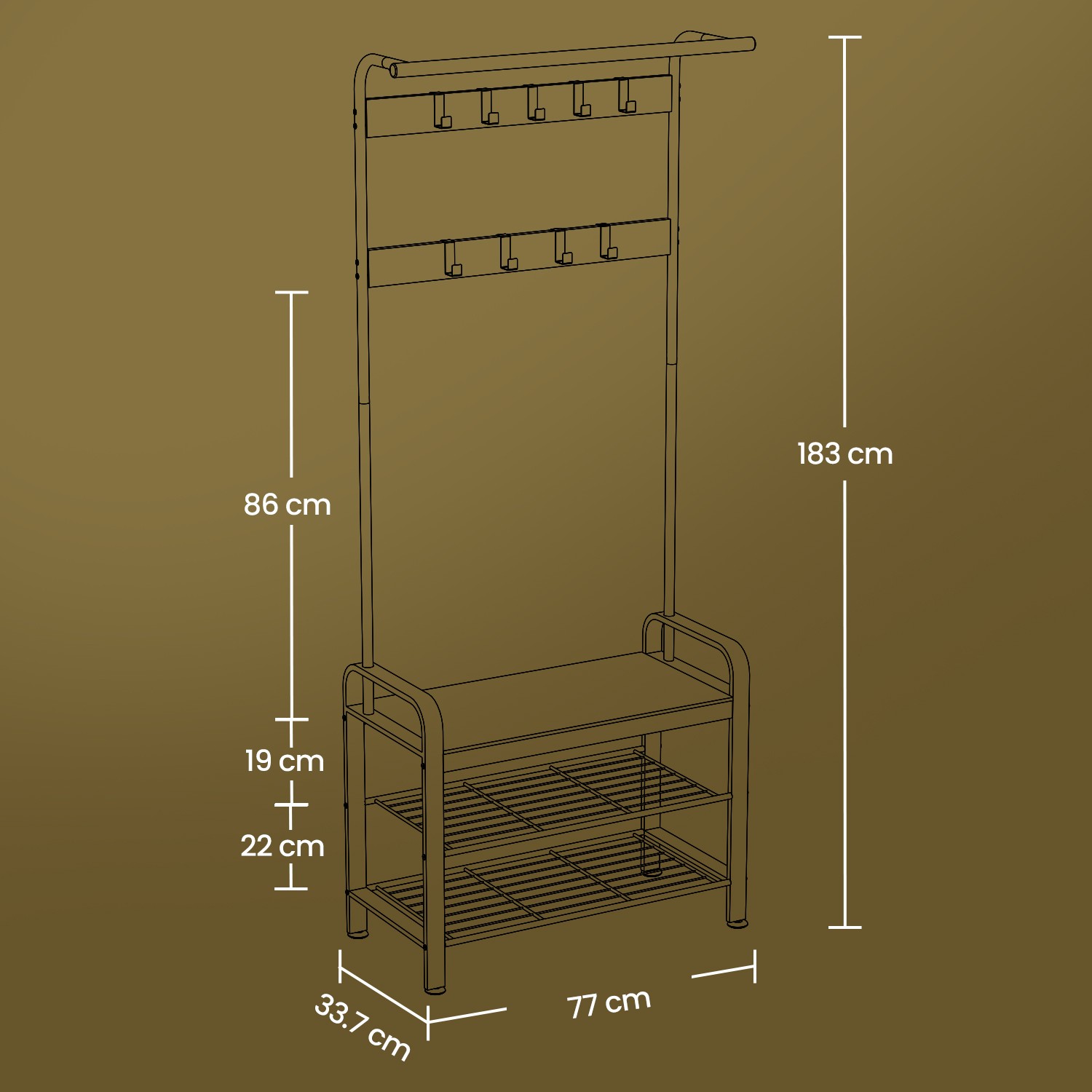 Product details: – Color: Greige-Black – Material: Chipboard, steel – Size: 72 x 33.7 x 183 cm (L x W x H) – Weight: 9.8 kg – Max. static load capacity per hook: 3 kg – Max. static load capacity of the seat: 80 kg Scope of delivery: – 1 x coat rack – 1 x accessory bag – 1 x anti-tip device – 1 x instructions (DE, EN, FR, IT, ES) VASAGLE Notes: – For safety reasons, children are not allowed to climb on or play with the product.- The maximum static load capacity of the seat is 80 kg, and that of the hooks is 3 kg. Please do not exceed this maximum weight. – Please attach this product to the wall using the included anti-tip device to ensure safe use. Product description