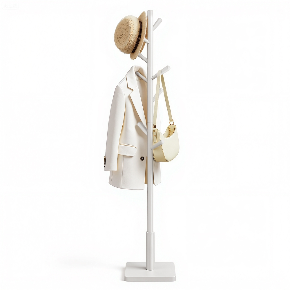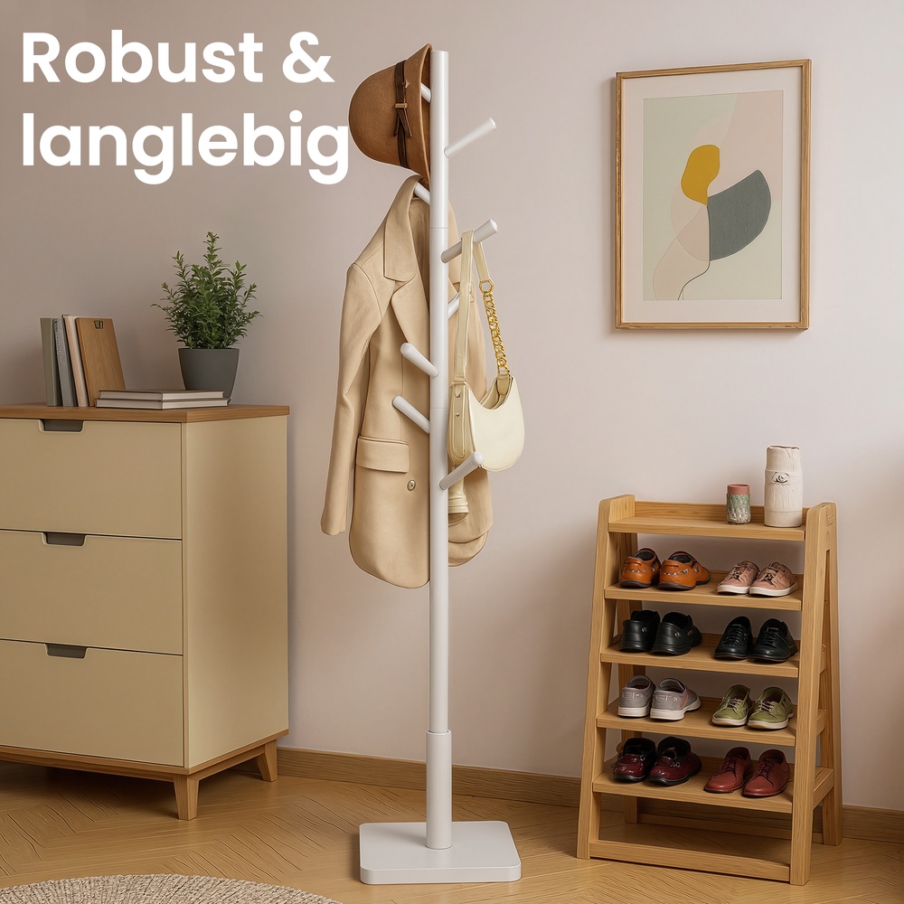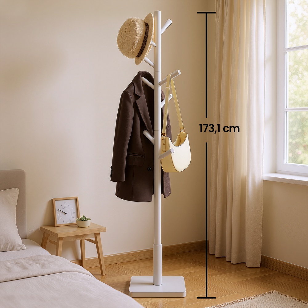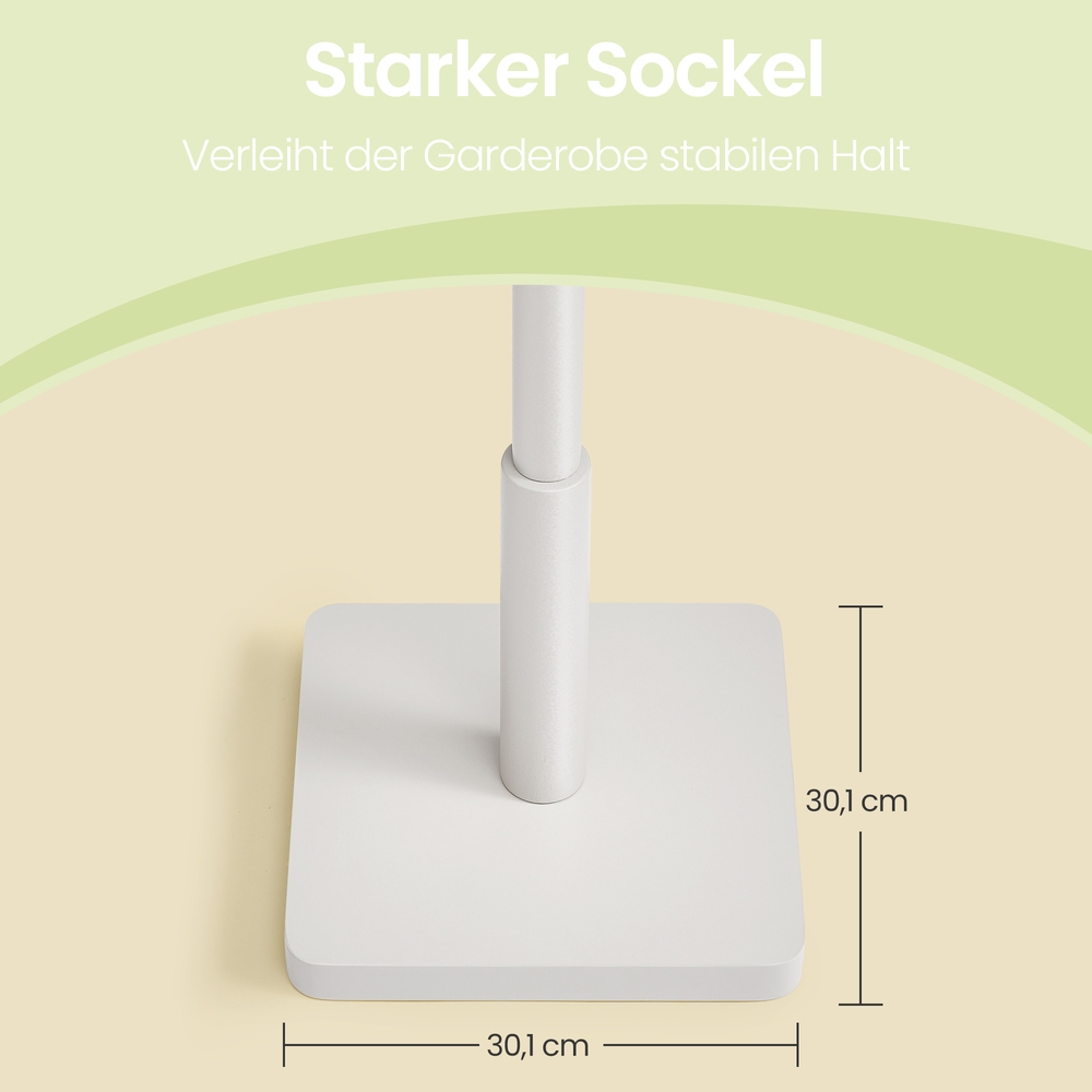 Applause for this everyday helper With this coat rack (30 x 30 x 175 cm), you can keep the items you need when leaving the house within easy reach. Clear piles of clothes off the sofa, hang them neatly on the coat rack, and transform your home back into a feel-good zone! A breath of fresh air This white coat rack adds a modern touch to your entrance area, bedroom, or office. Your clothes, hats, bags, and even umbrellas will fit perfectly on the hooks. Product details: – Color: White – Material: Rubberwood (rail and hooks), MDF (medium-density fiberboard) (base) – Size: 30 x 30 x 175 cm (L x W x H) – Weight: 3.9 kg – Max. total static load capacity: 20 kg Scope of delivery:- 1 x coat rack – 1 x instructions (DE, EN, FR, ES, IT) VASAGLE notes: – Do not expose the product to direct sunlight for long periods of time. – Hang your items so that the weight is evenly distributed to prevent the product from tipping over.