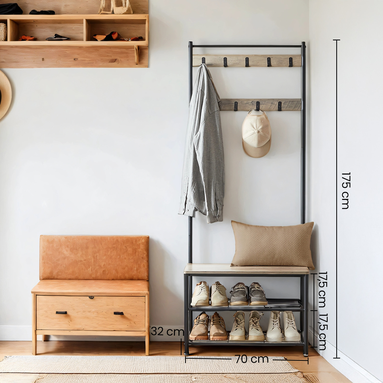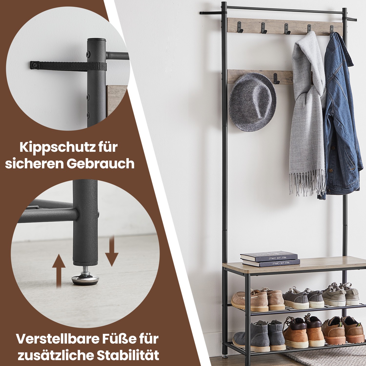 Product details: – Color: Greige-Black – Material: Chipboard, steel – Size: 70 x 32 x 175 cm (L x W x H)- Seat size: 70 x 30 cm (L x W)- Weight: 7.8 kg- Max. static load capacity per hook: 3 kg- Max. static load capacity of the seat: 80 kgScope of delivery:- 1 x coat rack – 1 x accessory pack – 1 x anti-tip device – 1 x instructions (DE, EN, ES, FR, IT) VASAGLE notes: – Please attach this product to the wall using the anti-tip device provided to ensure safe use. – The bar at the top is not intended for hanging items. Please hang clothes or other items on the hooks. – The maximum static load capacity of the seat is 80 kg. Please do not exceed this maximum weight.
