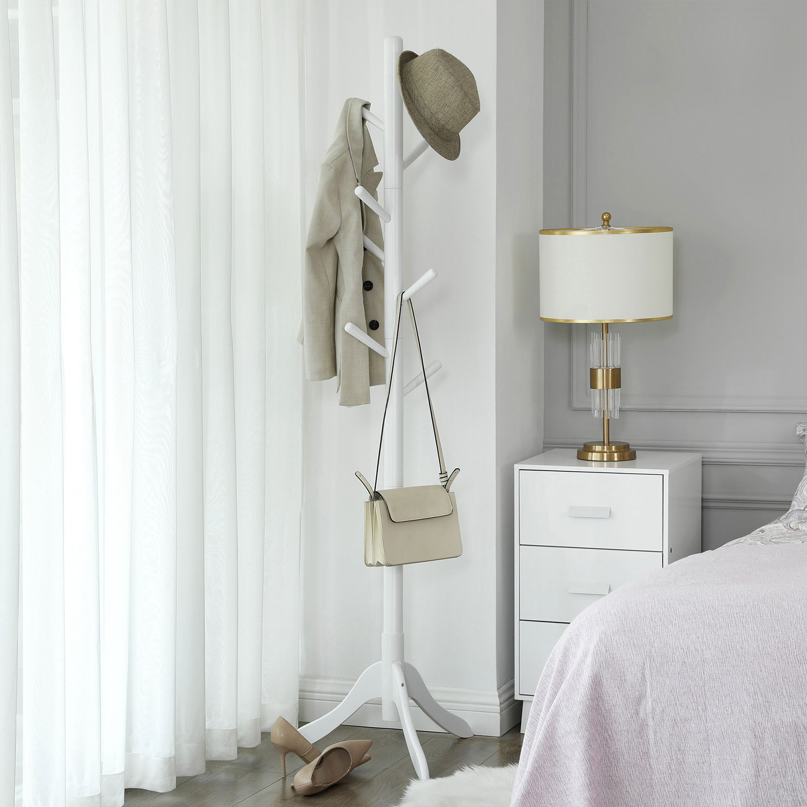 This freestanding coat rack is all you need to make you happy A tidy home simply makes you happy. Get this coat rack from VASAGLE and take the first step towards a happier home. Clear the piles of clothes off the sofa and turn your home back into a feel-good zone. Highlights of this coat rack at a glance: Supported by 3 feet, this coat rack is stable and won’t tip over when you hang your jacket on a hook. It is also extremely sturdy and durable. – There are 8 hooks with rounded ends available for you to hang clothes, bags, and other items within easy reach and in good condition. – Assembly will not cause you any headaches: setting up this coat rack is child’s play! Product details:- Color: White – Material: Rubberwood – Size: 57 x 57 x 175 cm (L x W x H) – Length per hook: 12.5 cm – Weight: 2.5 kg – Max. static load capacity per hook: 5 kg – Max. static load capacity in total: 20 kg Scope of delivery:- 1 x coat rack – 1 x instructions (DE, EN, FR, ES, IT) VASAGLE notes: – Do not expose the product to direct sunlight for long periods of time. – The product must not come into contact with sharp objects.