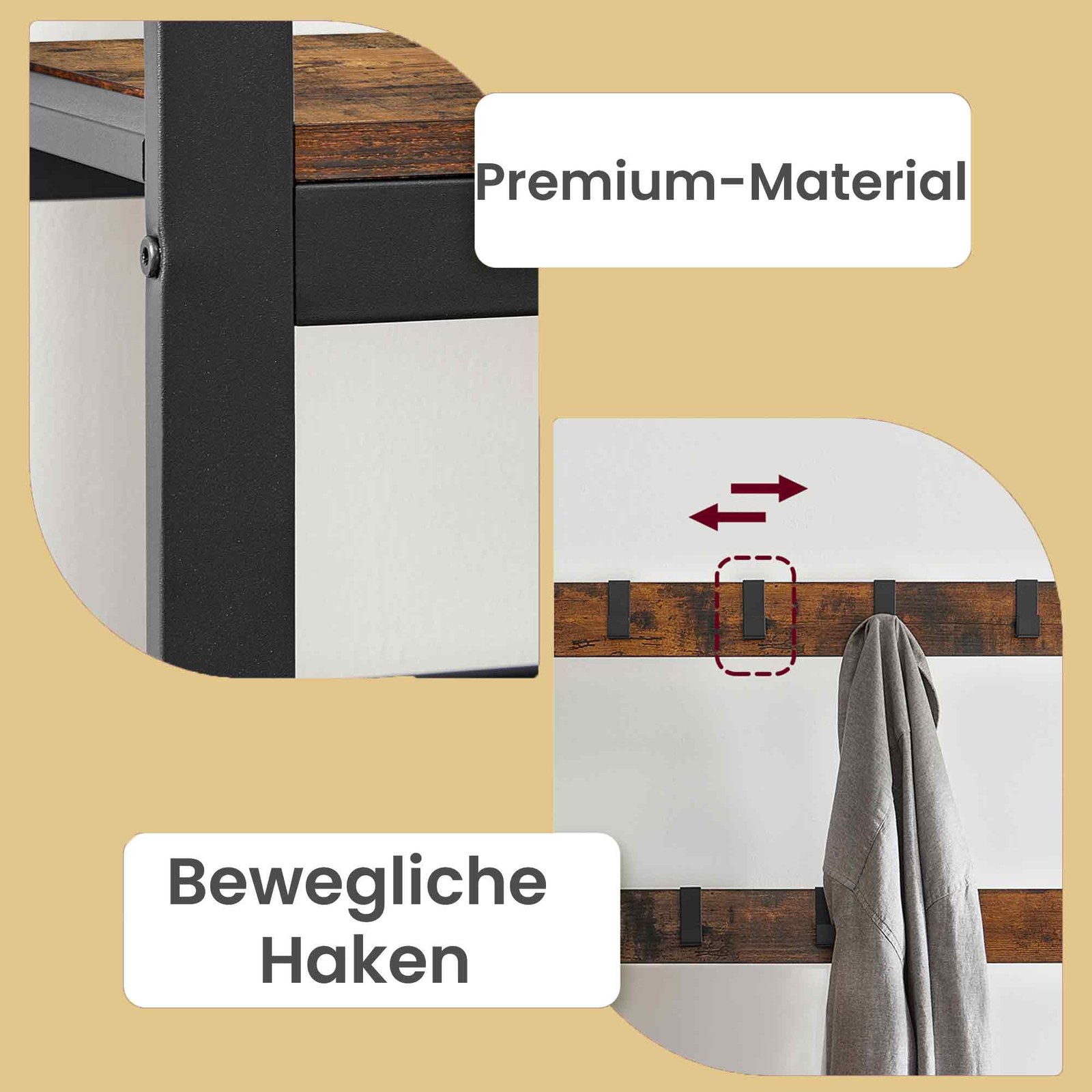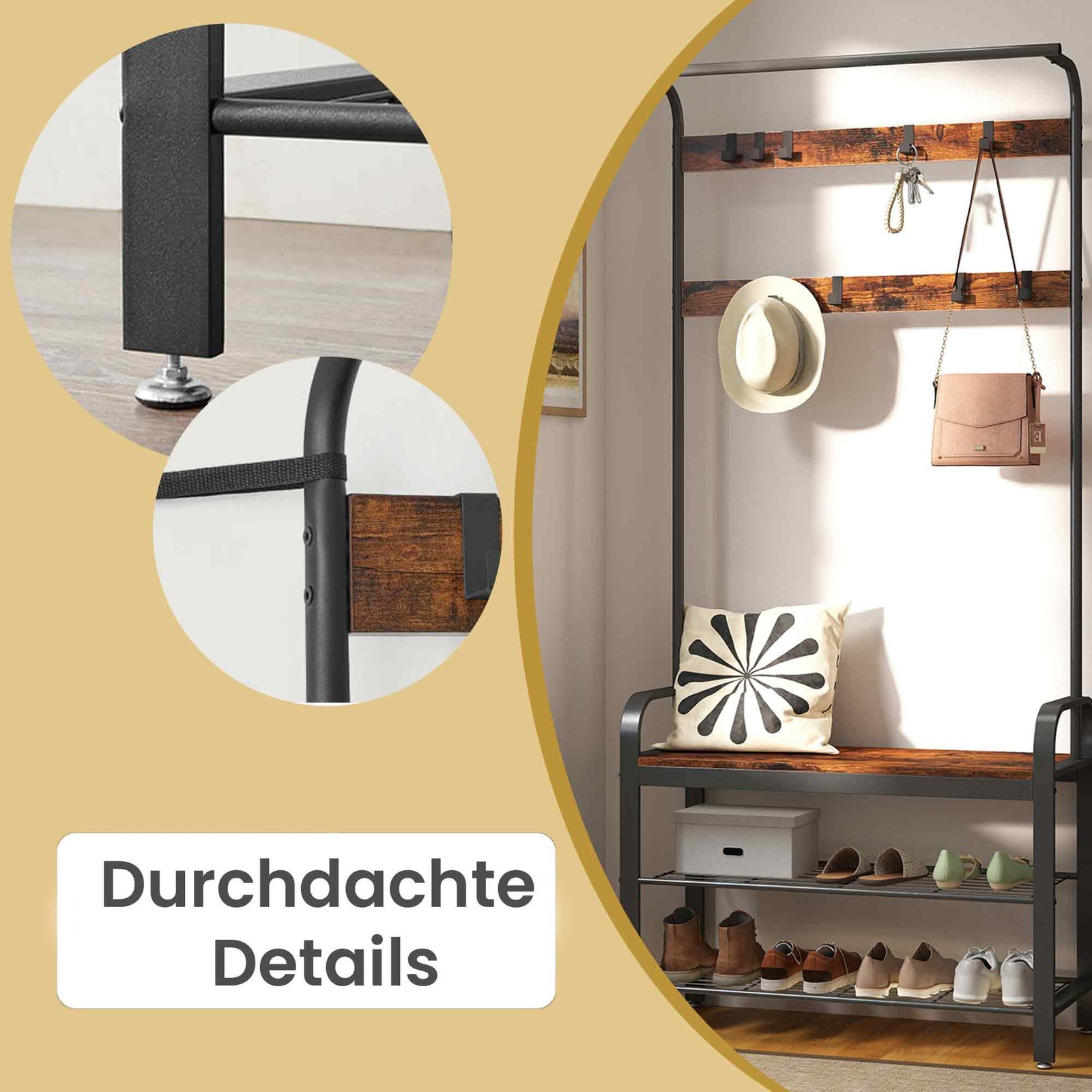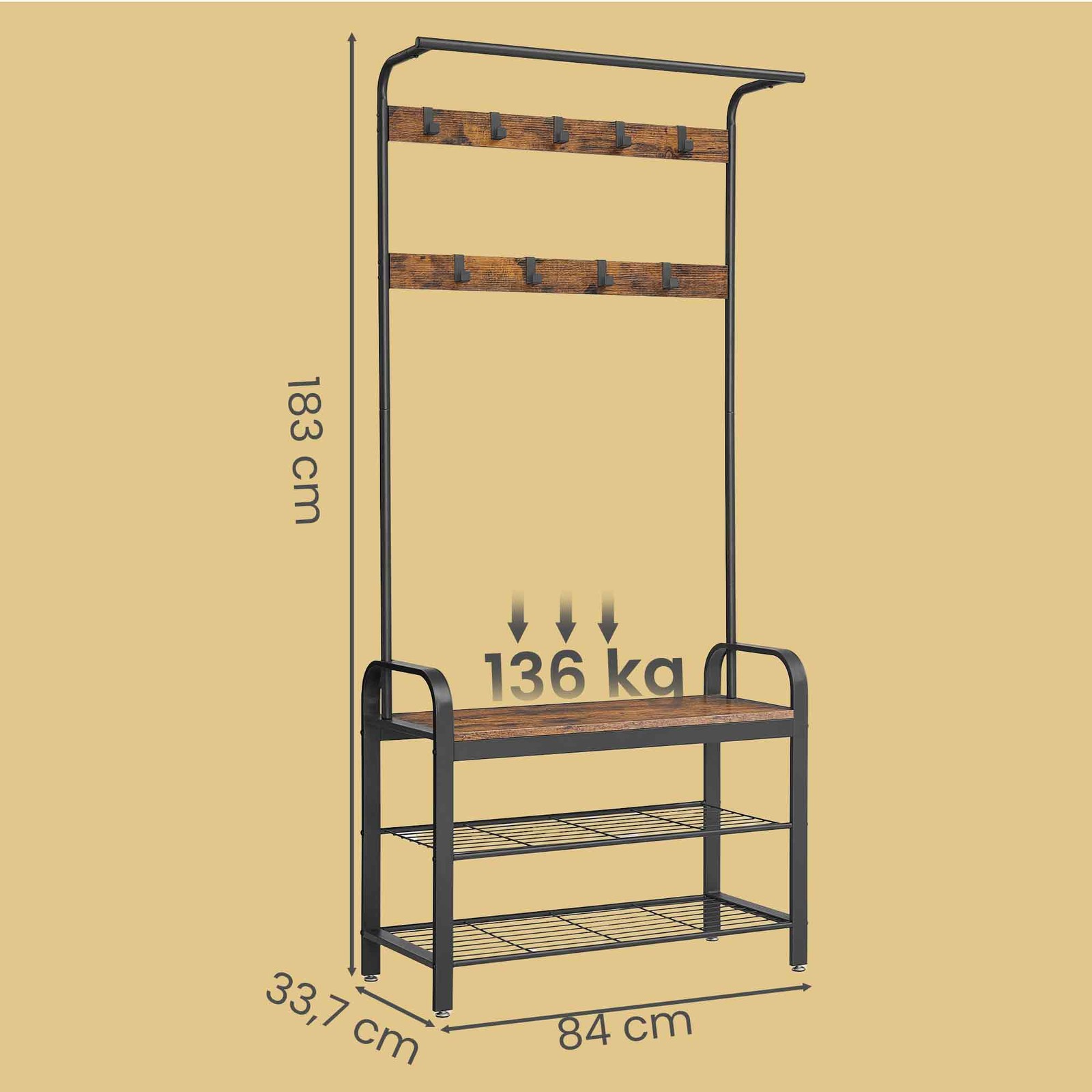Product details: – Color: Vintage brown-black – Material: Chipboard, steel – Size: 84 x 33.7 x 183 cm (L x W x H) – Weight: 11.1 kg – Max. static load capacity per hook: 3 kg – Max. static load capacity of the clothes rail: 10 kg – Max. static load capacity of the seat: 90 kg Scope of delivery: – 1 x coat rack – 1 x anti-tip device – 1 x accessory pack – 1 x instructions VASAGLE Notes: – For safety reasons, children are not allowed to climb on or play with the product.- The maximum static load capacity of the seat is 90 kg, that of the hooks is 3 kg, and the clothes rail can bear a load of up to 10 kg. Please do not exceed this maximum weight. – Please attach this product to the wall using the included anti-tip device to ensure safe use.