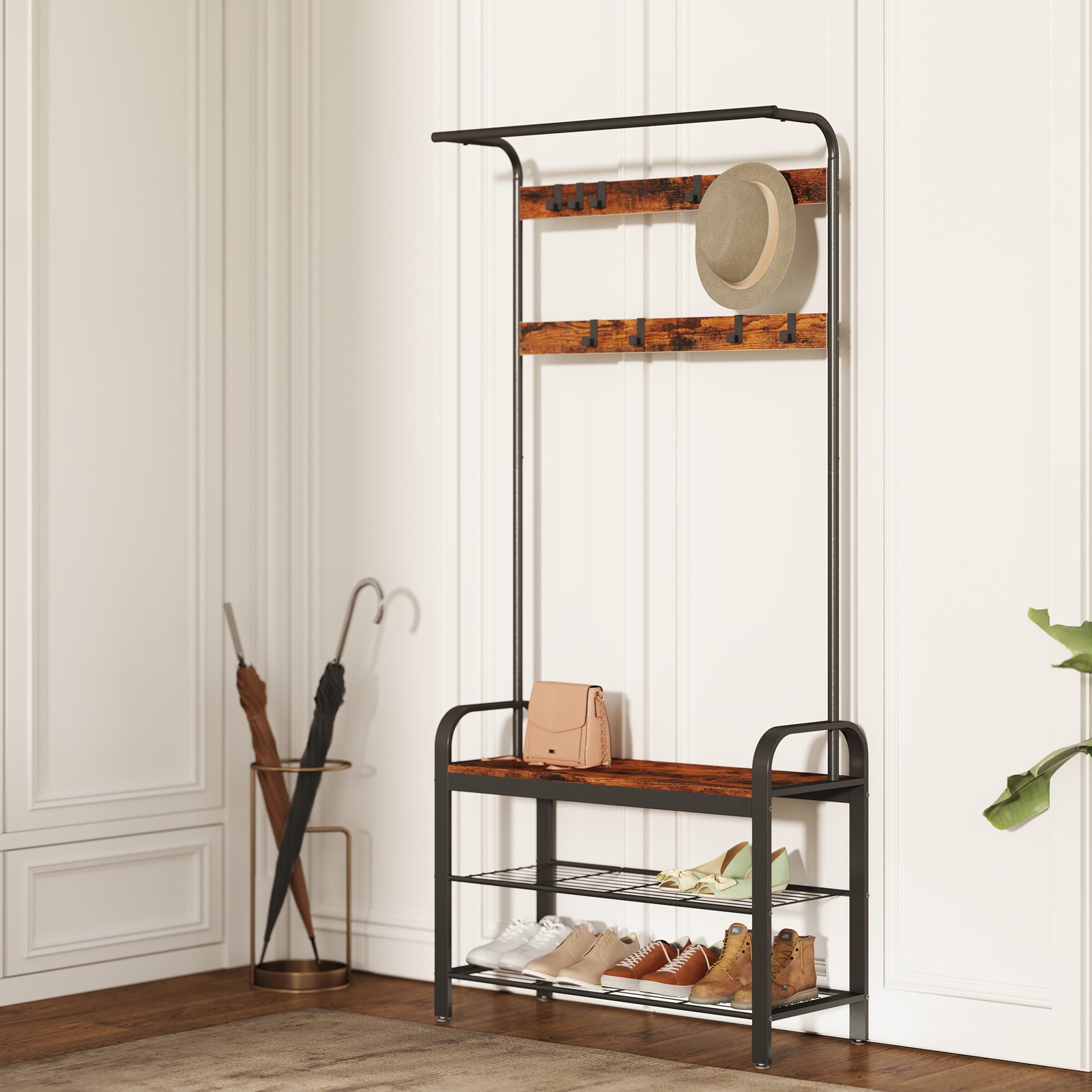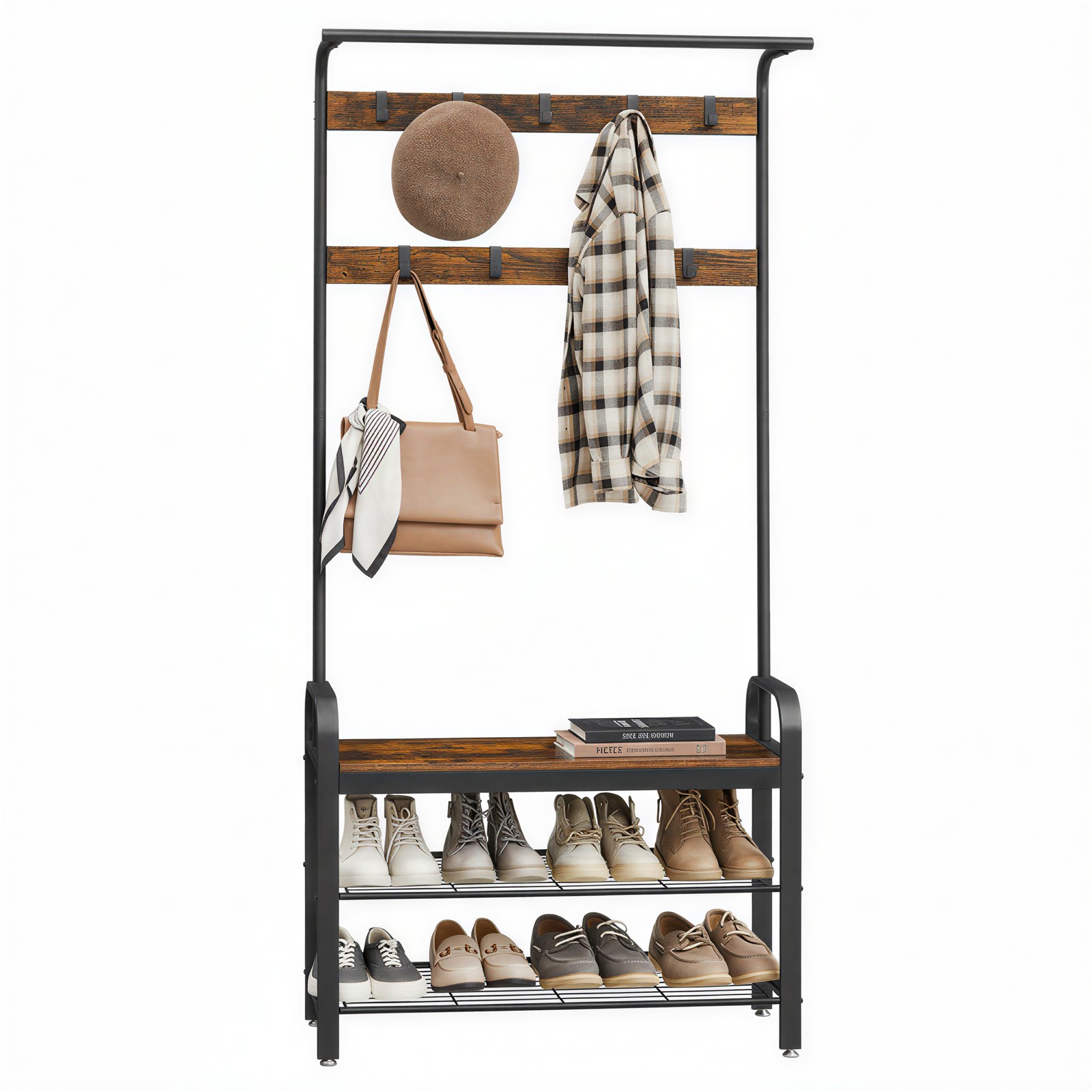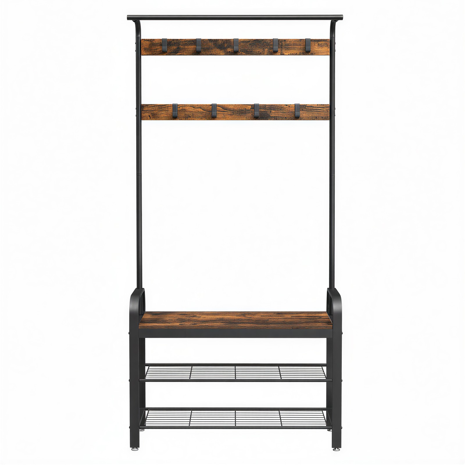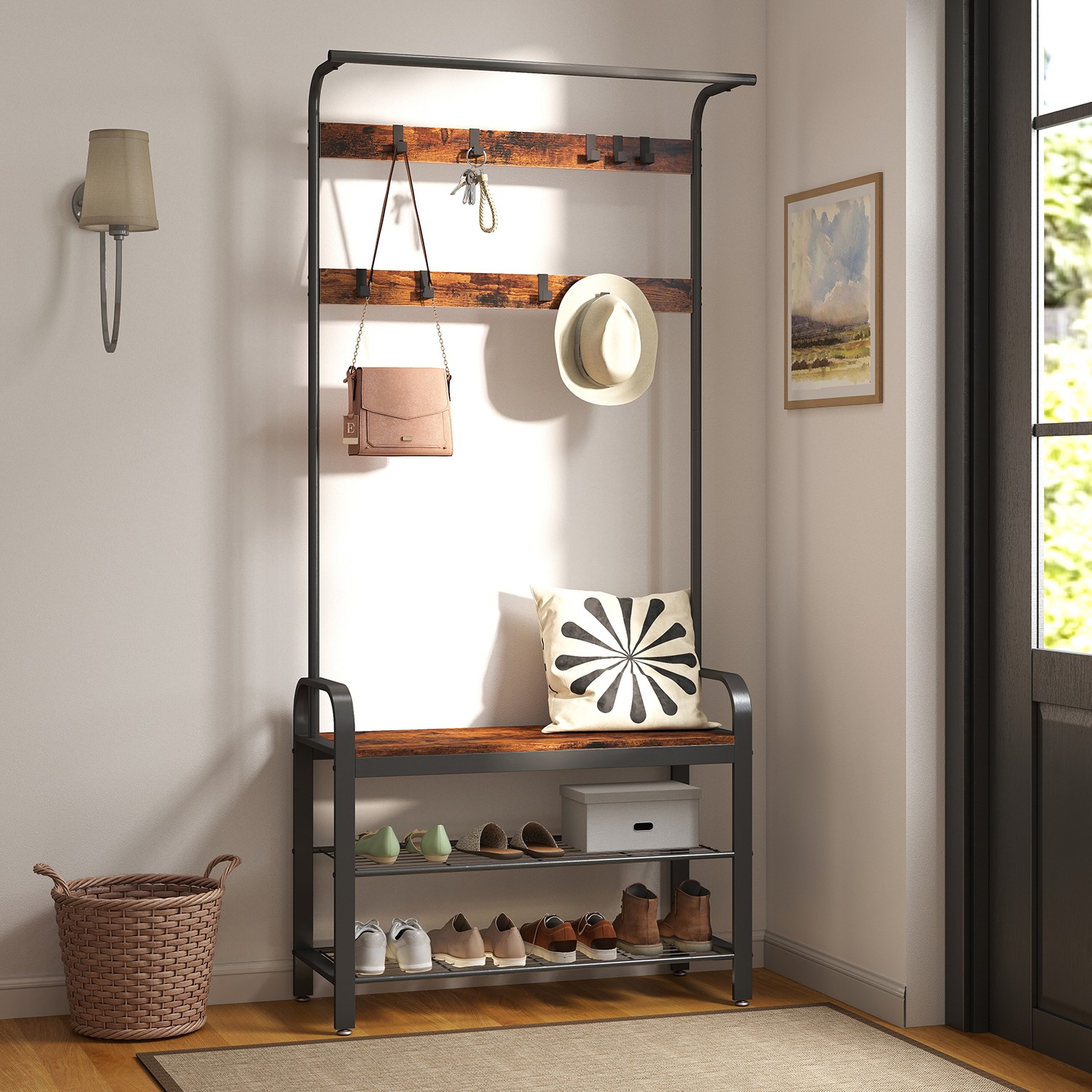 Product details: – Color: Vintage brown-black – Material: Chipboard, steel – Size: 84 x 33.7 x 183 cm (L x W x H) – Weight: 11.1 kg – Max. static load capacity per hook: 3 kg – Max. static load capacity of the clothes rail: 10 kg – Max. static load capacity of the seat: 90 kg Scope of delivery: – 1 x coat rack – 1 x anti-tip device – 1 x accessory pack – 1 x instructions VASAGLE Notes: – For safety reasons, children are not allowed to climb on or play with the product.- The maximum static load capacity of the seat is 90 kg, that of the hooks is 3 kg, and the clothes rail can bear a load of up to 10 kg. Please do not exceed this maximum weight. – Please attach this product to the wall using the included anti-tip device to ensure safe use.
