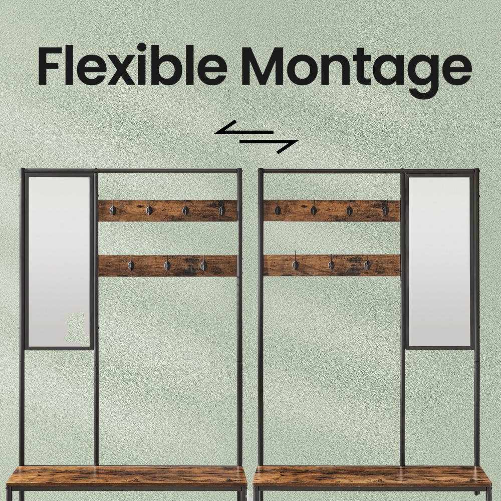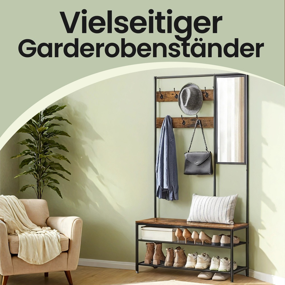 Product details: – Color: Vintage brown-black – Material: Chipboard, steel – Dimensions: 35 x 98 x 180 cm (D x W x H) – Weight: 15.9 kg – Max. static load capacity per hook: 5 kg – Max. static load capacity per wire shelf: 15 kg – Max. static load capacity of the seat: 100 kg Scope of delivery: – 1 x coat rack – 2 x anti-tip devices – 1 x accessory pack – 1 x instruction manual VASAGLE Notes: – For safety reasons, children should not climb on or play with this product. – Please use the included anti-tip device to secure the product to the wall. – The maximum static load capacity of the seat is 100 kg; please do not exceed this.